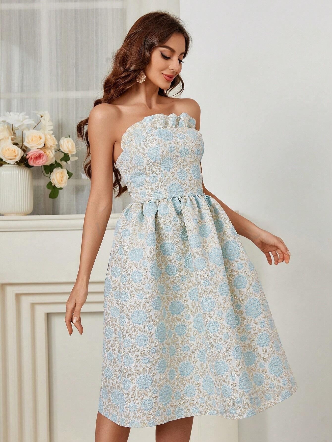 Elevate your evening with Enchanting Elegance: a strapless jacquard dress, perfect for formal events. Designed for a flattering fit, the dress features intricate details and a timeless silhouette. Feel confident and elegant in this stunning party dress.