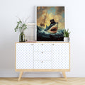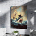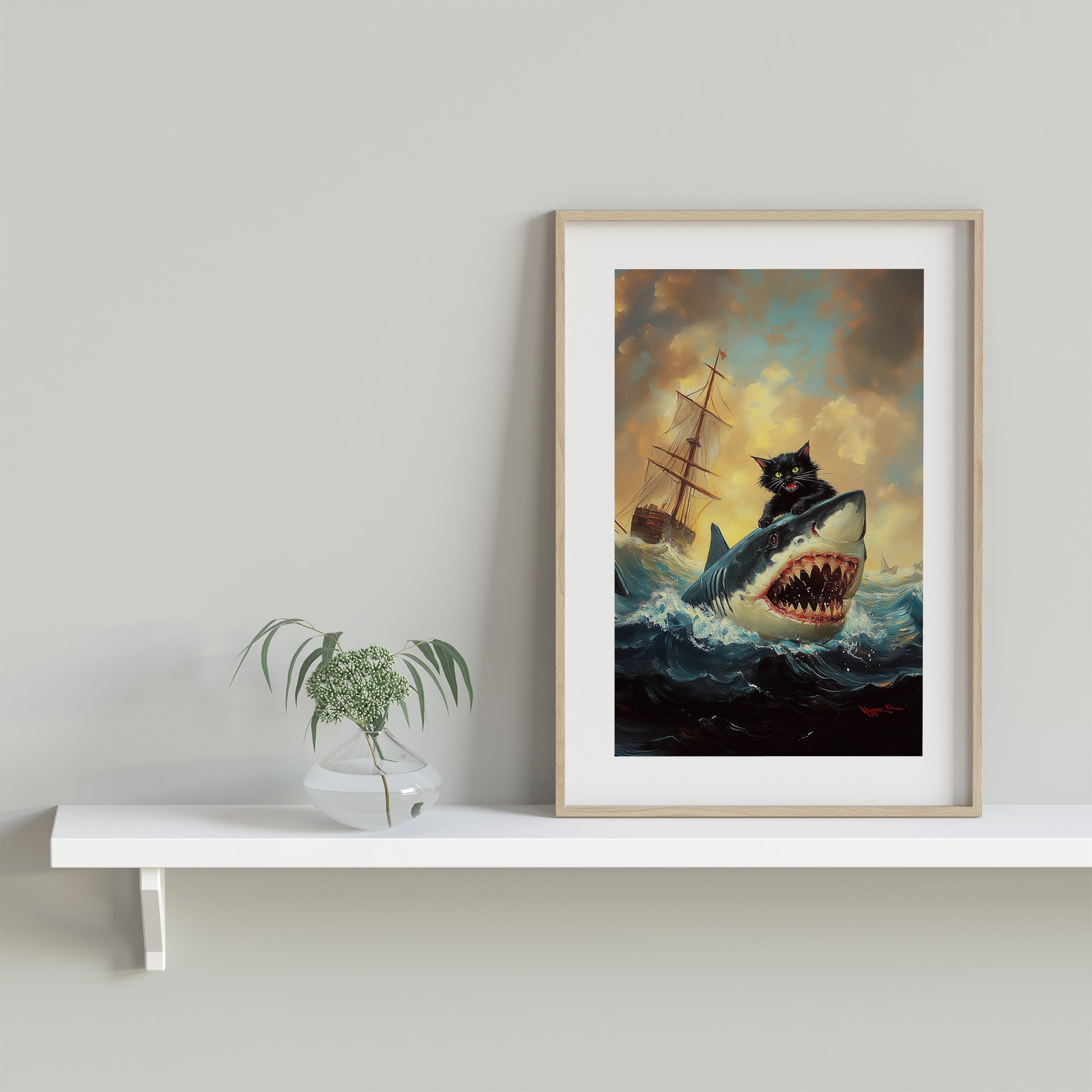 Epic Oil Painting Of A Black Cat Riding A Great White Shark In Ocean