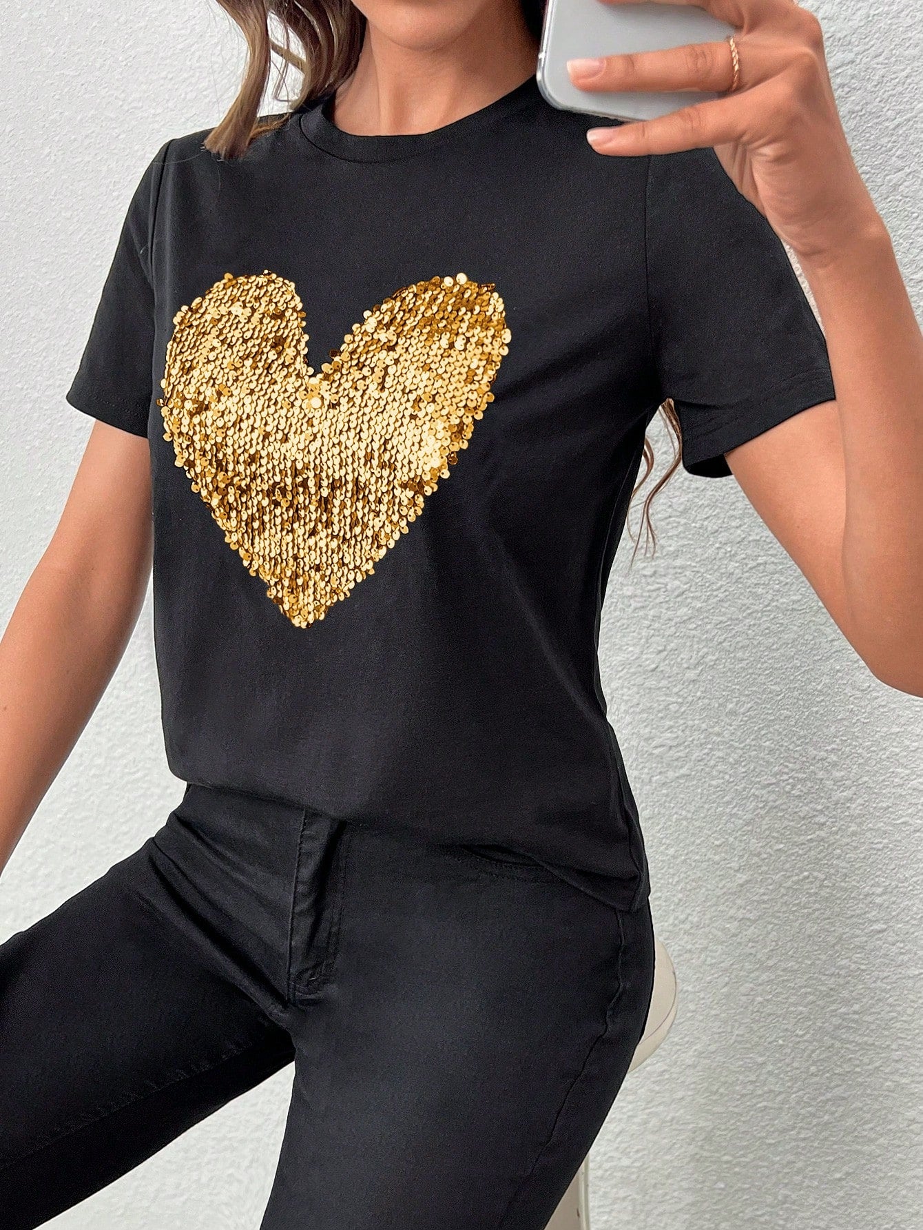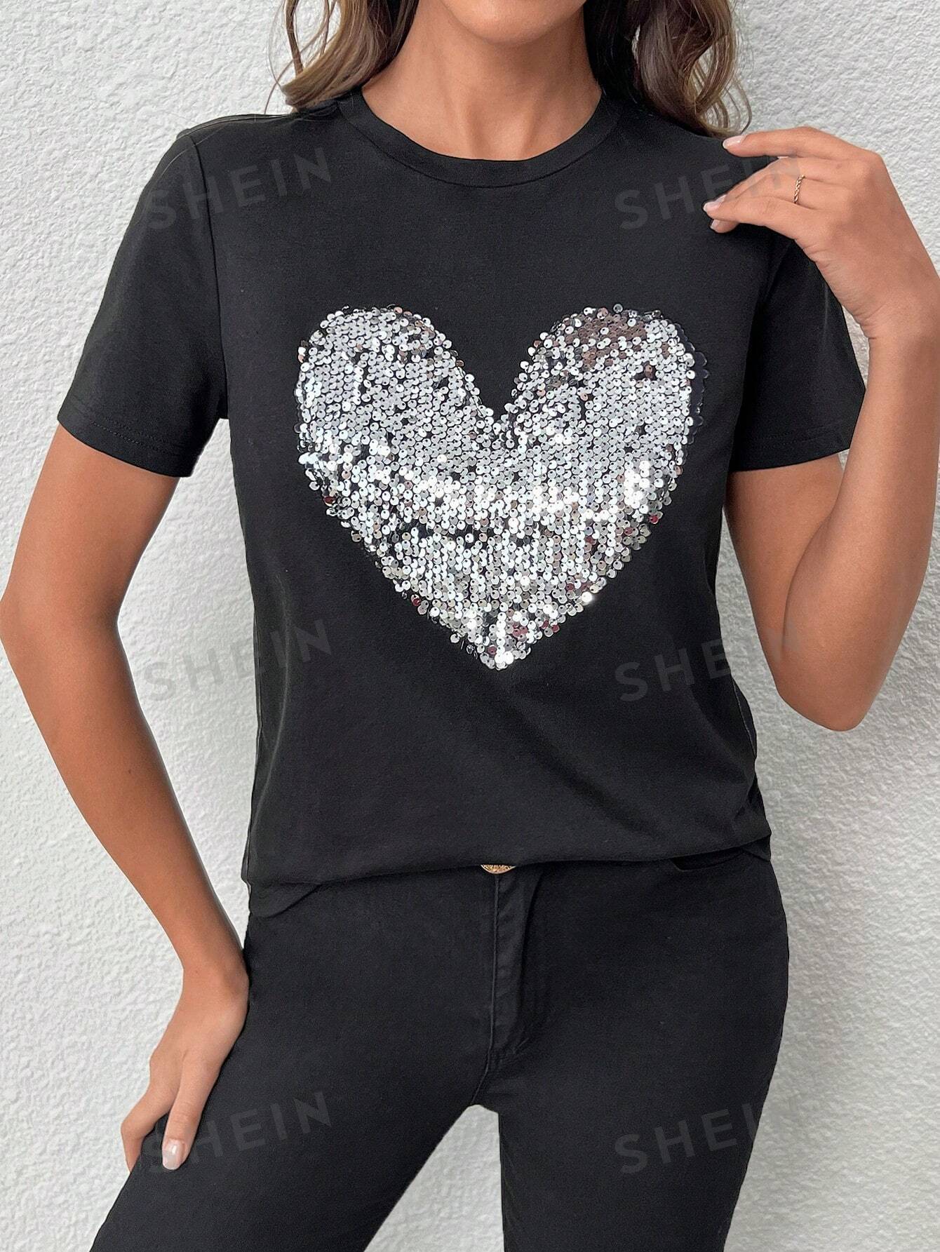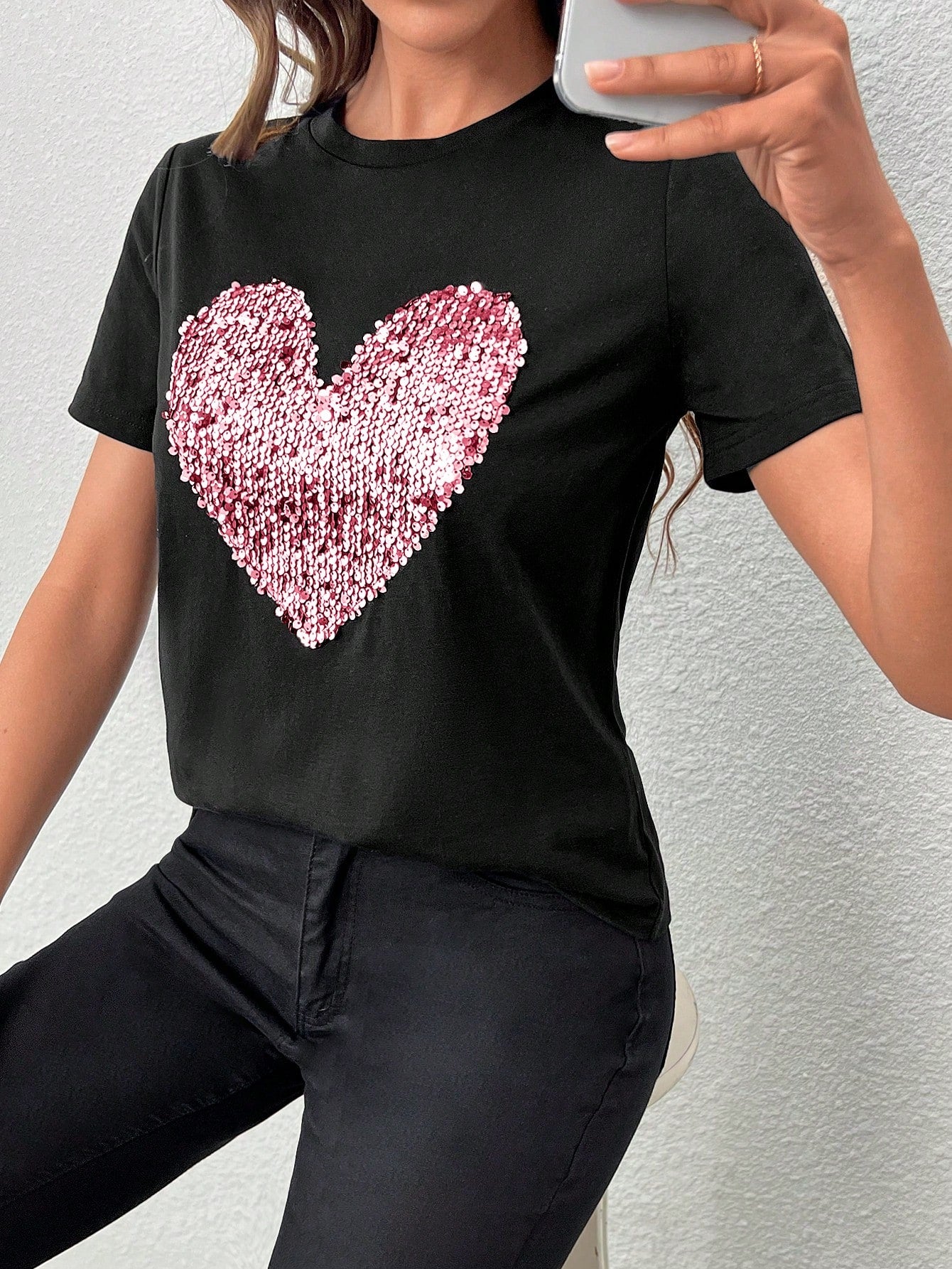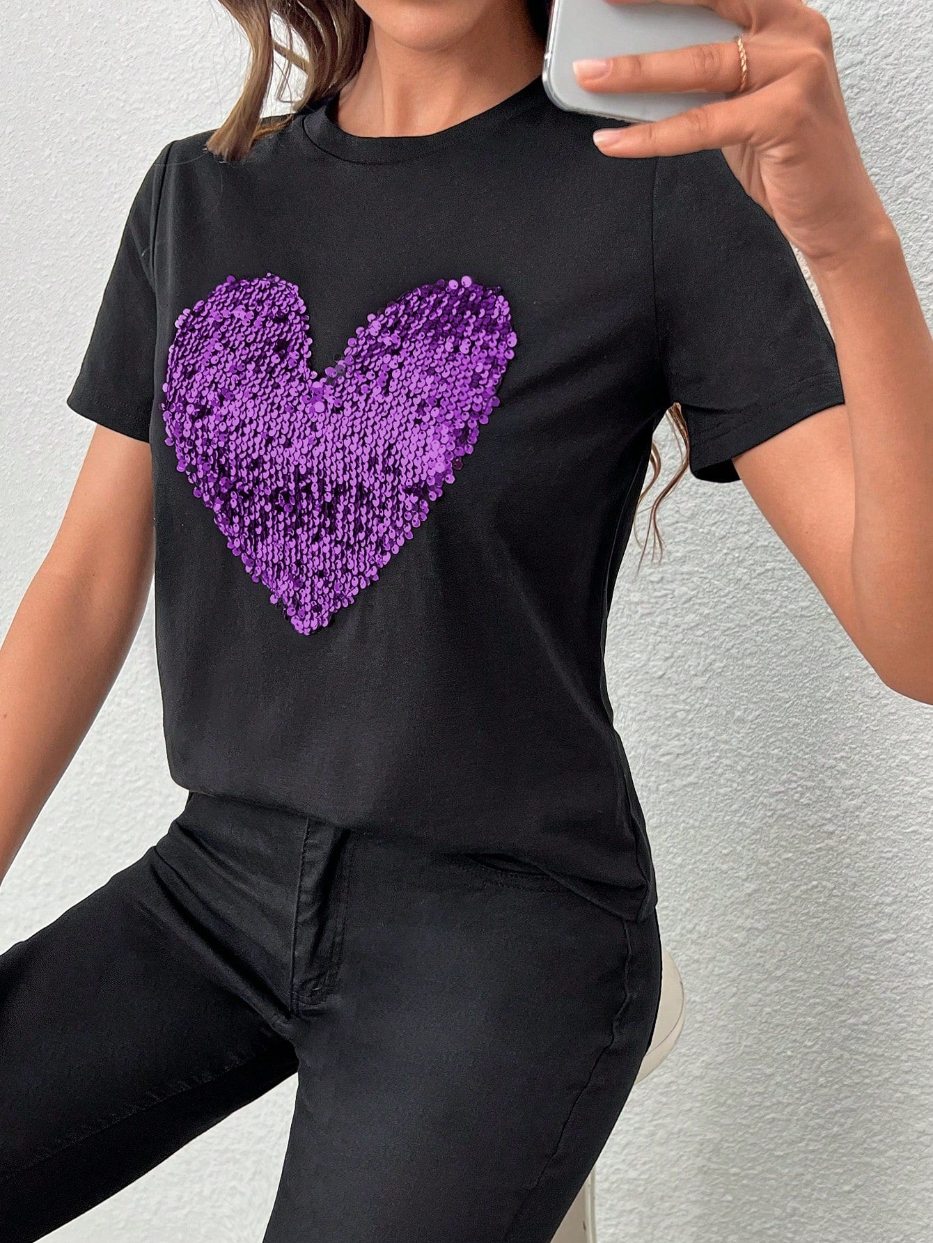 The Essence of Love: Heart Sequin Detail Tee is the perfect addition to your wardrobe. The heart-shaped sequin detailing adds a touch of sparkle and charm to this classic tee. Made with high-quality materials, it provides both comfort and style. A must-have for any fashion-forward individual.