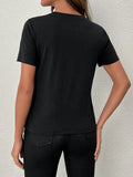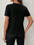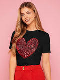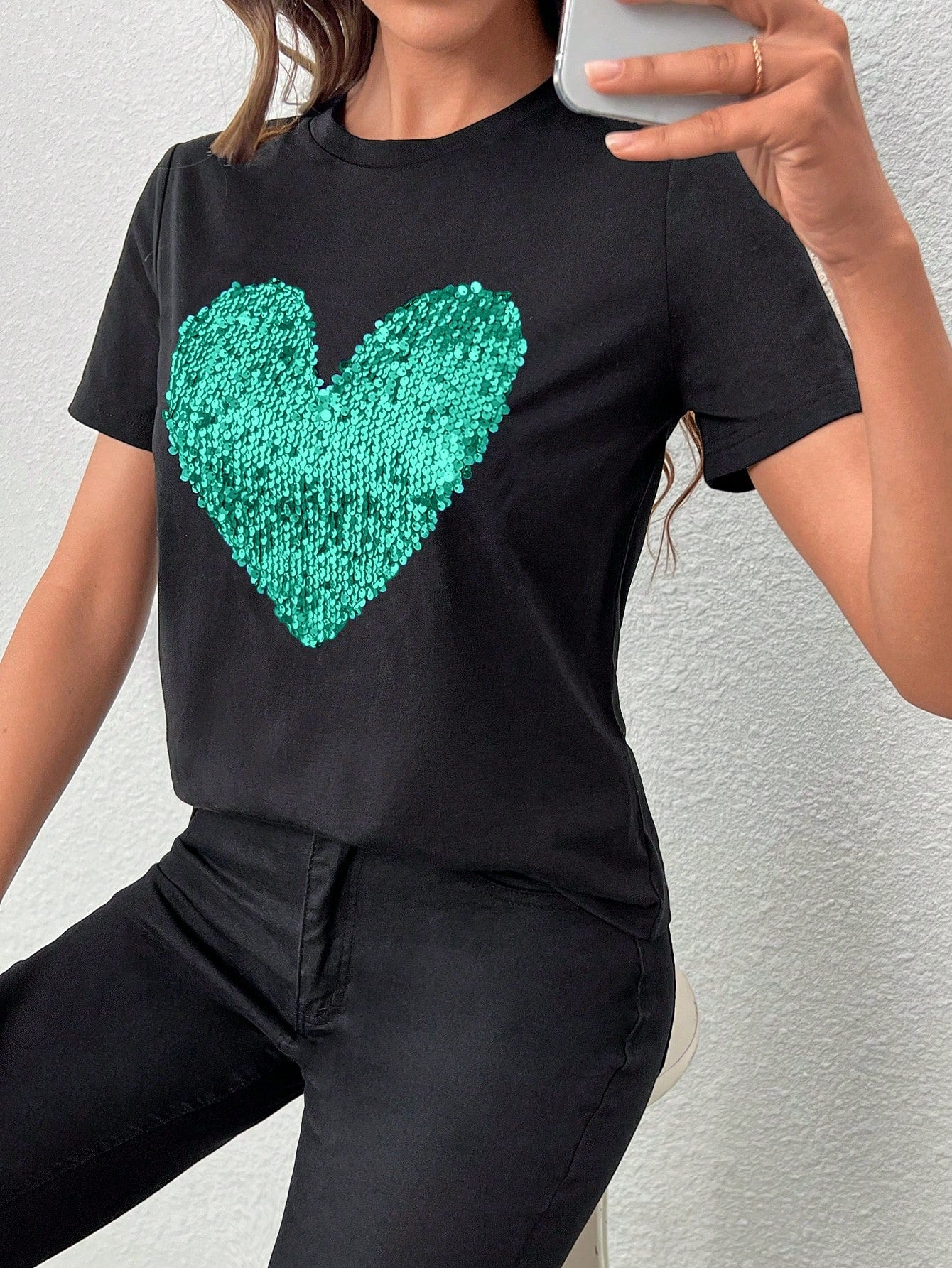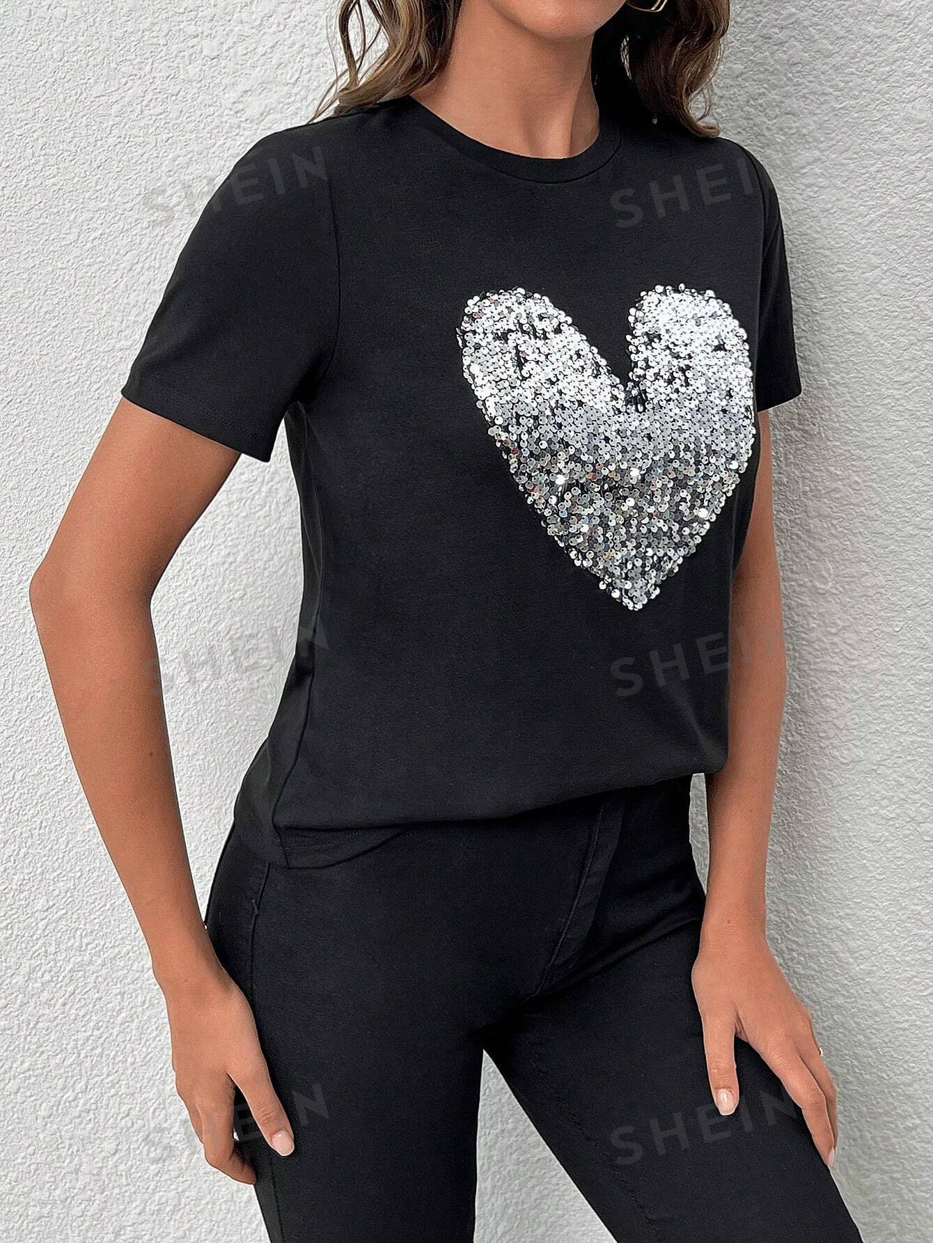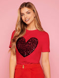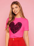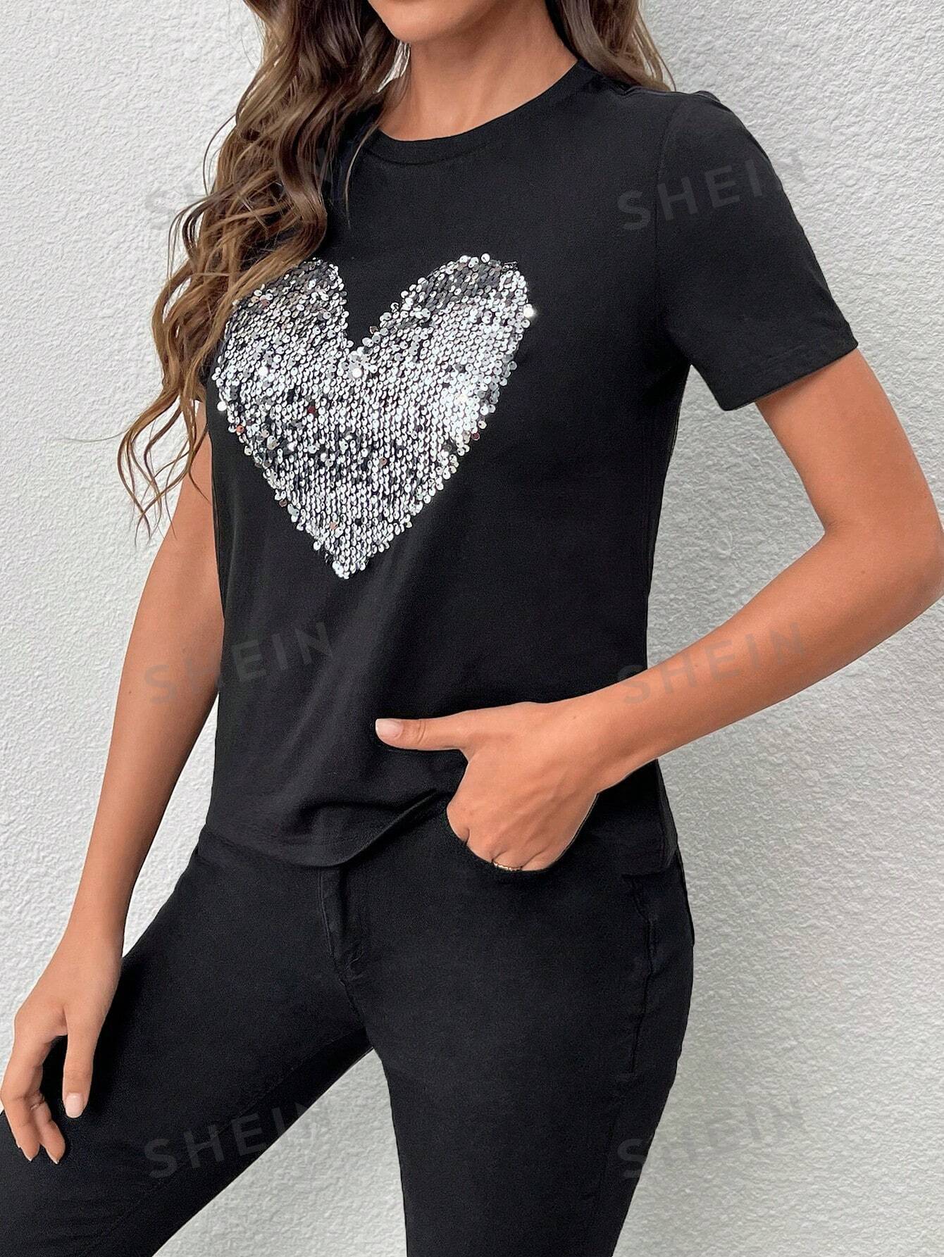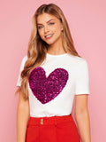 The Essence of Love: Heart Sequin Detail Tee is the perfect addition to your wardrobe. The heart-shaped sequin detailing adds a touch of sparkle and charm to this classic tee. Made with high-quality materials, it provides both comfort and style. A must-have for any fashion-forward individual.