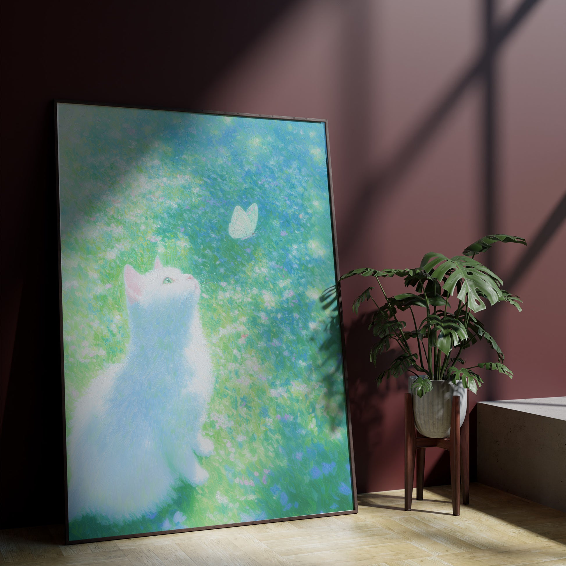 A soft and enchanting digital painting of a fluffy white cat with bright green eyes looking up at a delicate white butterfly. The scene is set in a lush, sun-drenched meadow filled with blurred green and blue textures that create a bokeh-like effect. This dreamy and peaceful artwork captures a magical moment in nature, making it a perfect decorative piece for a nursery, bedroom, or a cozy living room. Its gentle colors and whimsical atmosphere provide a sense of calm and wonder to any space.