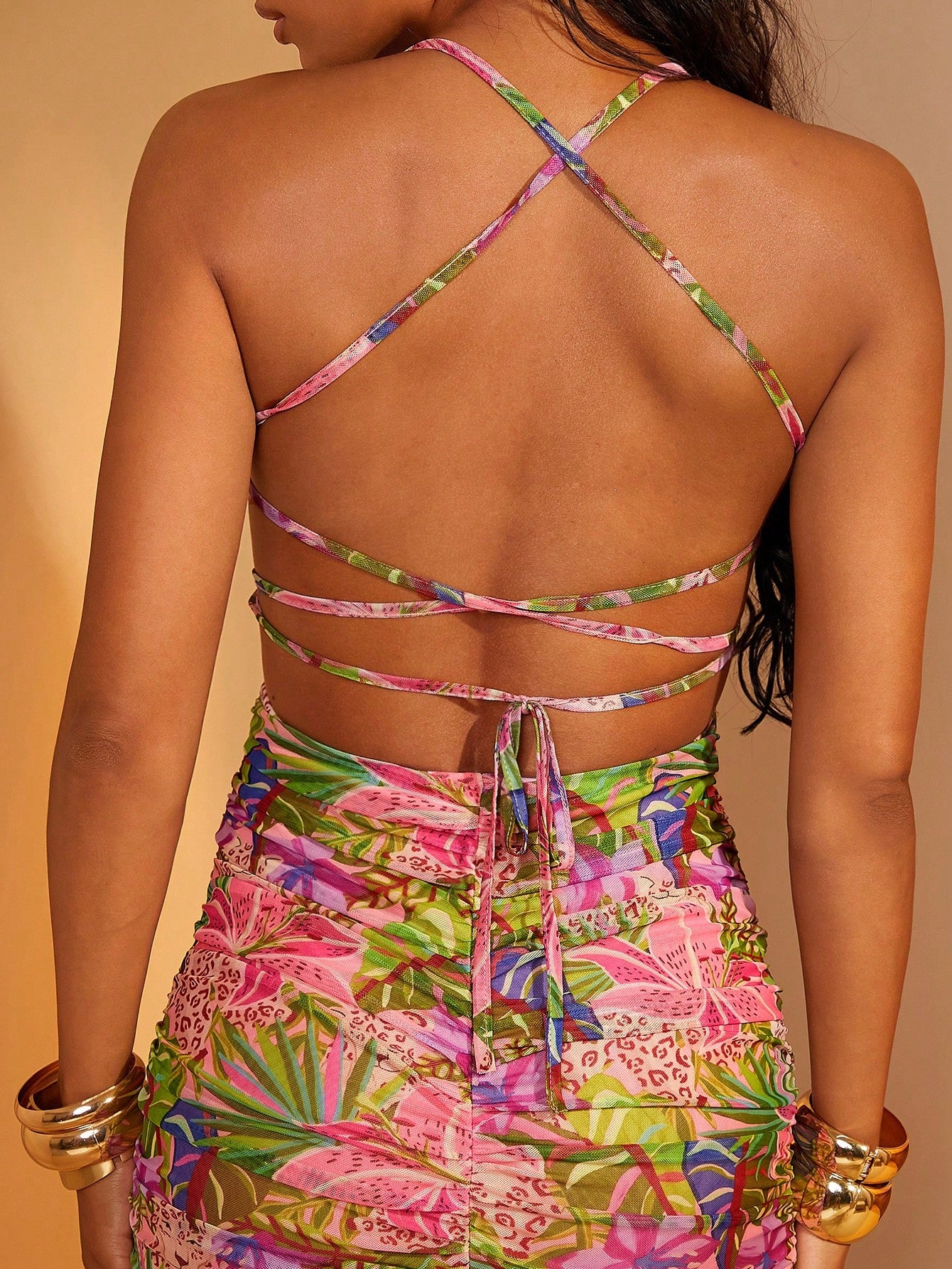 Exotic Elegance: Tropical Print Ruched Backless Cami Dress