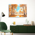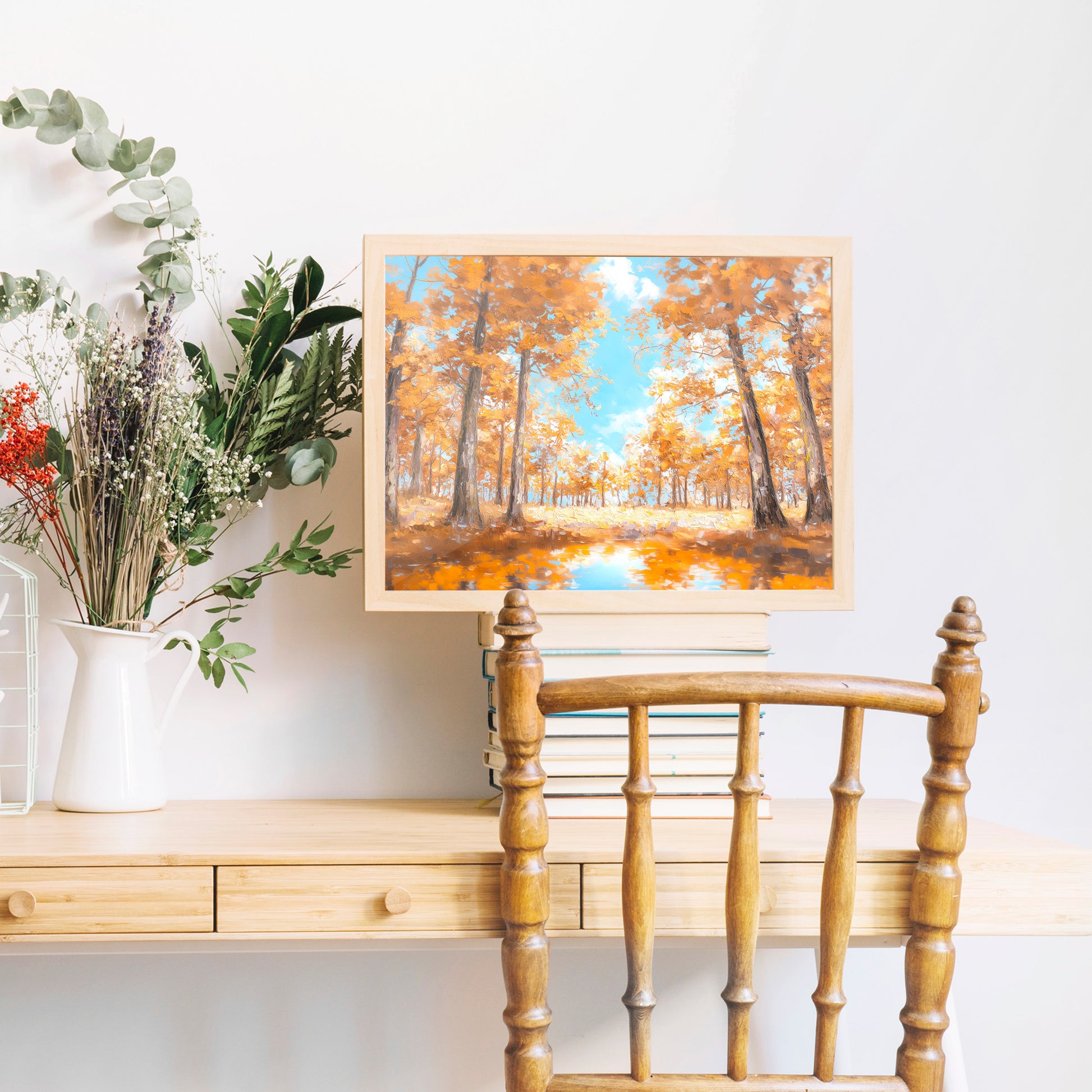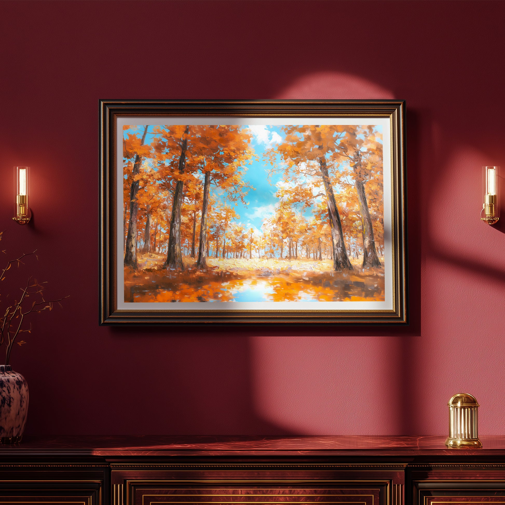 A vibrant and expansive oil painting capturing the breathtaking beauty of an autumn forest. The scene is dominated by tall, slender tree trunks with thick, expressive brushstrokes of intense orange and gold foliage, indicating the peak of the fall season. The ground is covered in warm tones and reflects the bright, clear blue sky and white clouds visible through the canopy. The foreground features a gentle reflection of the scene on a calm pool of water or a wet surface. The artwork uses a maximalist approach to color and texture, conveying a strong sense of light, warmth, and the dramatic energy of the autumn landscape.