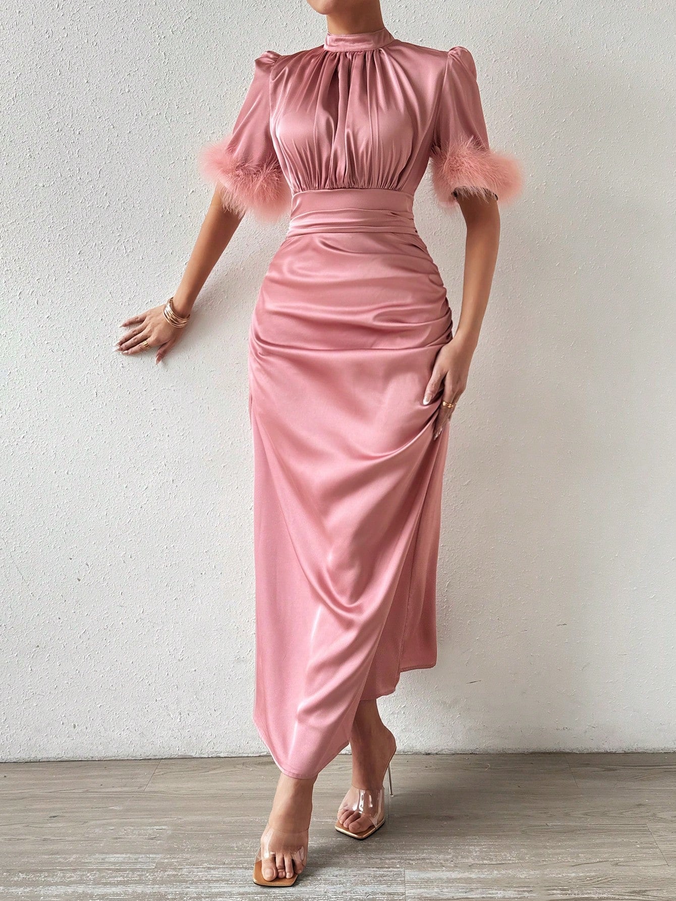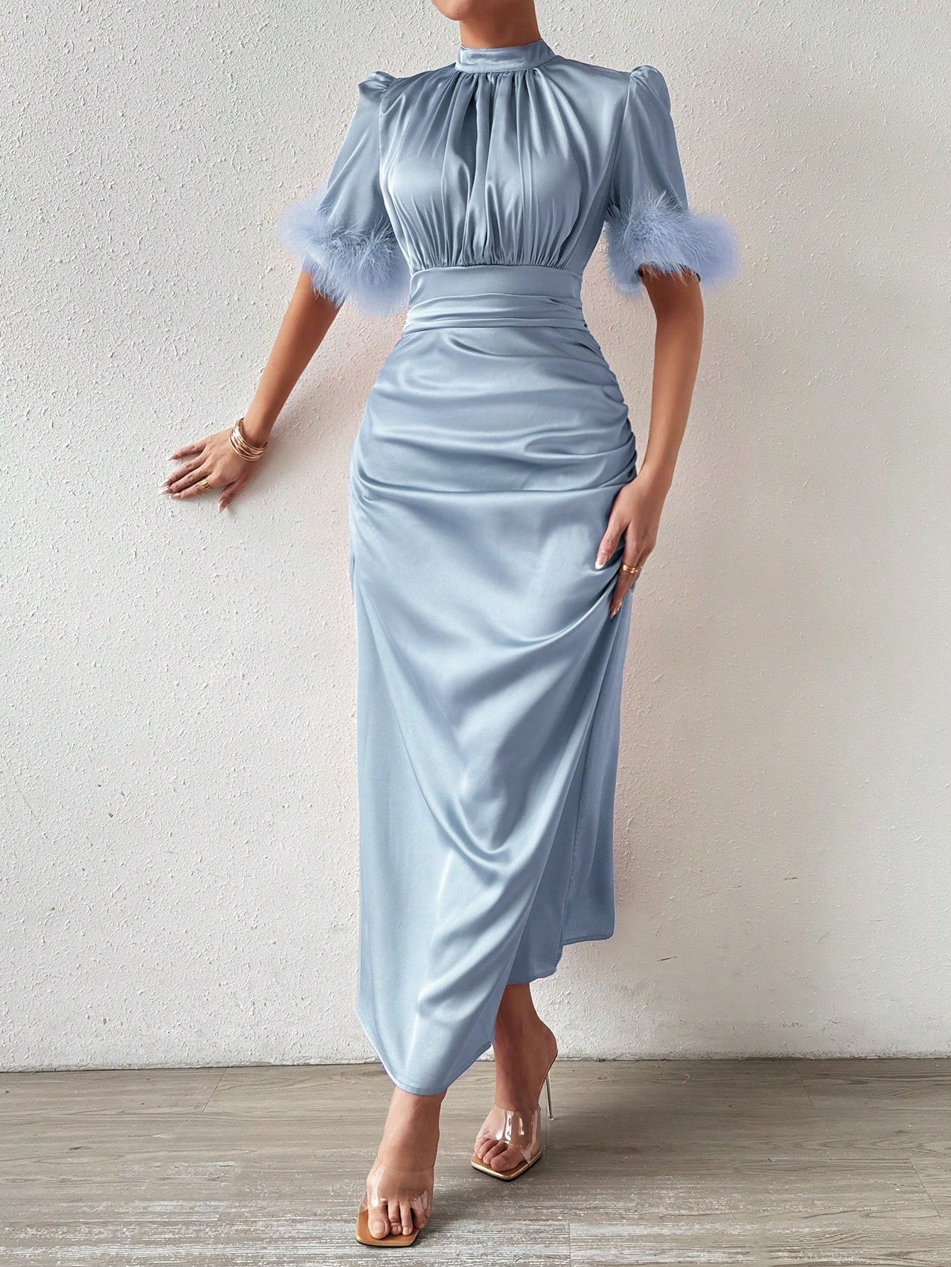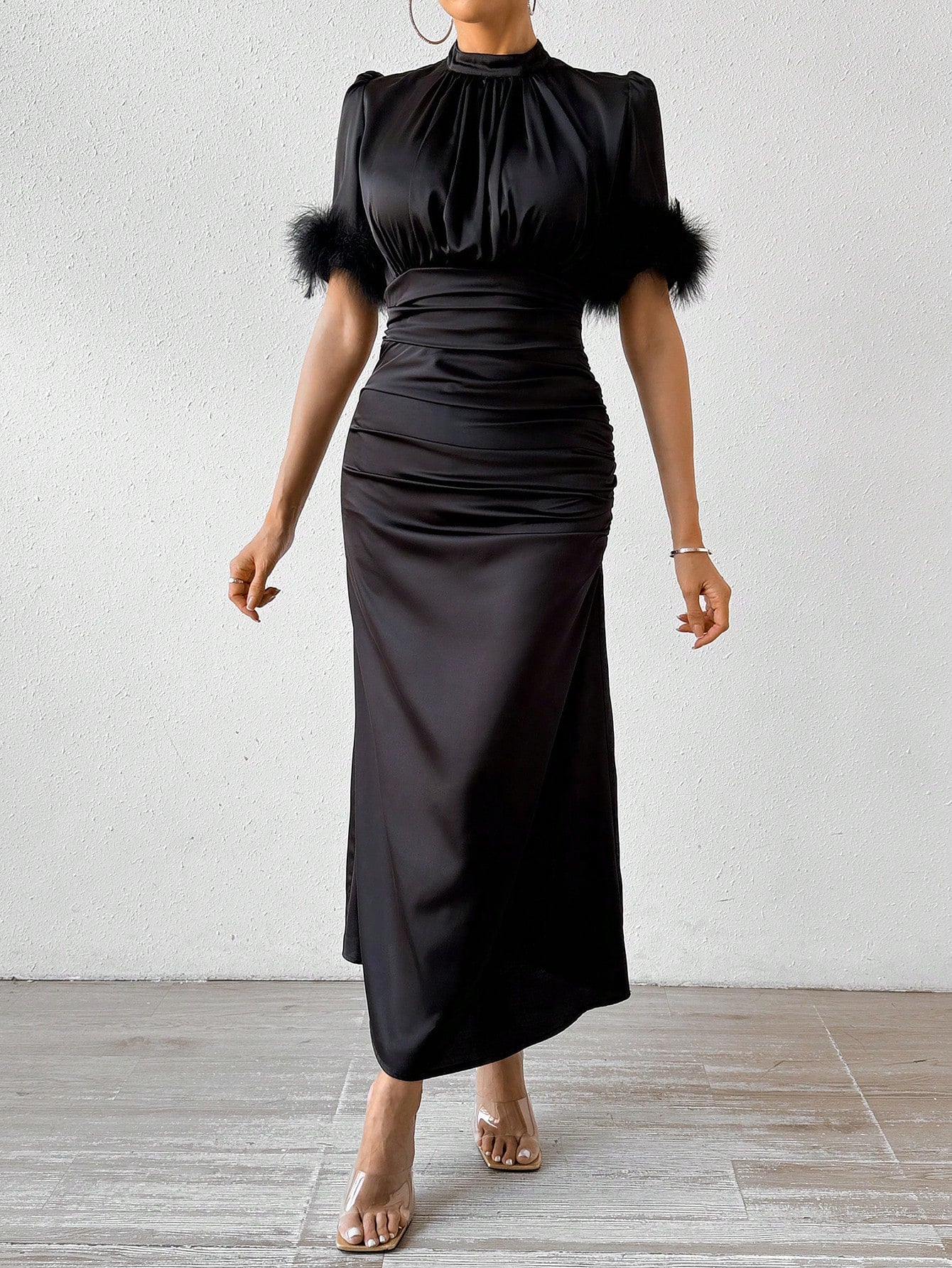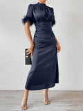 Feathered Elegance: Women's Turkey Feather Satin Party Dress