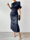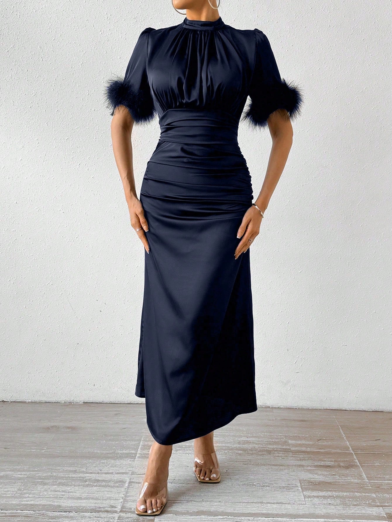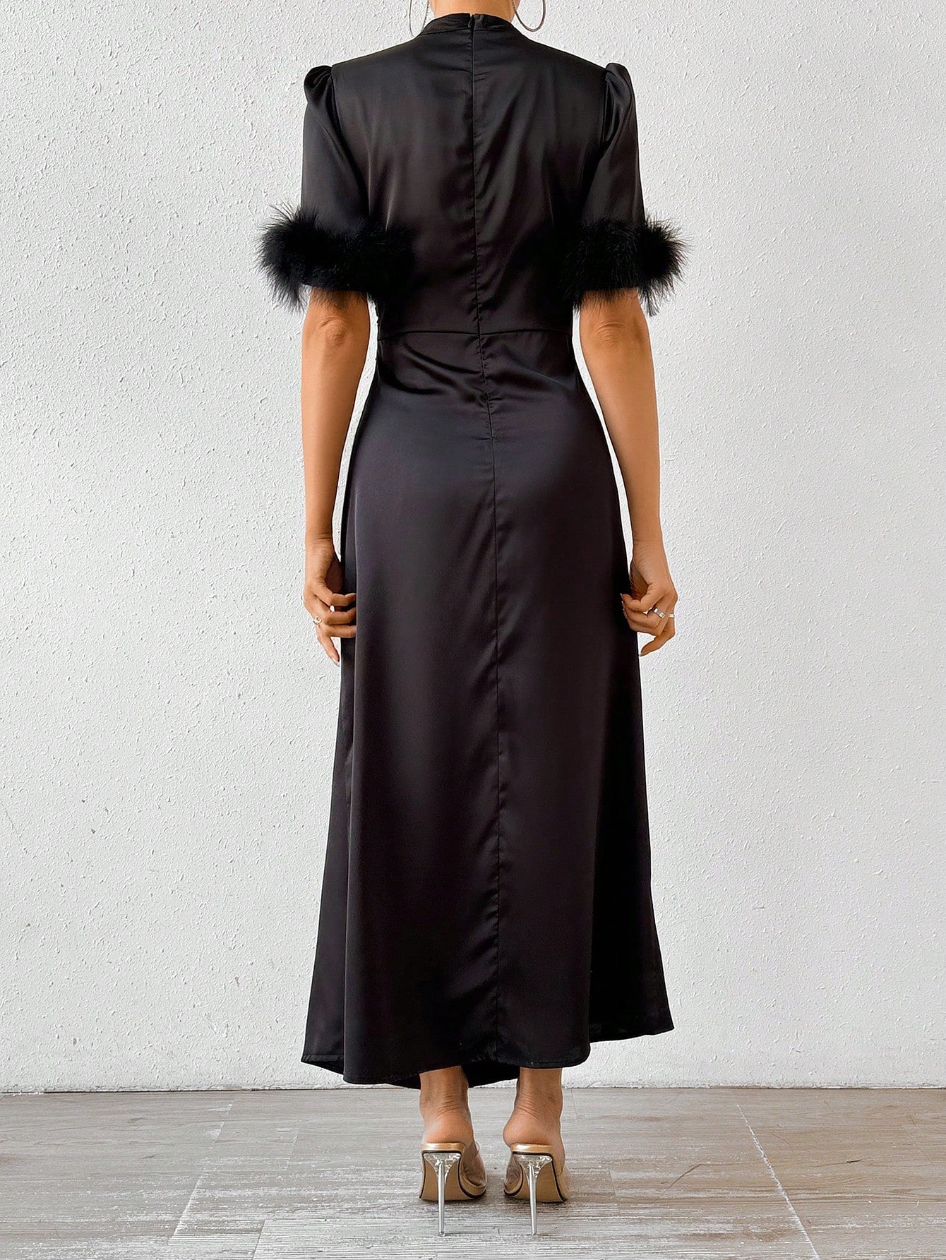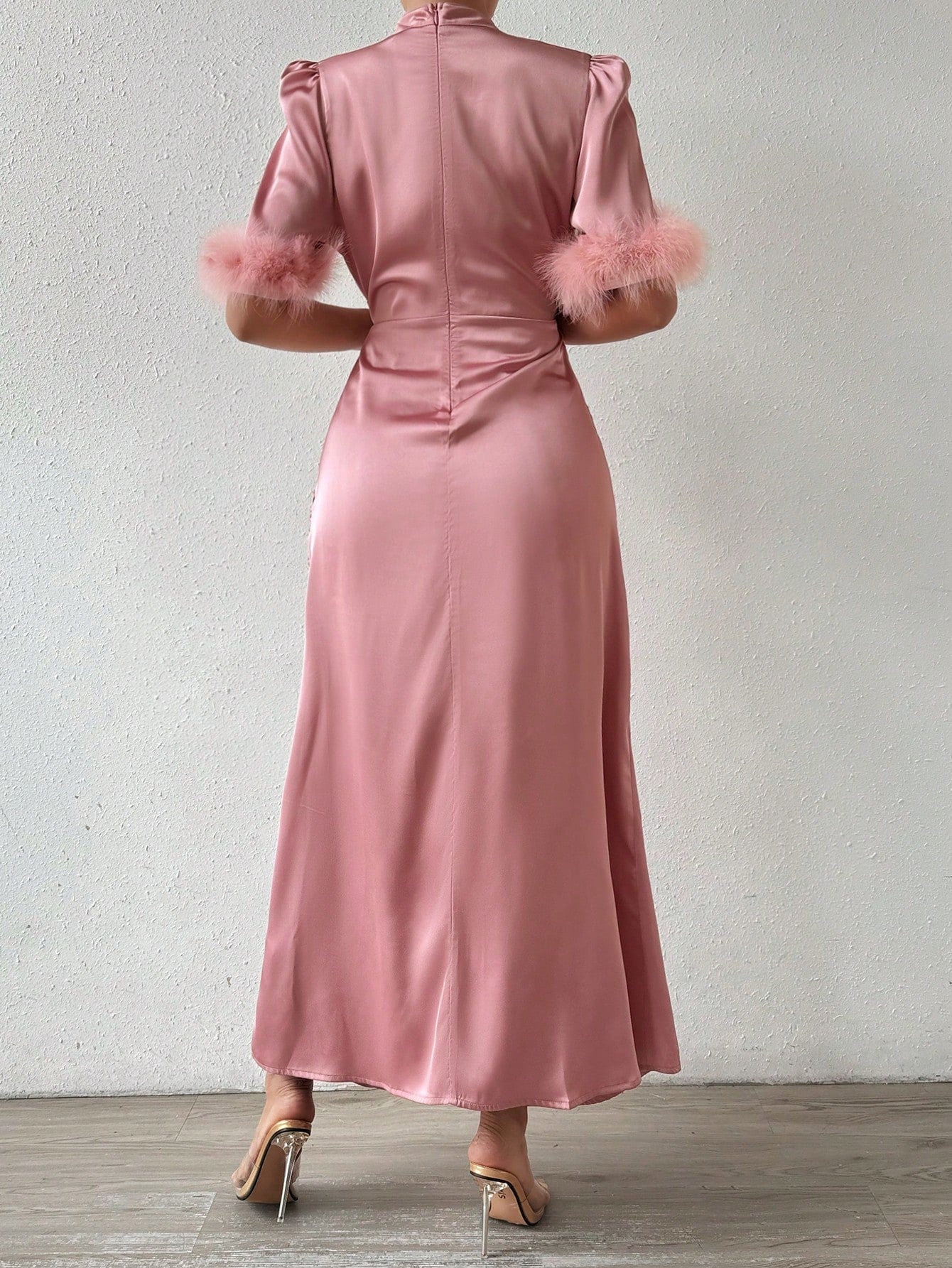 Feathered Elegance: Women's Turkey Feather Satin Party Dress
