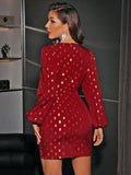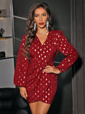 Festive Elegance: Gold Dot Print Lantern Sleeve Wrap Dress for Holiday Glam