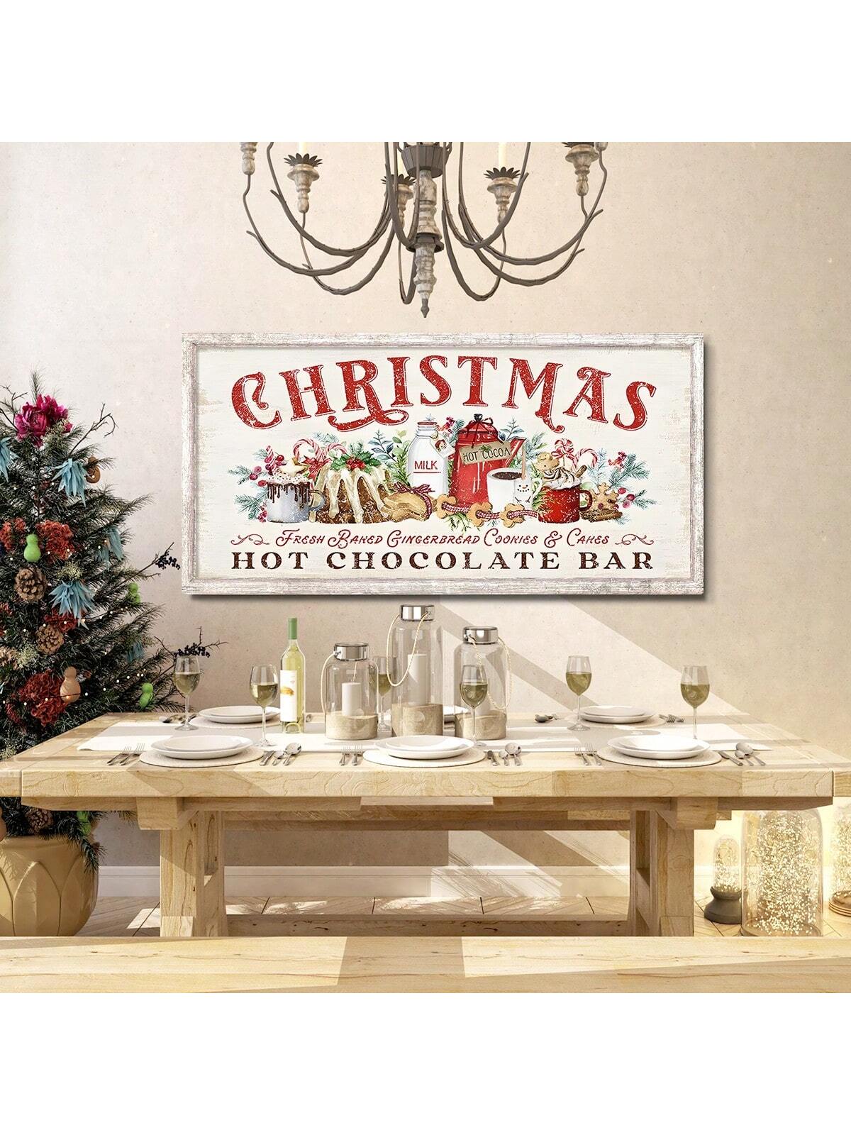 This festive wall art adds a touch of holiday cheer to any space. With its charming farmhouse design and cozy hot cocoa bar motif, it's the perfect addition to your Christmas decor. Made with durable canvas, this decoration will last for many holiday seasons to come.