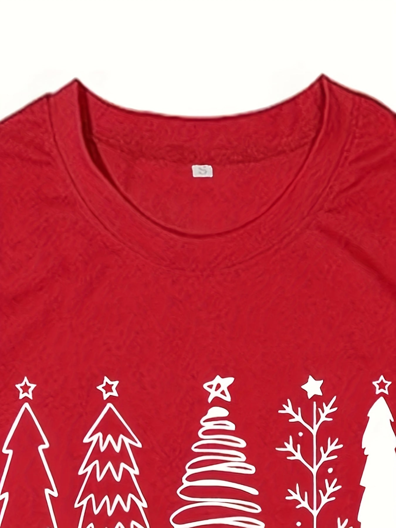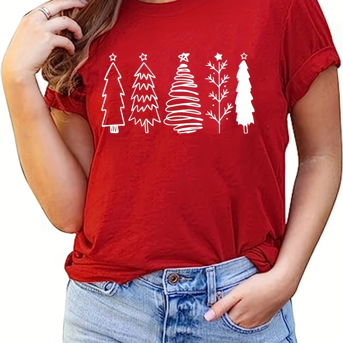 Festive Joy: Christmas Tree Print Tee - Casual Short Sleeve Crew Neck T-Shirt for Women's Clothing