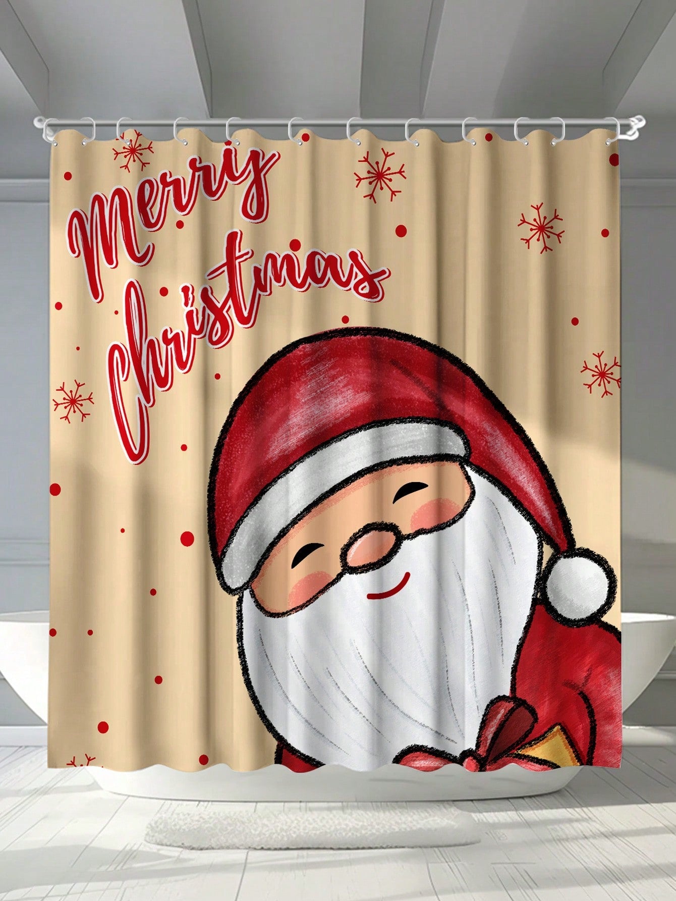 Enhance your bathroom decor with our festive Santa Claus shower curtain. Designed with waterproof material and equipped with hooks and eyelets, it's also mildew resistant for long-lasting use. Enjoy a holiday-themed shower experience with this high-quality and practical addition to your bathroom.