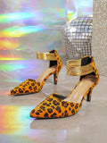 Fierce Elegance: Pointed Toe Leopard Print High Heels with Gold Straps
