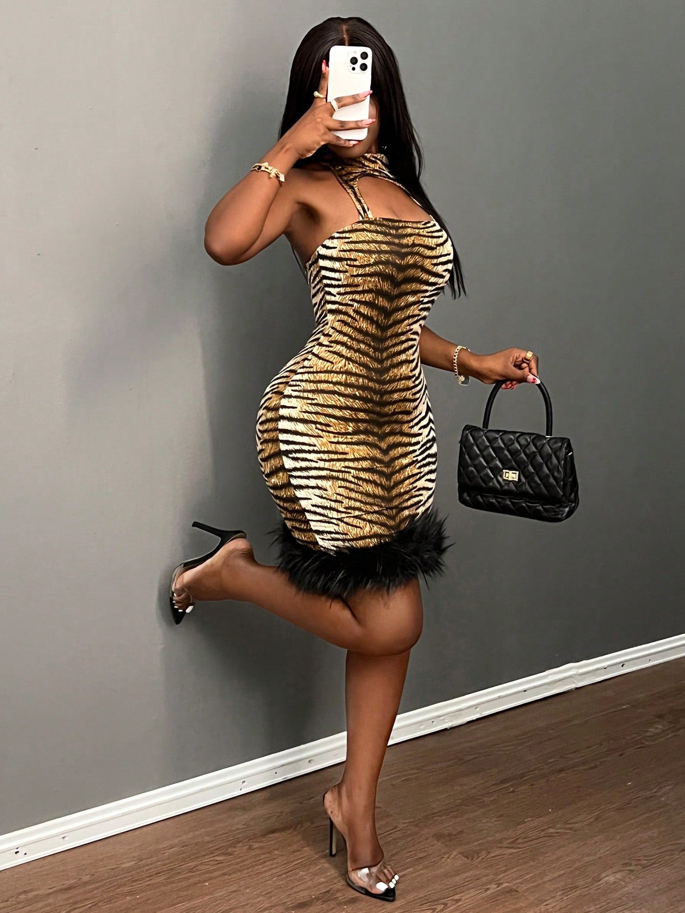 Fierce & Fabulous: Leopard Print Backless Mini Dress with Fuzzy Trim