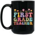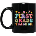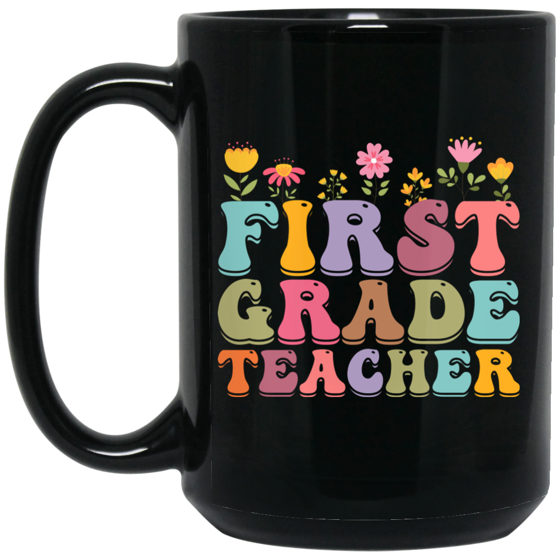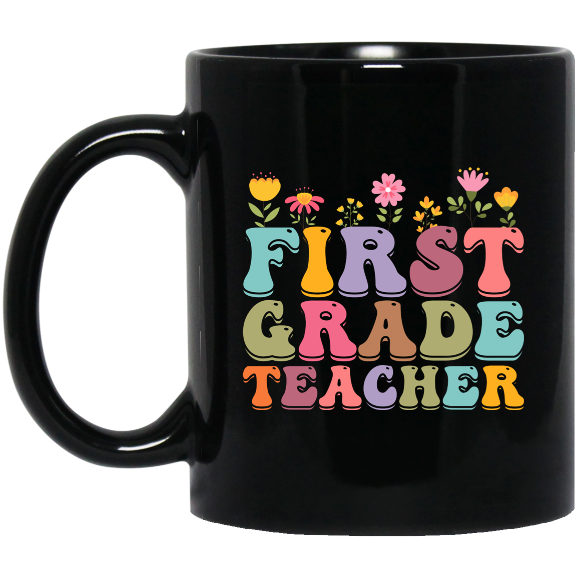 First Grade Teacher, Teacher, Groovy Style, Flower, Nursery Design Black Mug