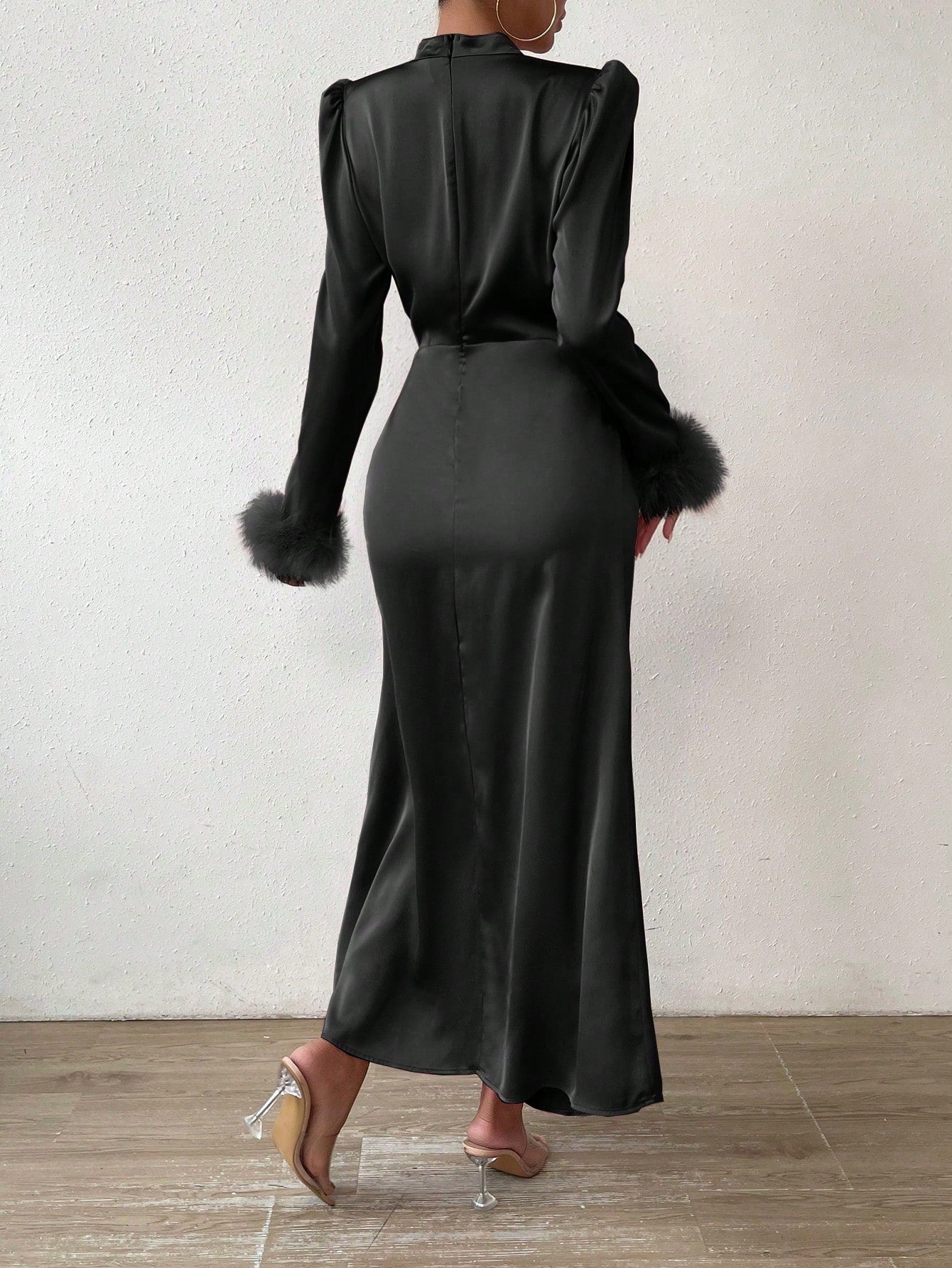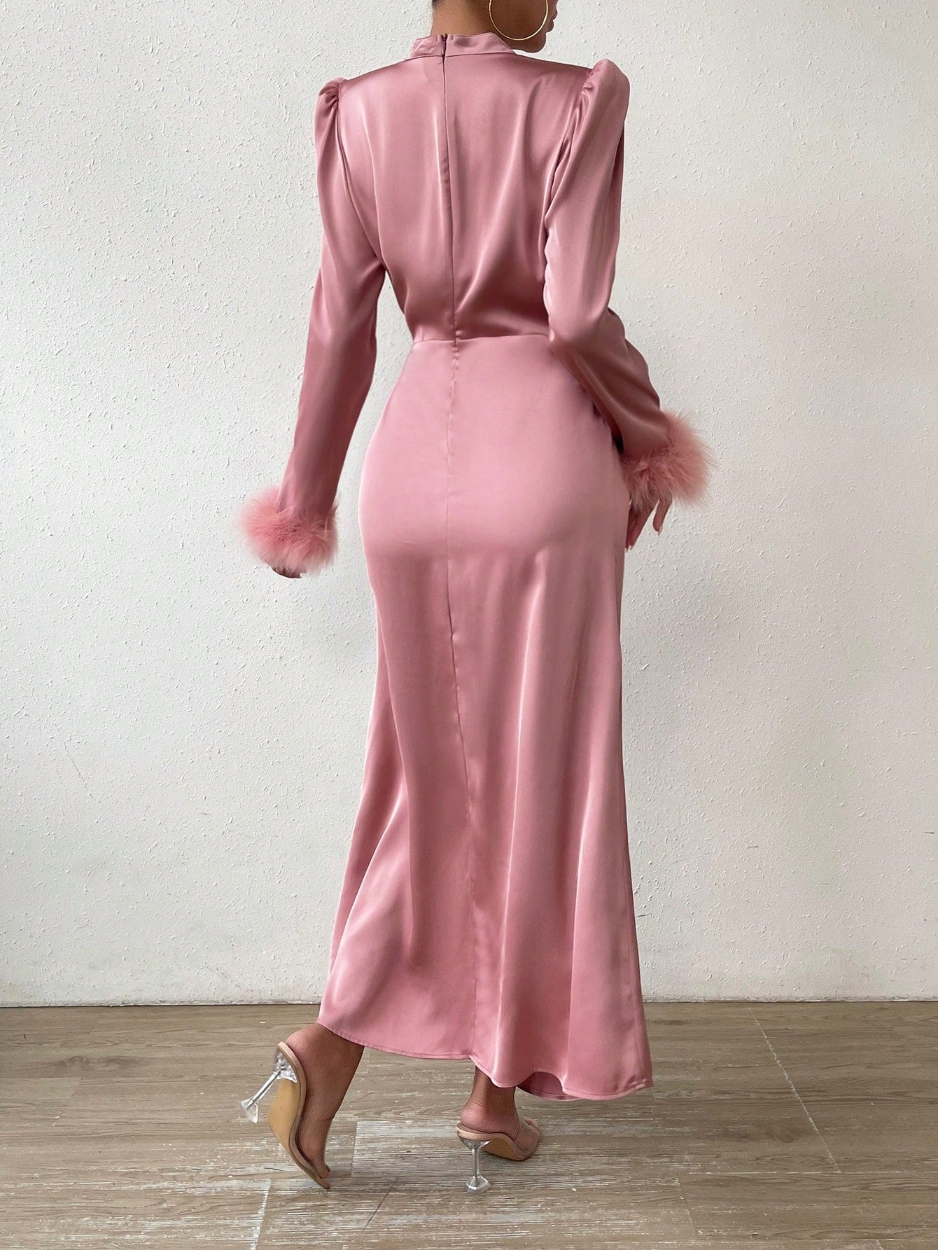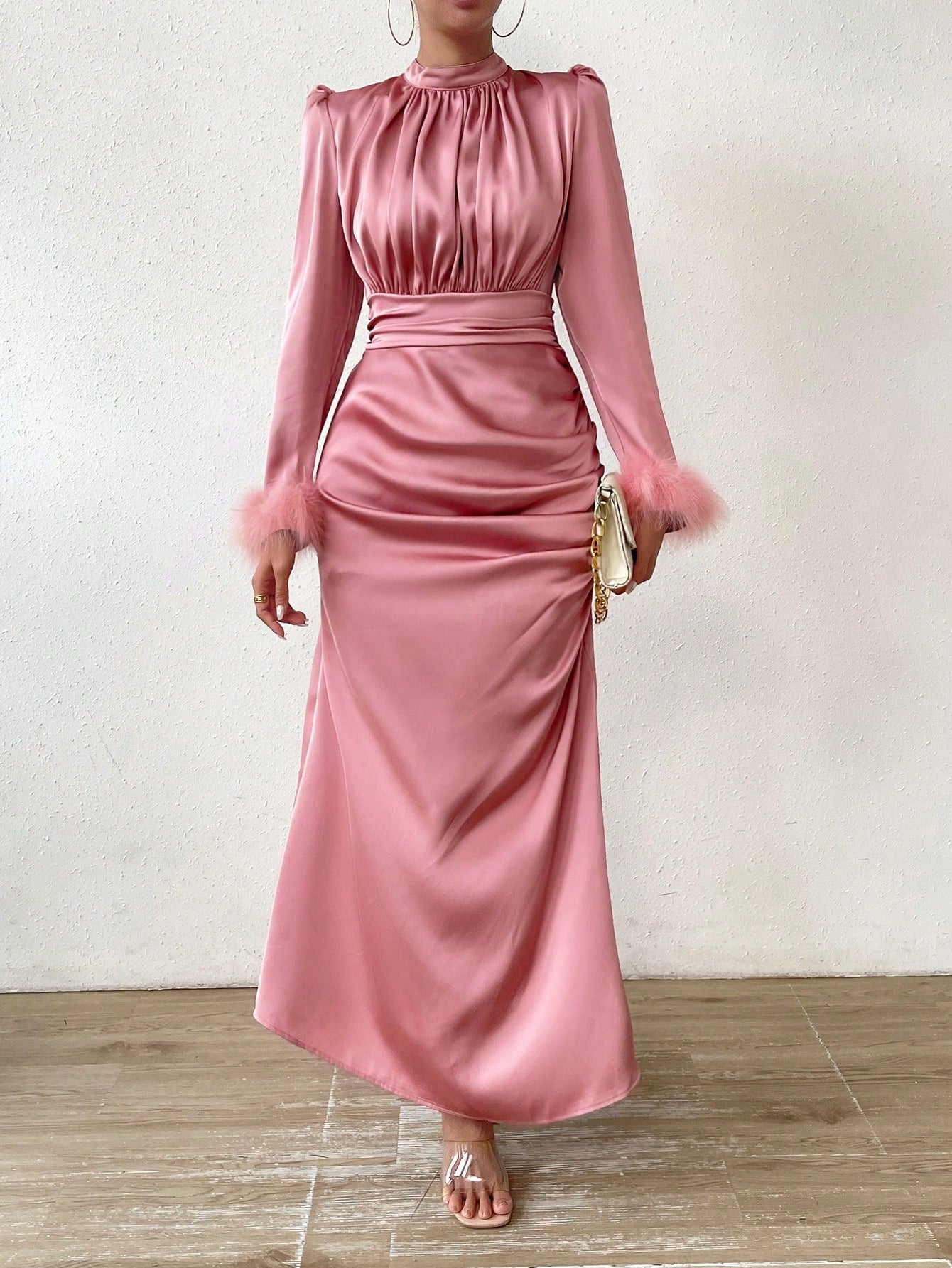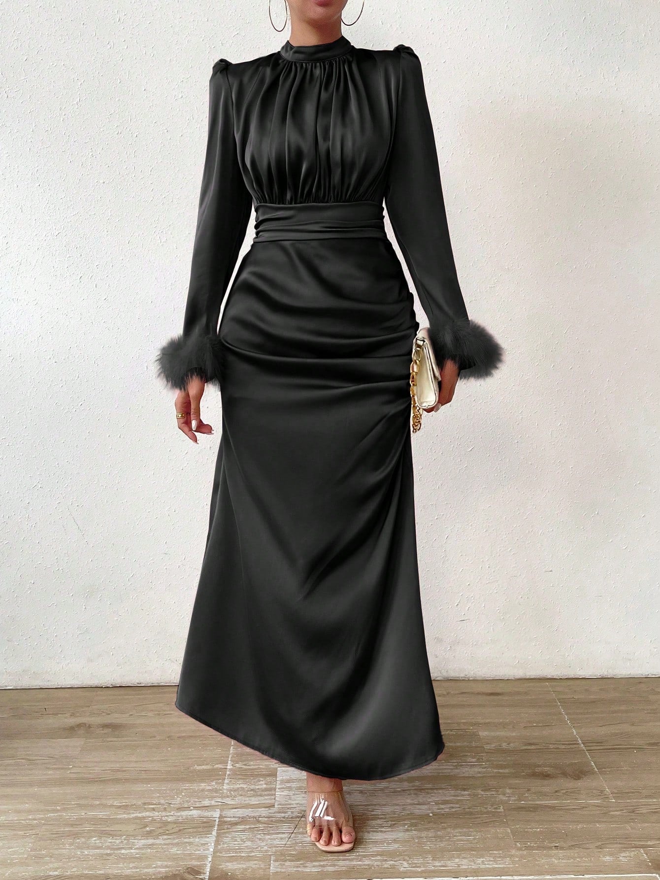 Indulge in luxury with our Flirty and Fabulous: Pleated Puff Sleeve Turkey Feather Dress