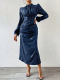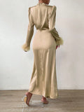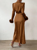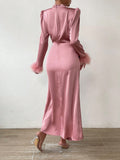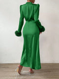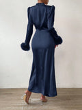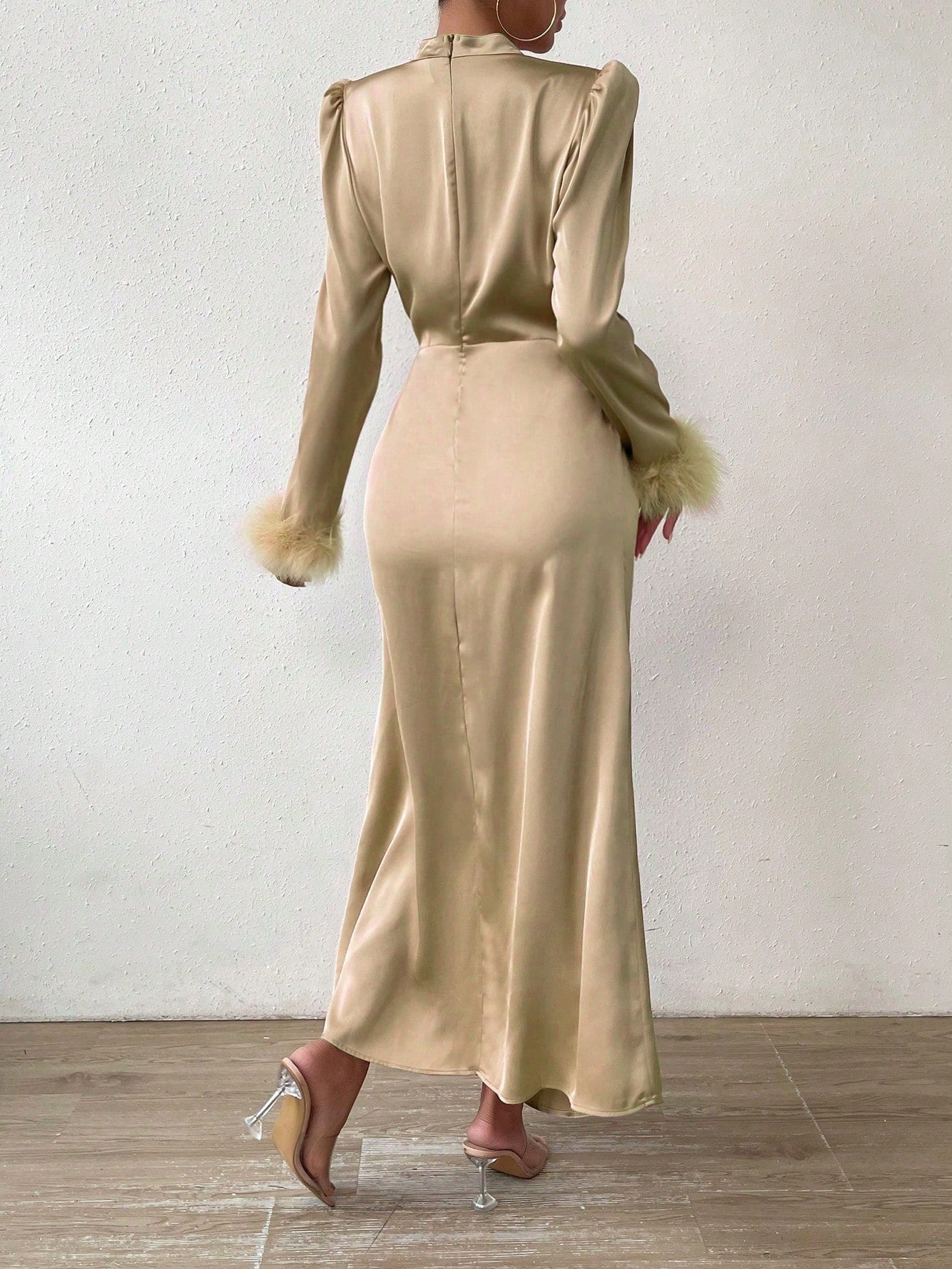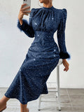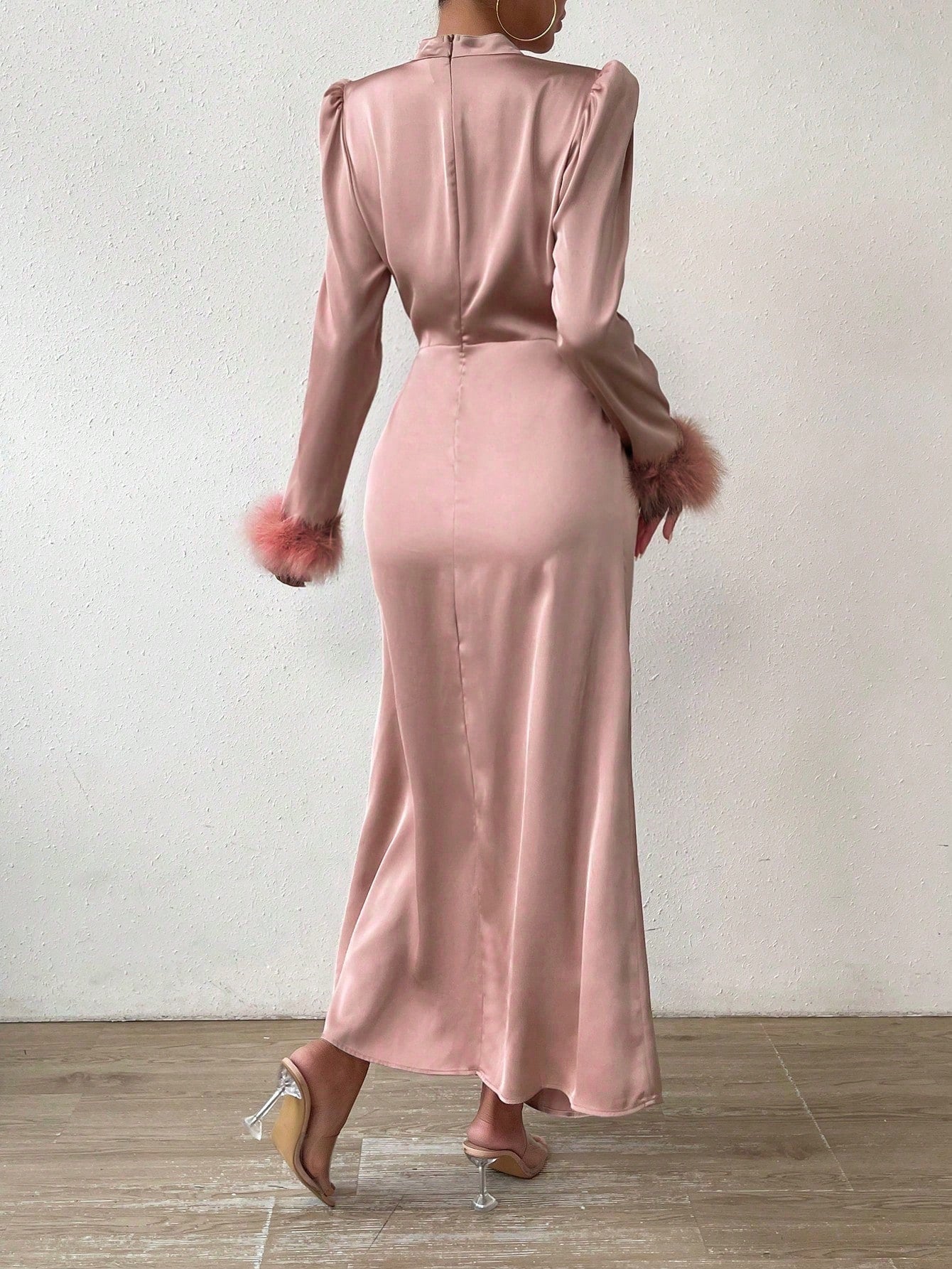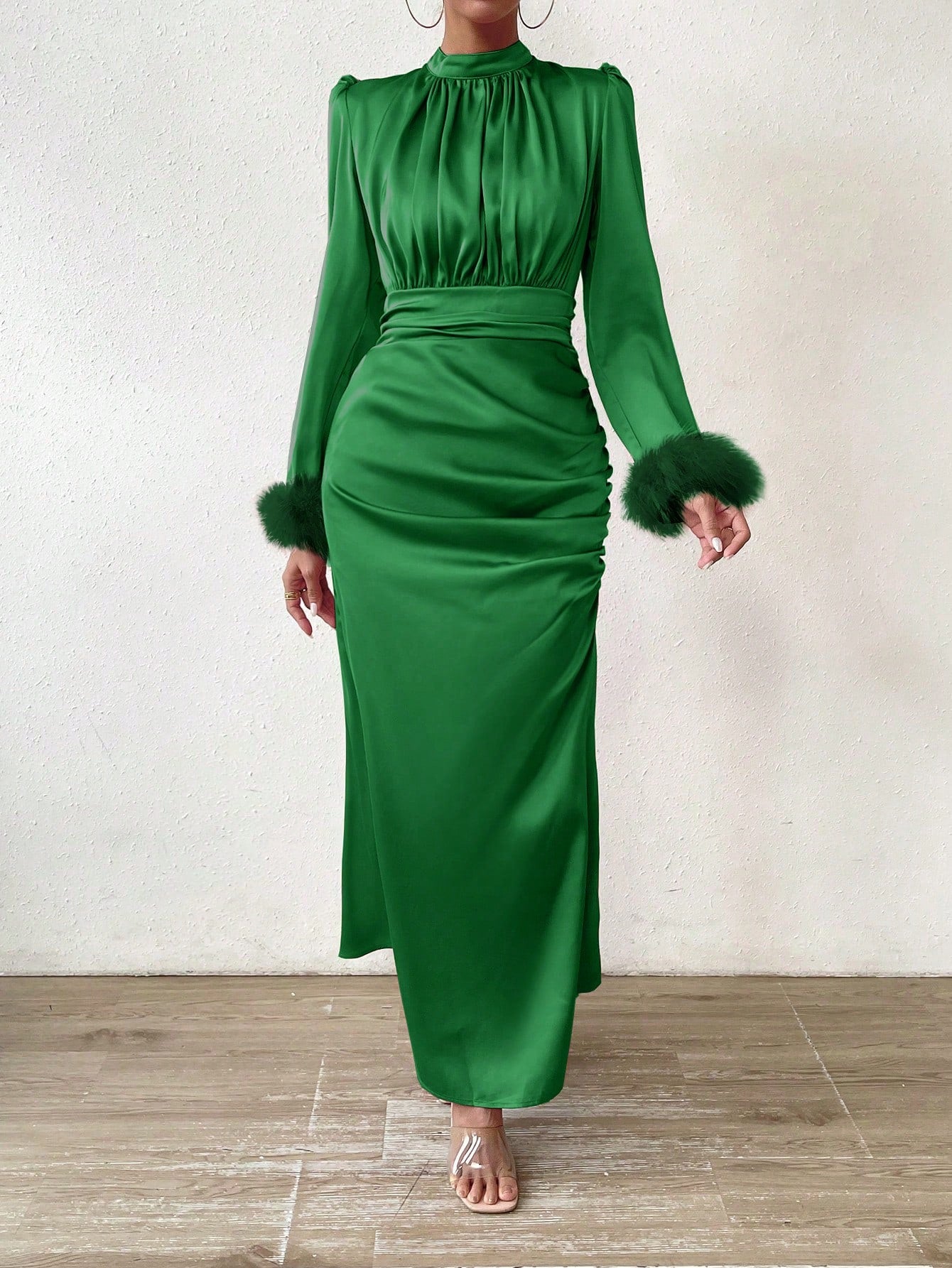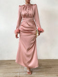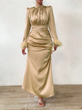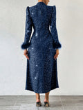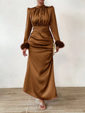 Indulge in luxury with our Flirty and Fabulous: Pleated Puff Sleeve Turkey Feather Dress
