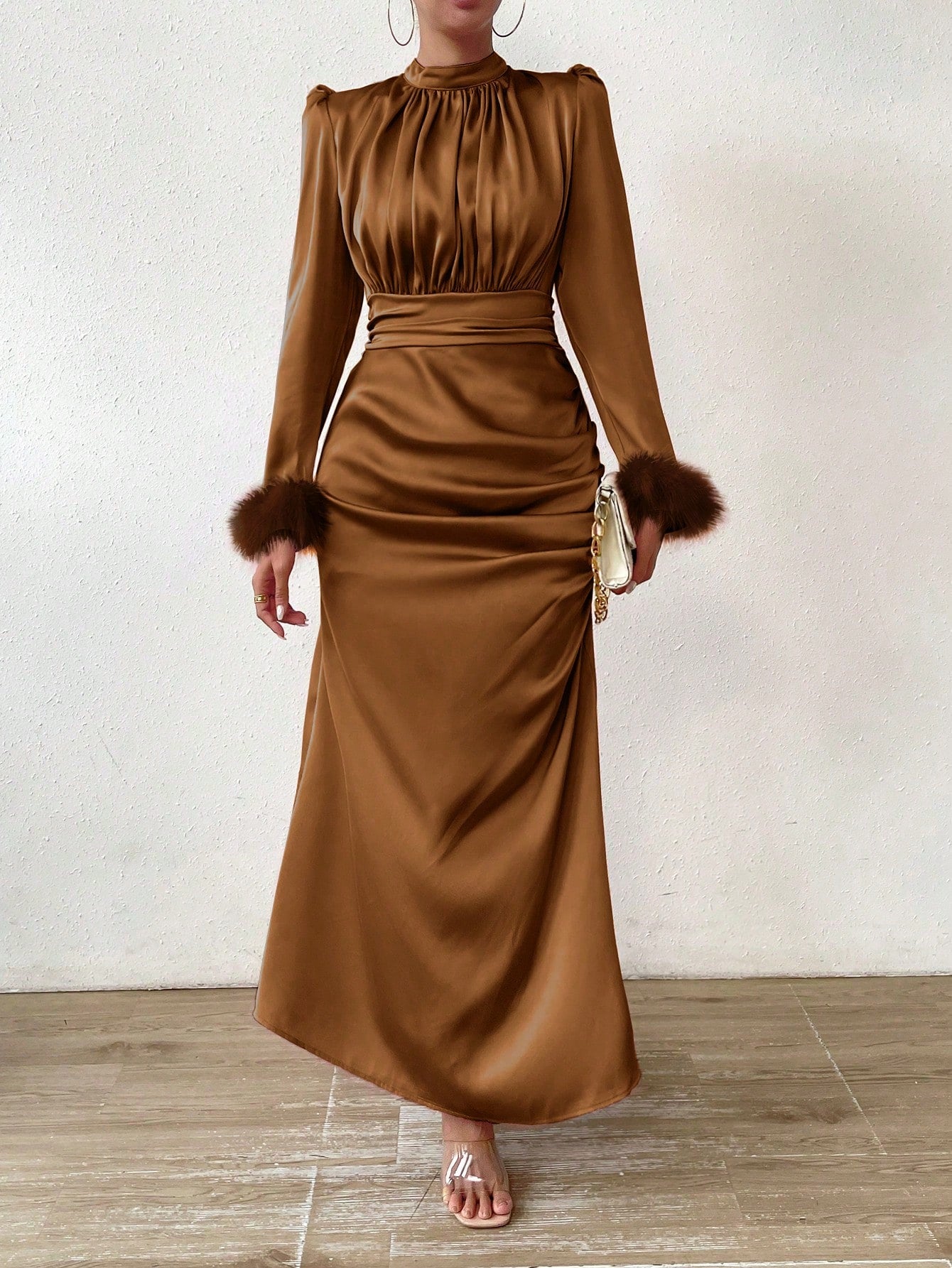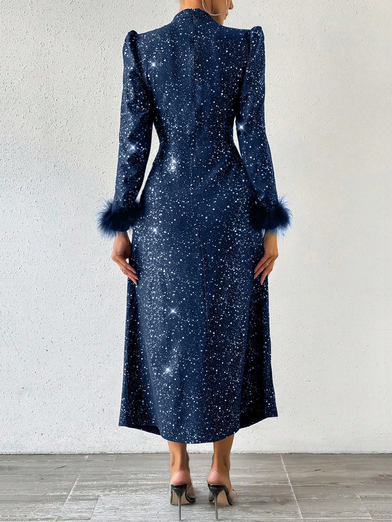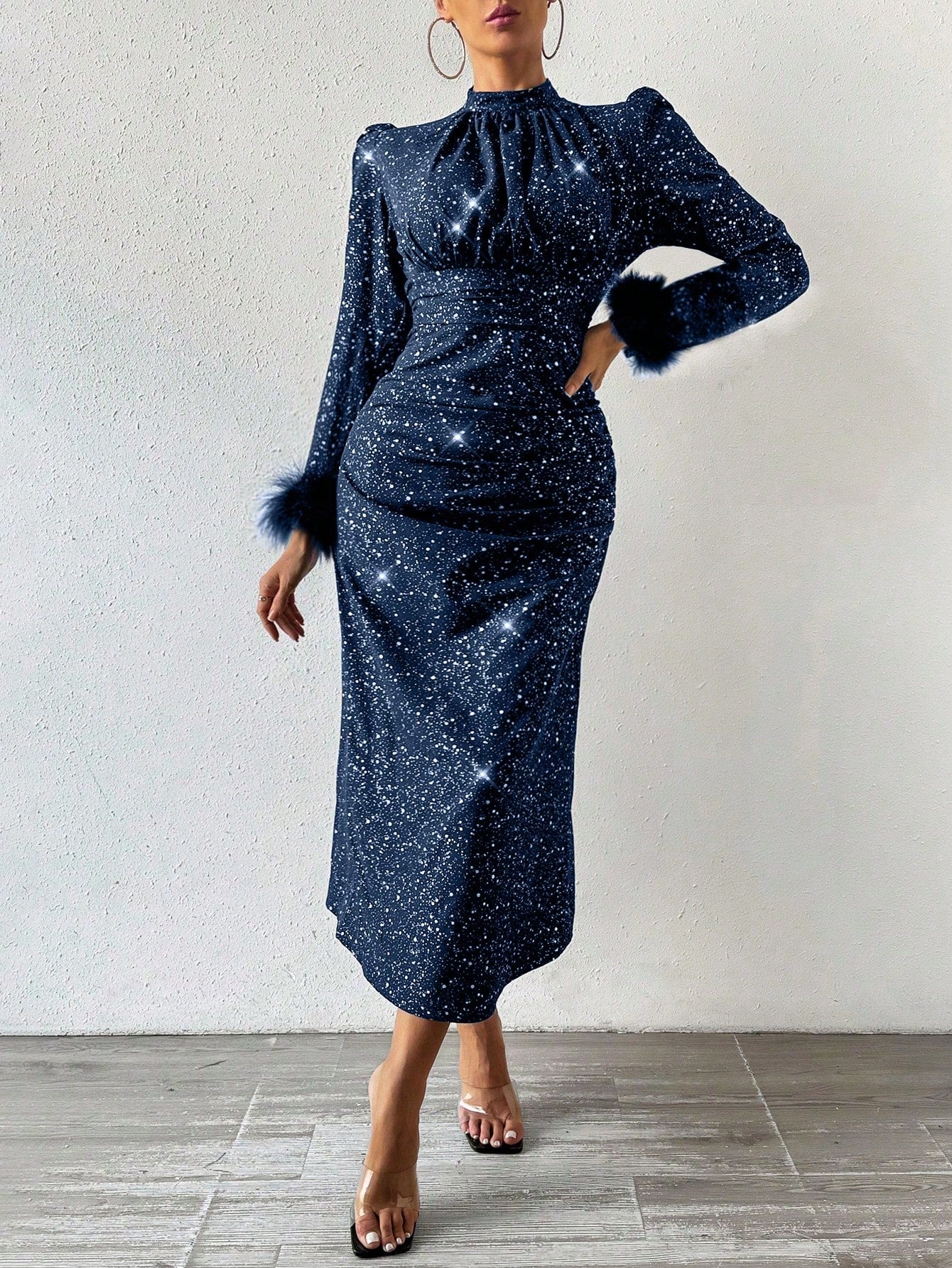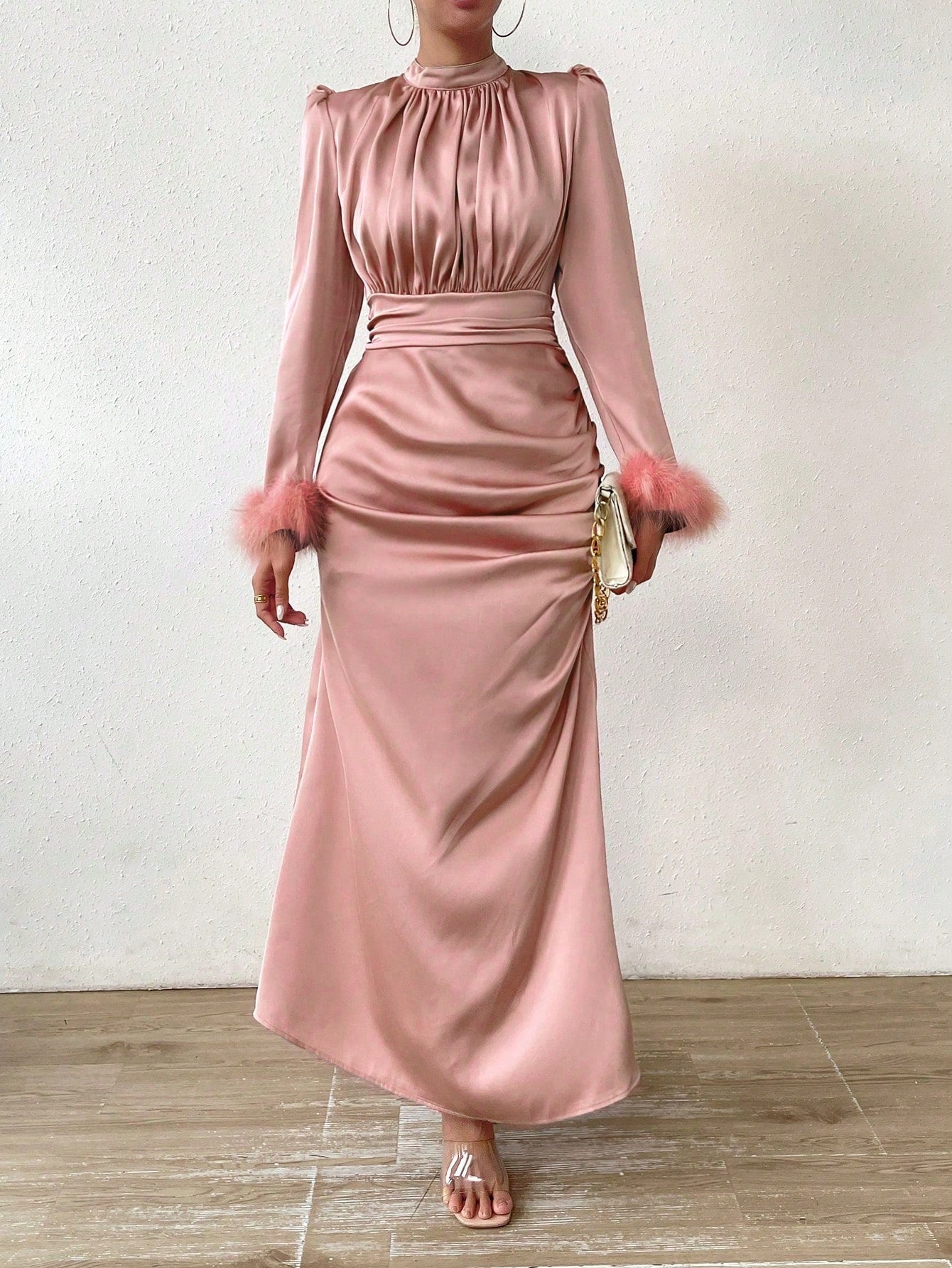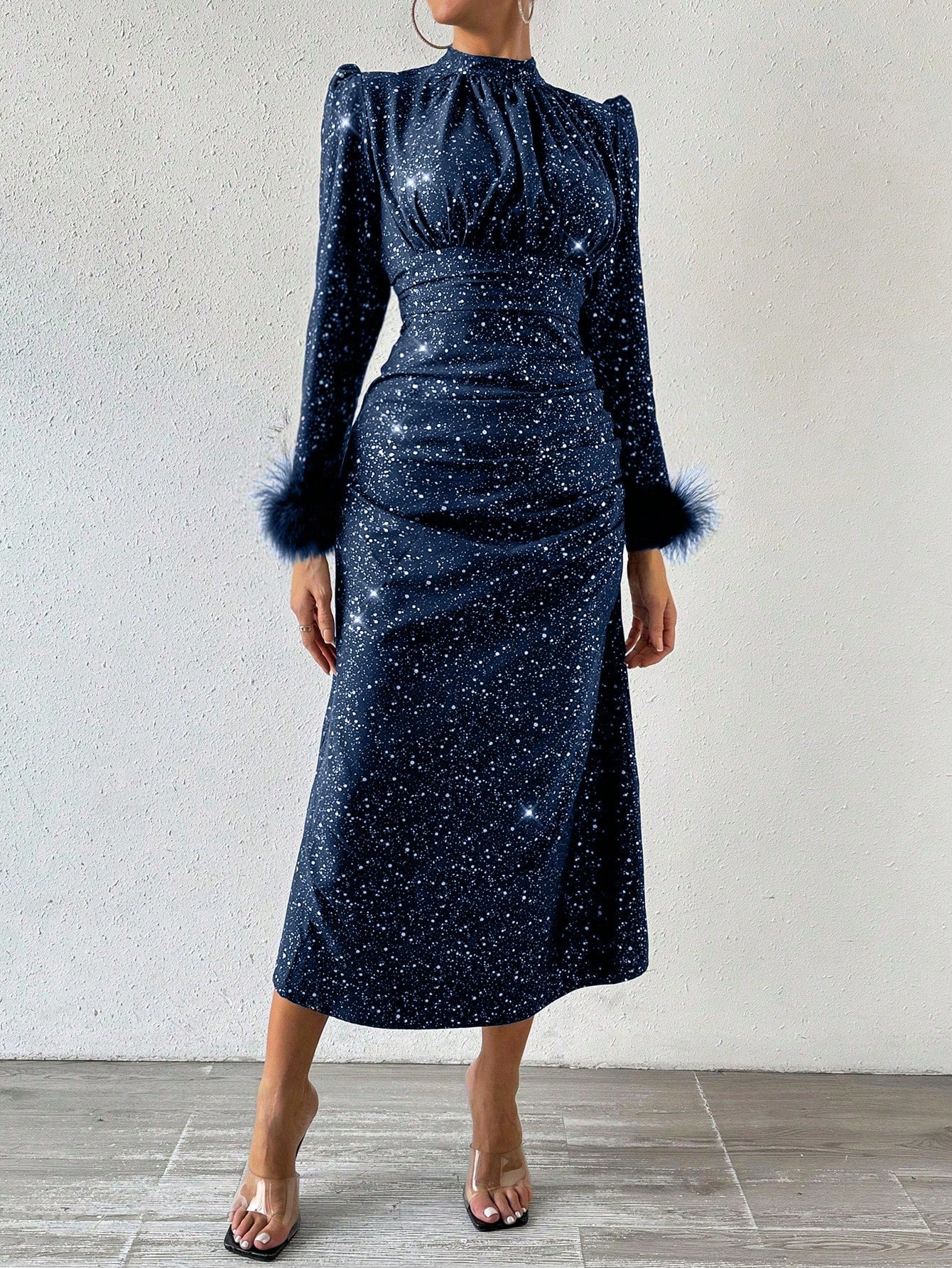 . Made with real turkey feathers, this dress is perfect for any special occasion. Its pleated puff sleeves add a touch of whimsy, making you feel confident and glamorous. Channel your inner fashionista with this unique dress.