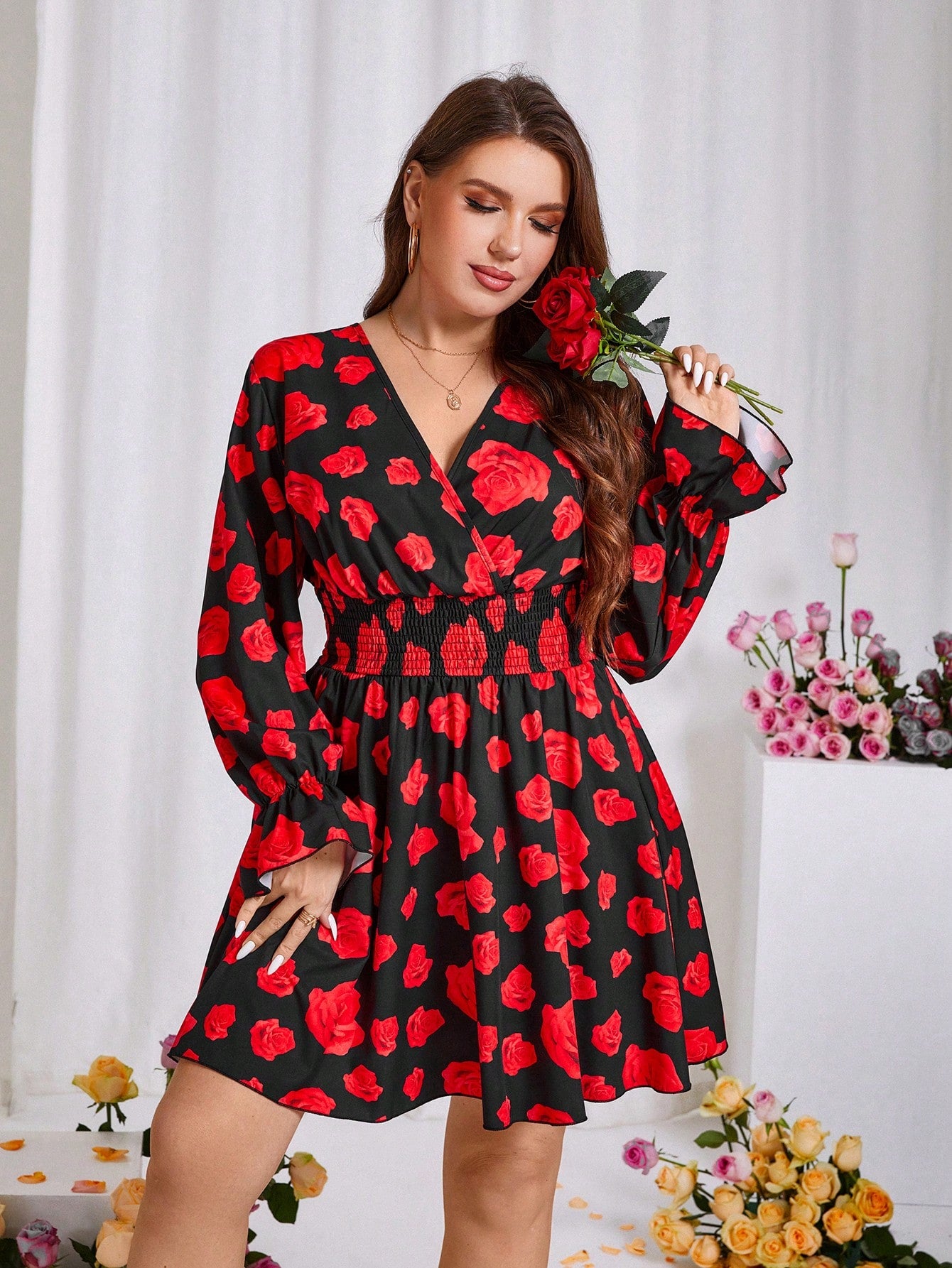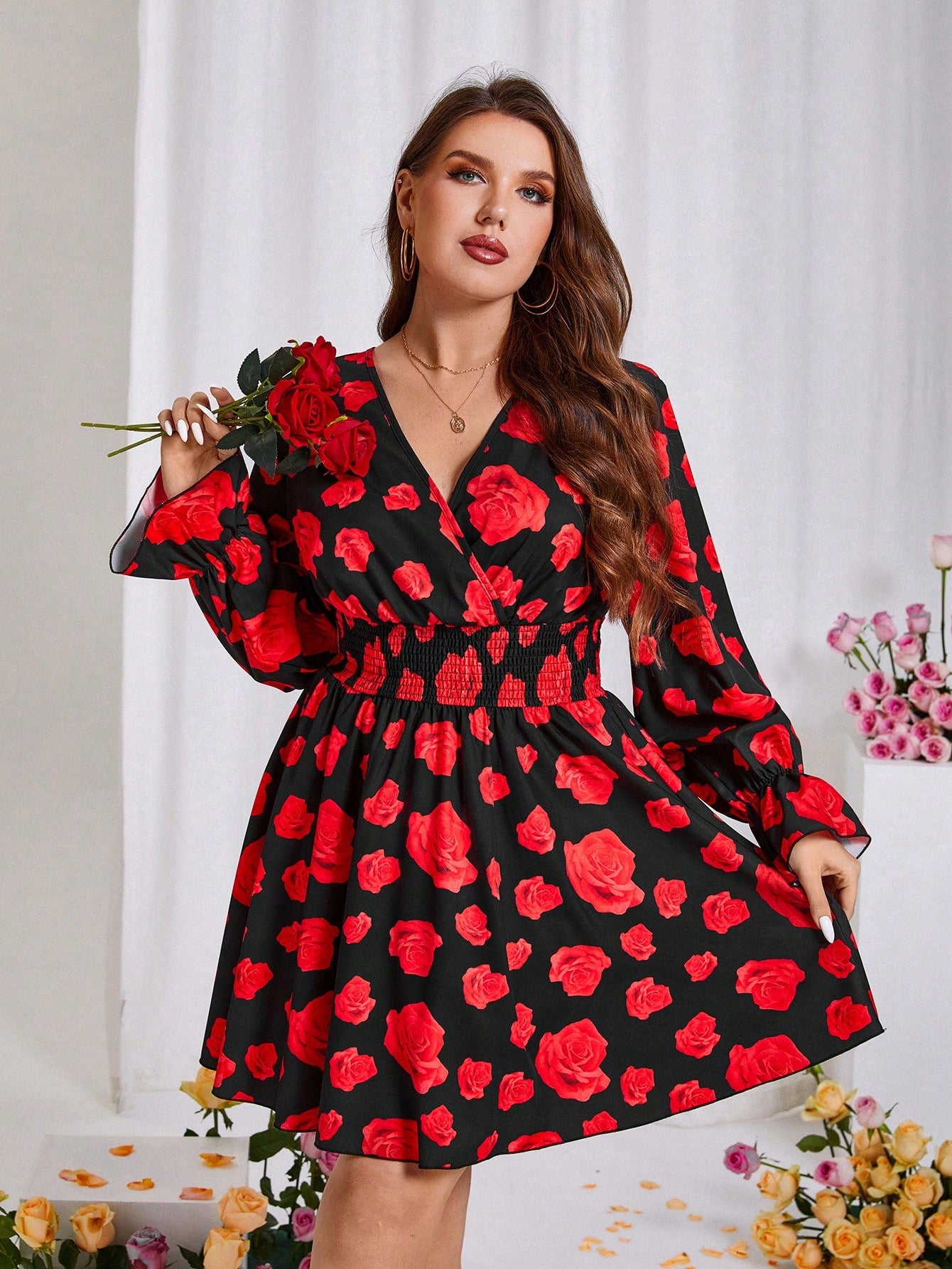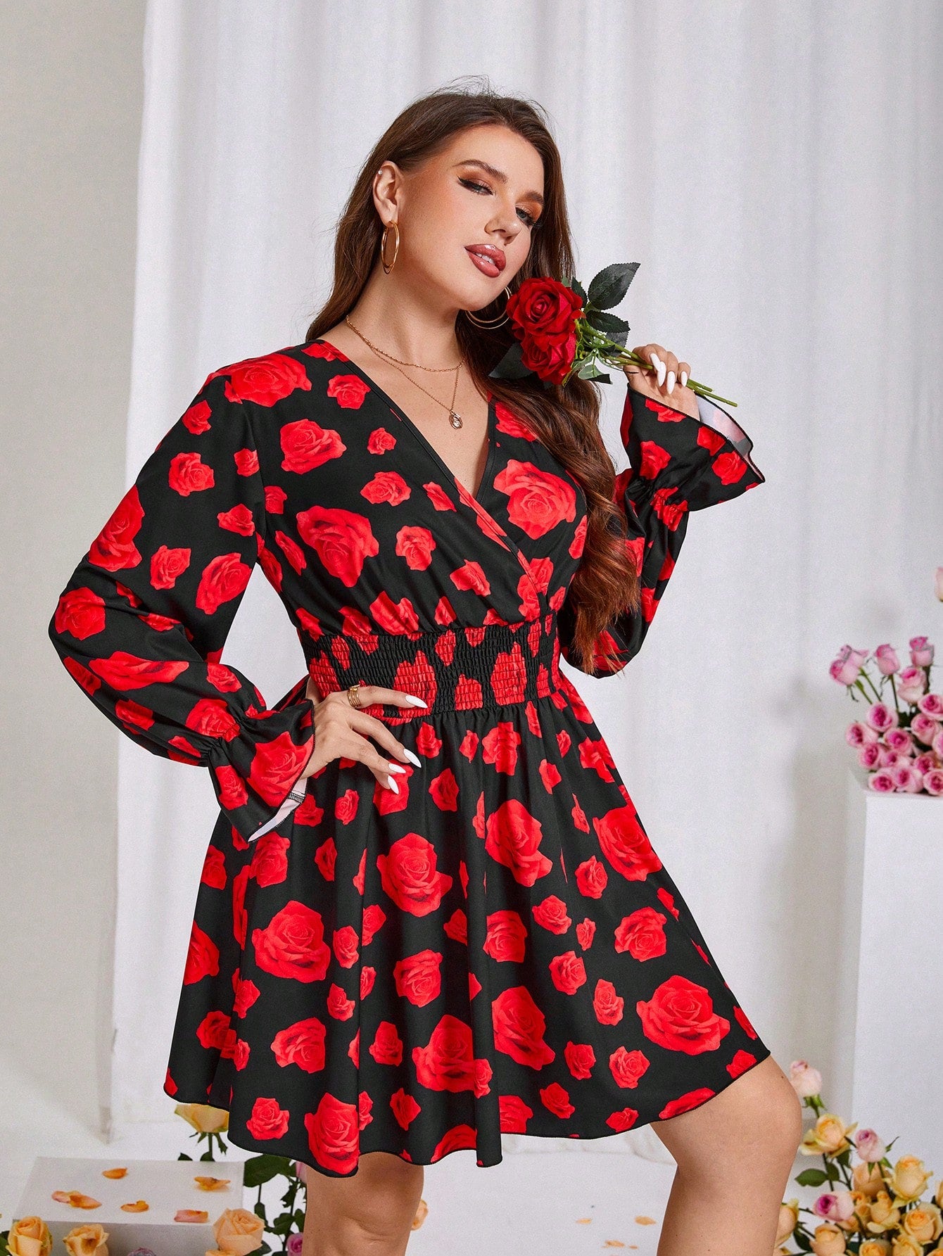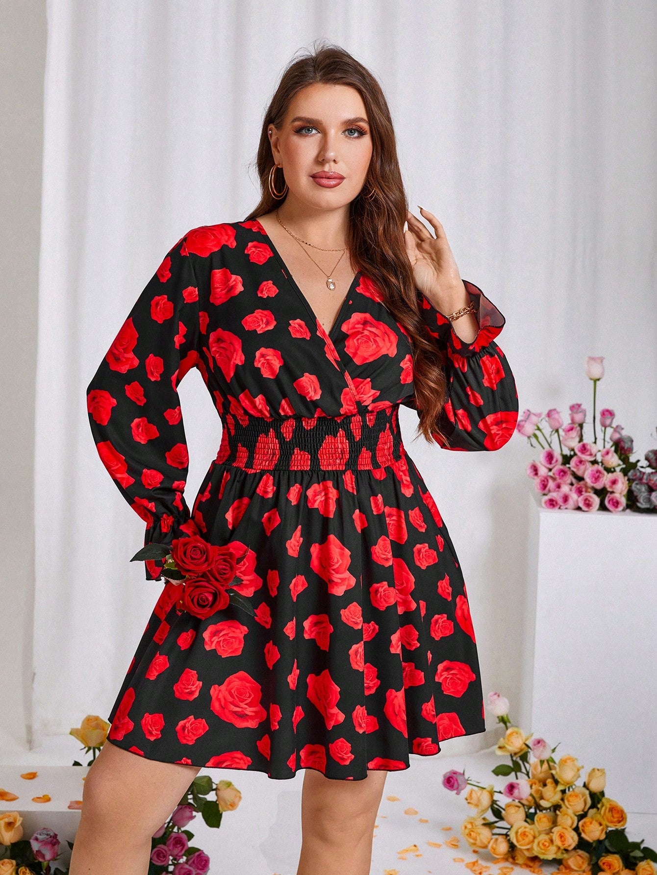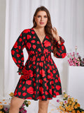 Floral Elegance: Plus Size V-Neck Long Sleeve Dress for Spring & Valentine's Day