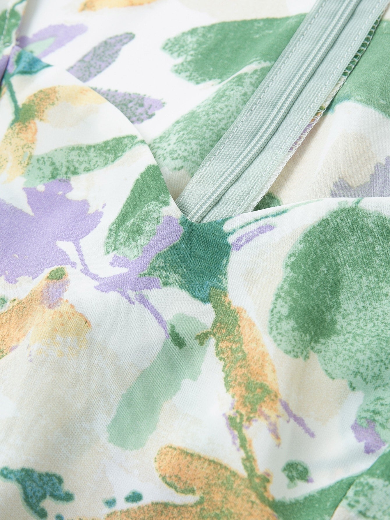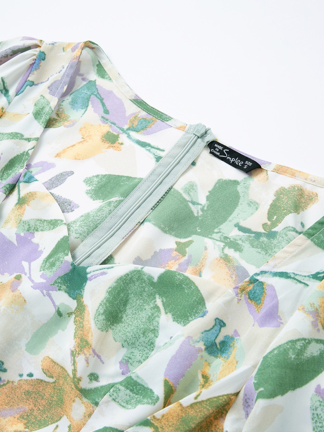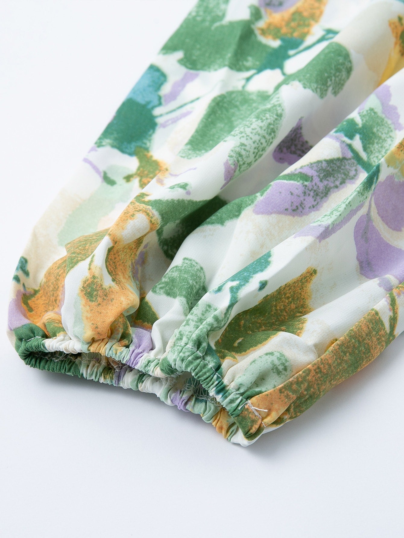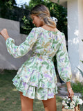 Floral Print Lantern Sleeve Romper with Belted Layered Ruffles