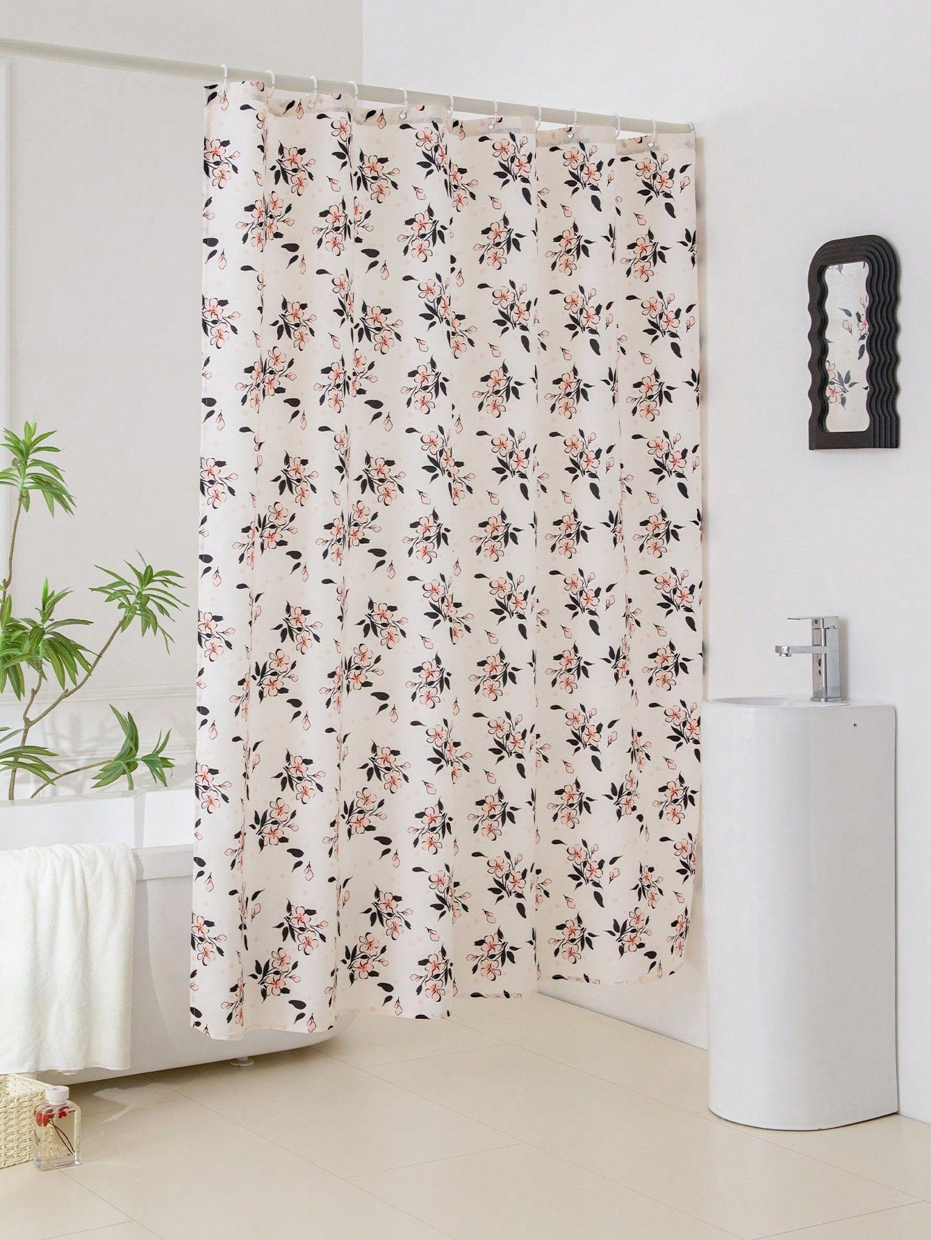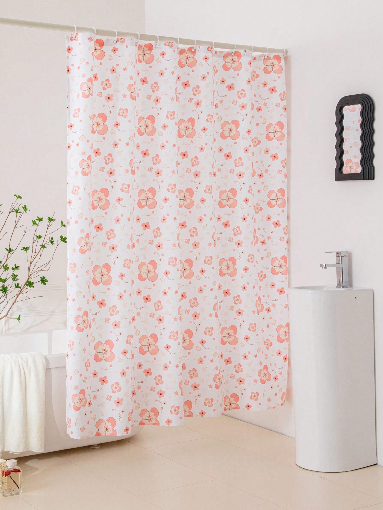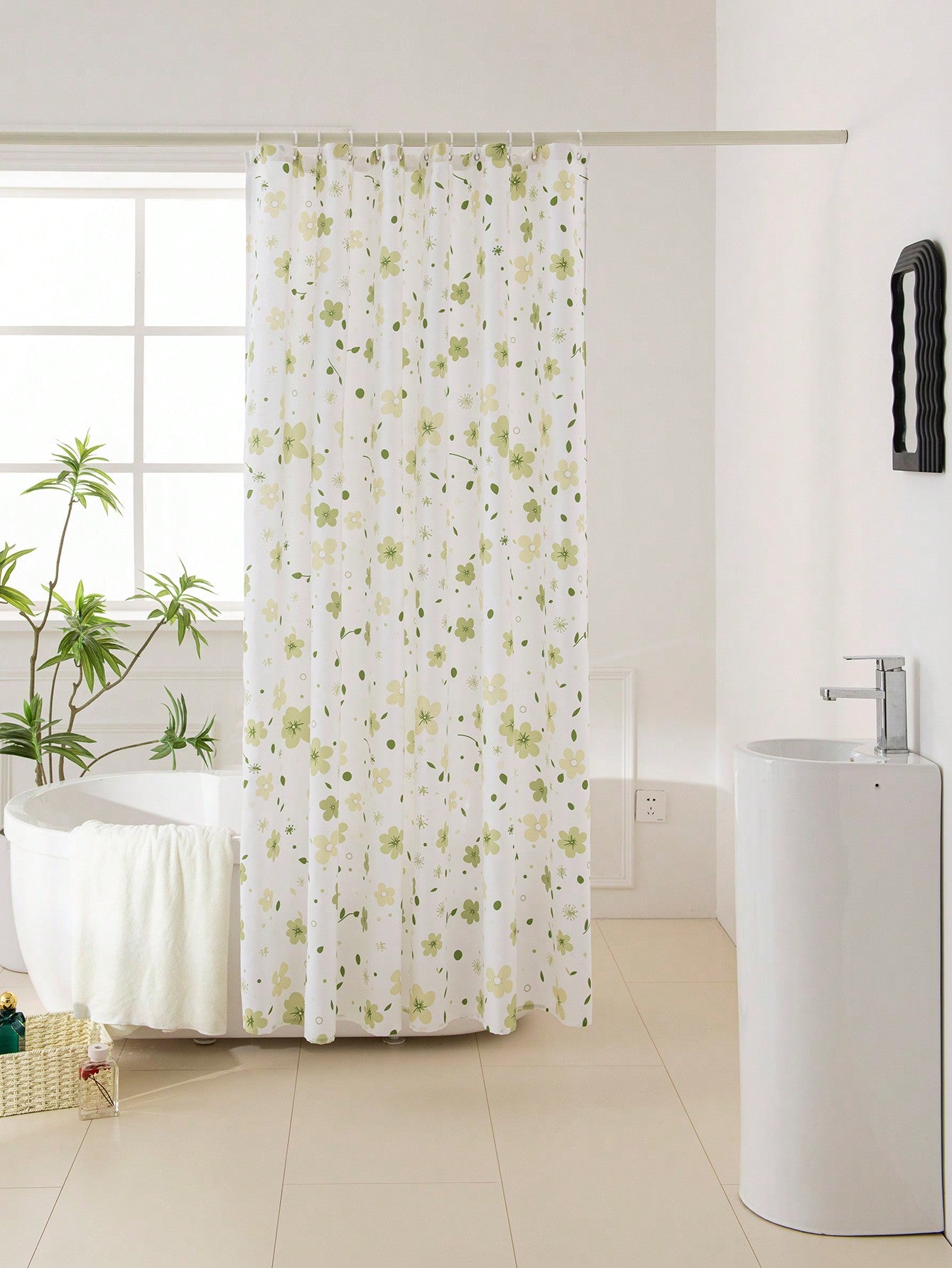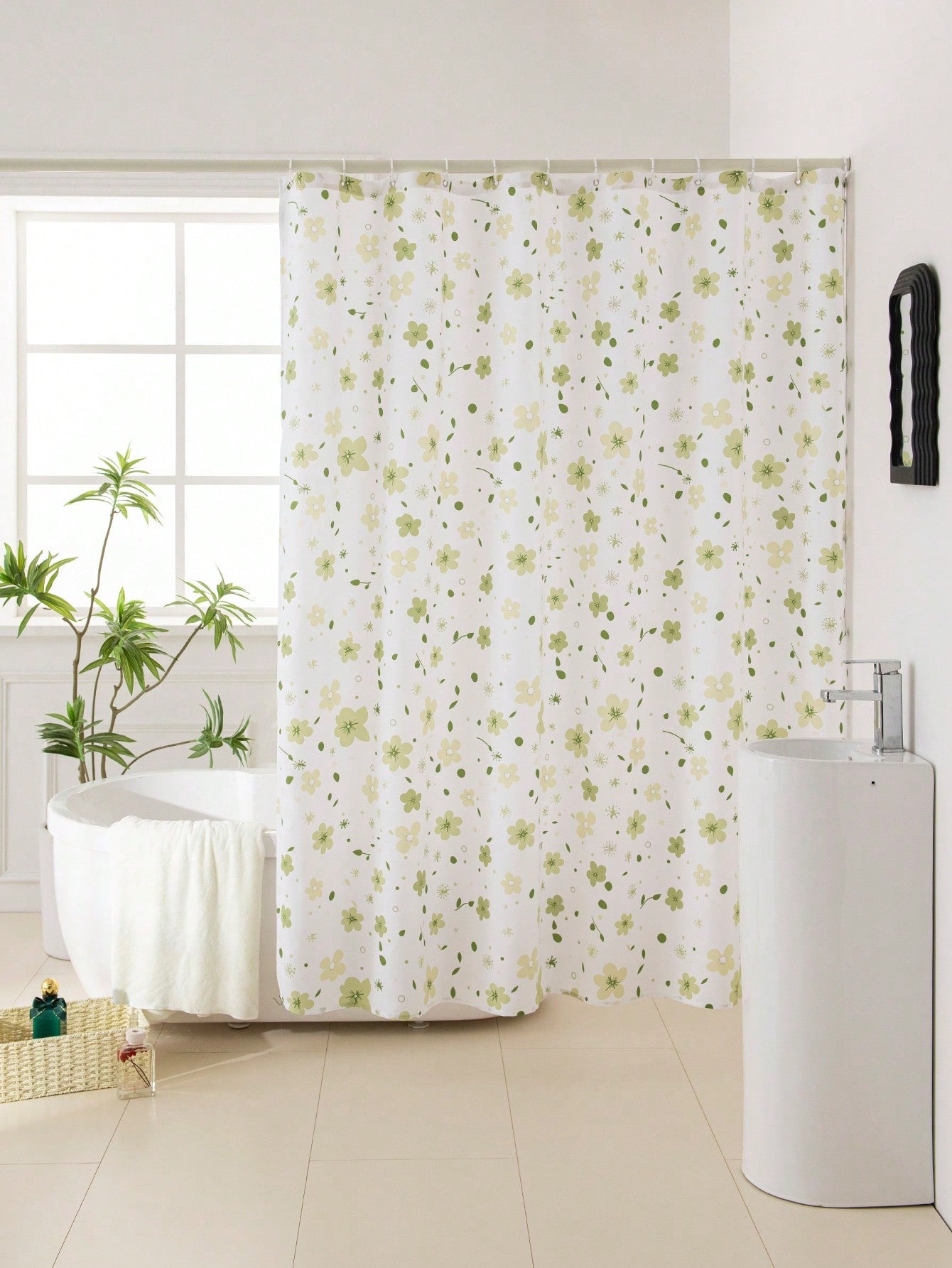 Shower Curtain. Made with high-quality materials, this curtain not only adds a touch of elegance to your bathroom but also keeps your floors dry. Enjoy a beautiful and functional shower experience with our Fresh Floral Shower Curtain."