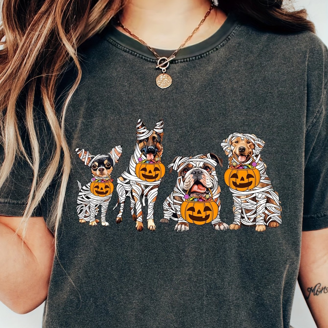 Frightfully Fun Halloween Pets Neck T-Shirt: Casual Short Sleeve Top for Women's Clothing