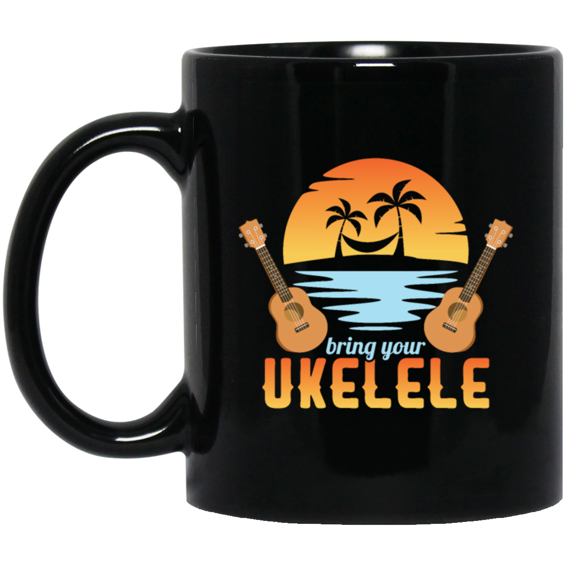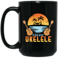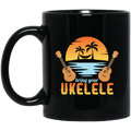Funny Ukulele Beside The Beach And Palm Tree Hawaiian Musician Black Mug
