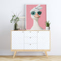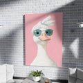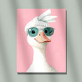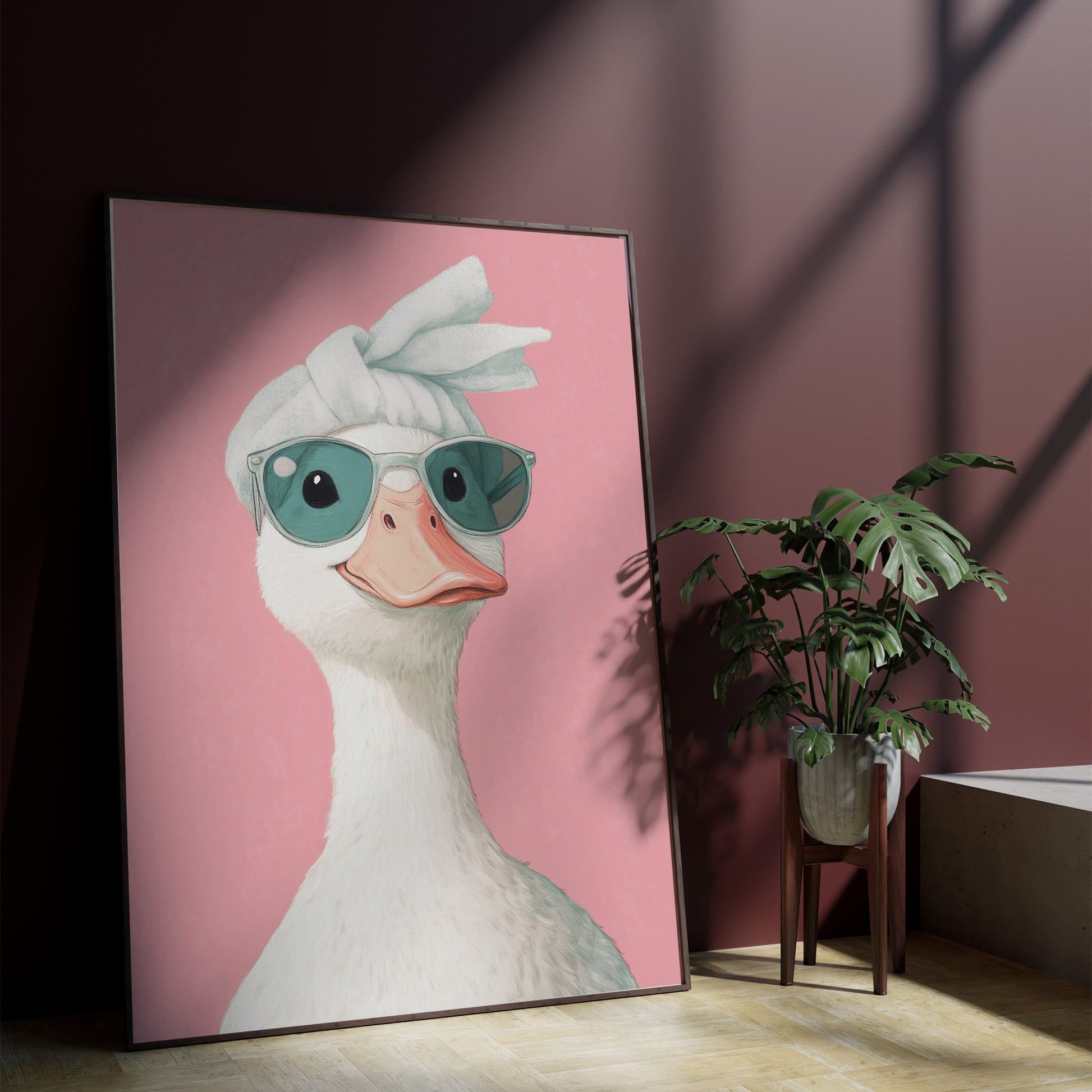 A charming and humorous digital illustration of a stylish white goose. The goose is depicted wearing a chic white headwrap and retro teal-tinted sunglasses, posing confidently against a soft pastel pink background. This whimsical artwork captures a playful "spa day" or "cool summer" vibe, making it a perfect addition to a bathroom, vanity area, or any modern space that needs a touch of fun and personality.