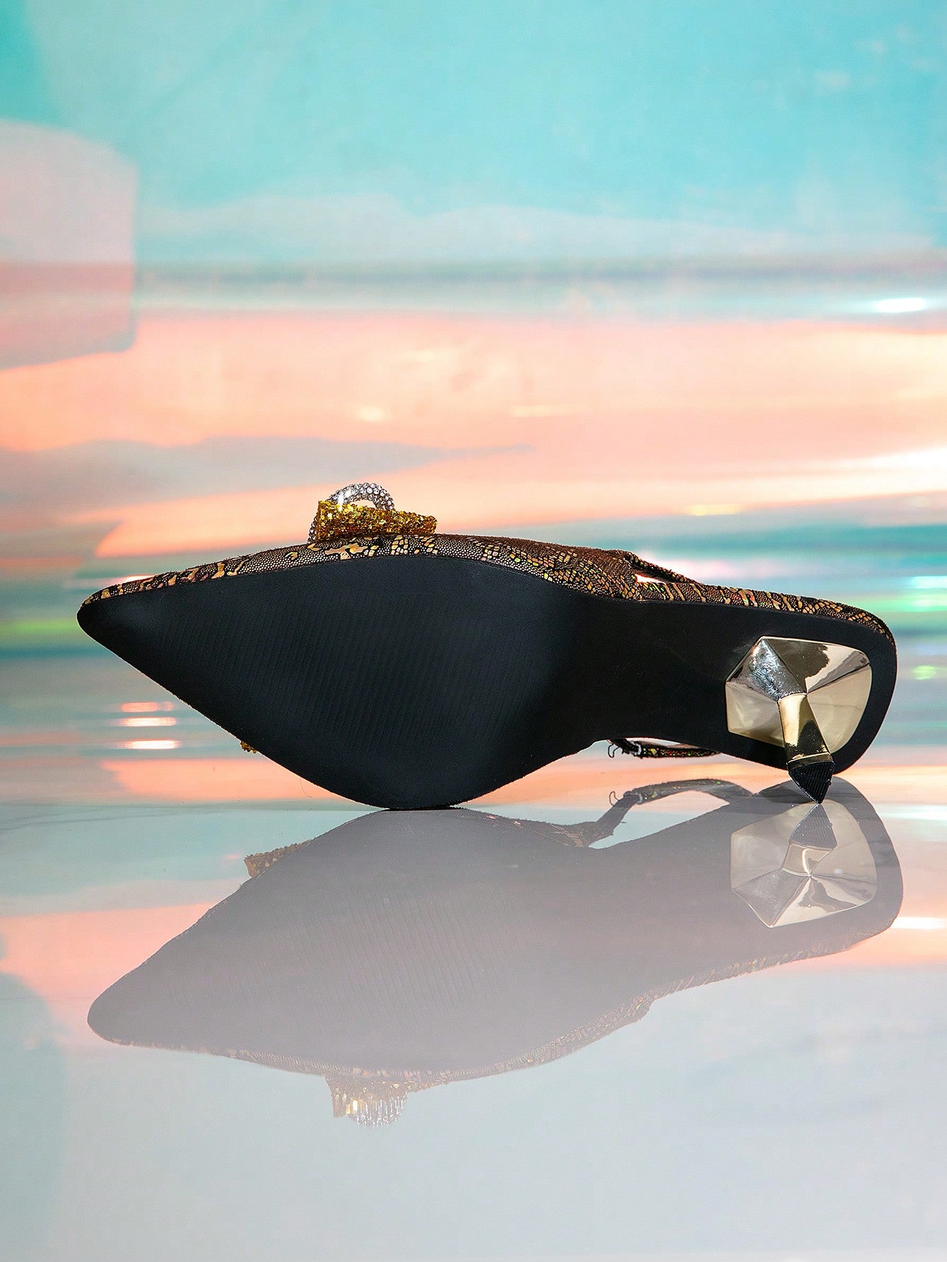 Step into glamour with these stunning Gold Electroplated Stiletto Heels. Featuring a sleek snake skin design, these heels are perfect for evening banquets! With their unique style and eye-catching shine, you'll be the star of the show. Elevate any outfit and turn heads wherever you go.