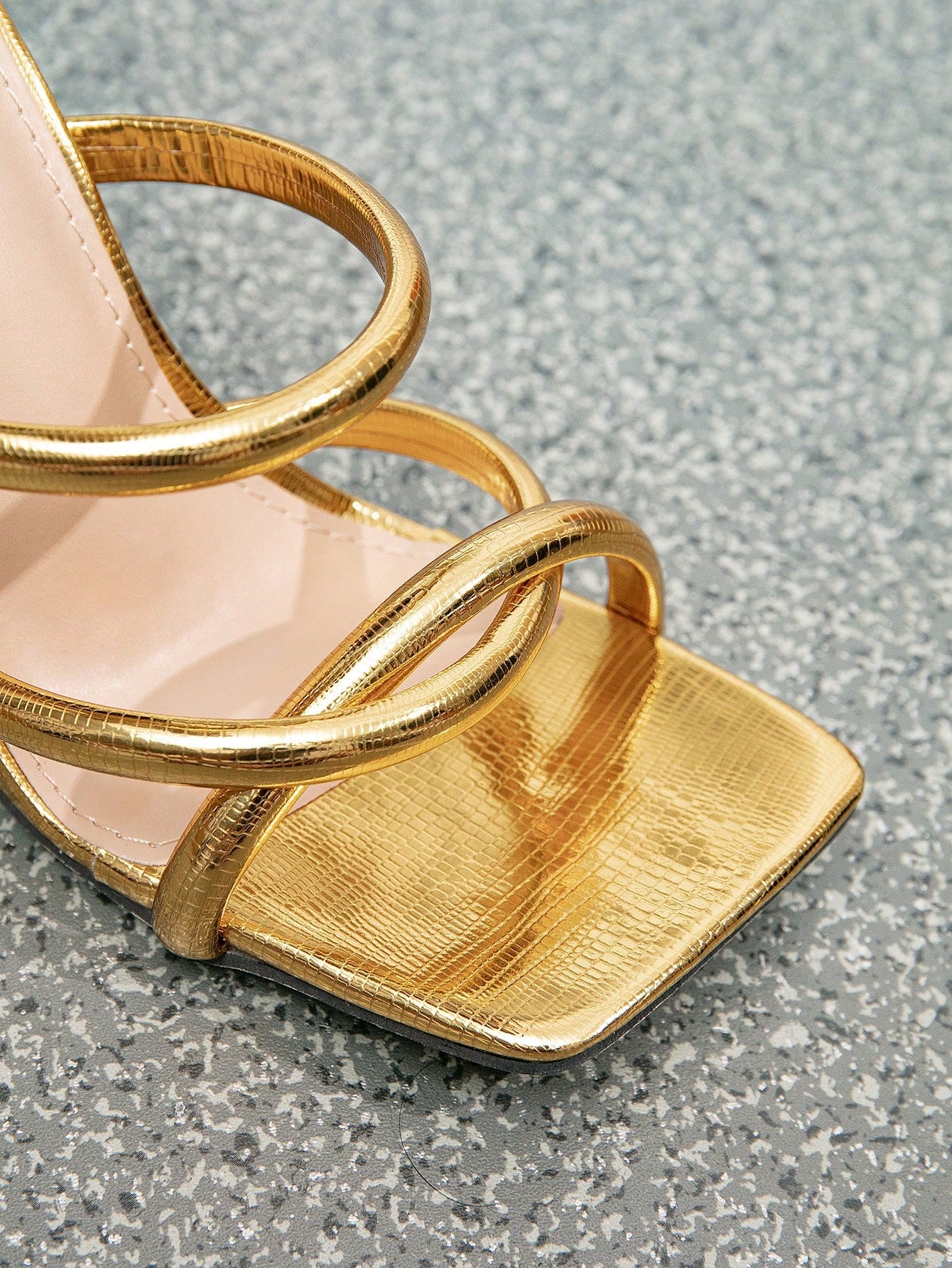 Elevate your style with our Glamorous Gold Heeled Sandals for Women. Featuring a metallic lizard embossed design and twist-strap mule silhouette, these sandals offer a touch of luxury and sophistication. The perfect addition to any outfit, these heels will add a stylish and eye-catching element to your wardrobe.