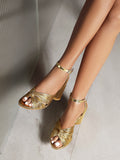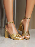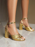 Introducing Glamorous Summer: Women's Metallic Twist-Decor Sculptural Heeled Ankle Strap Sandals. Elevate your summer style with these unique sandals featuring a twist-decor design and sculptural heel. The metallic finish adds a touch of glamour to any outfit. Step into sophistication and comfort with the ankle strap for added support.