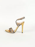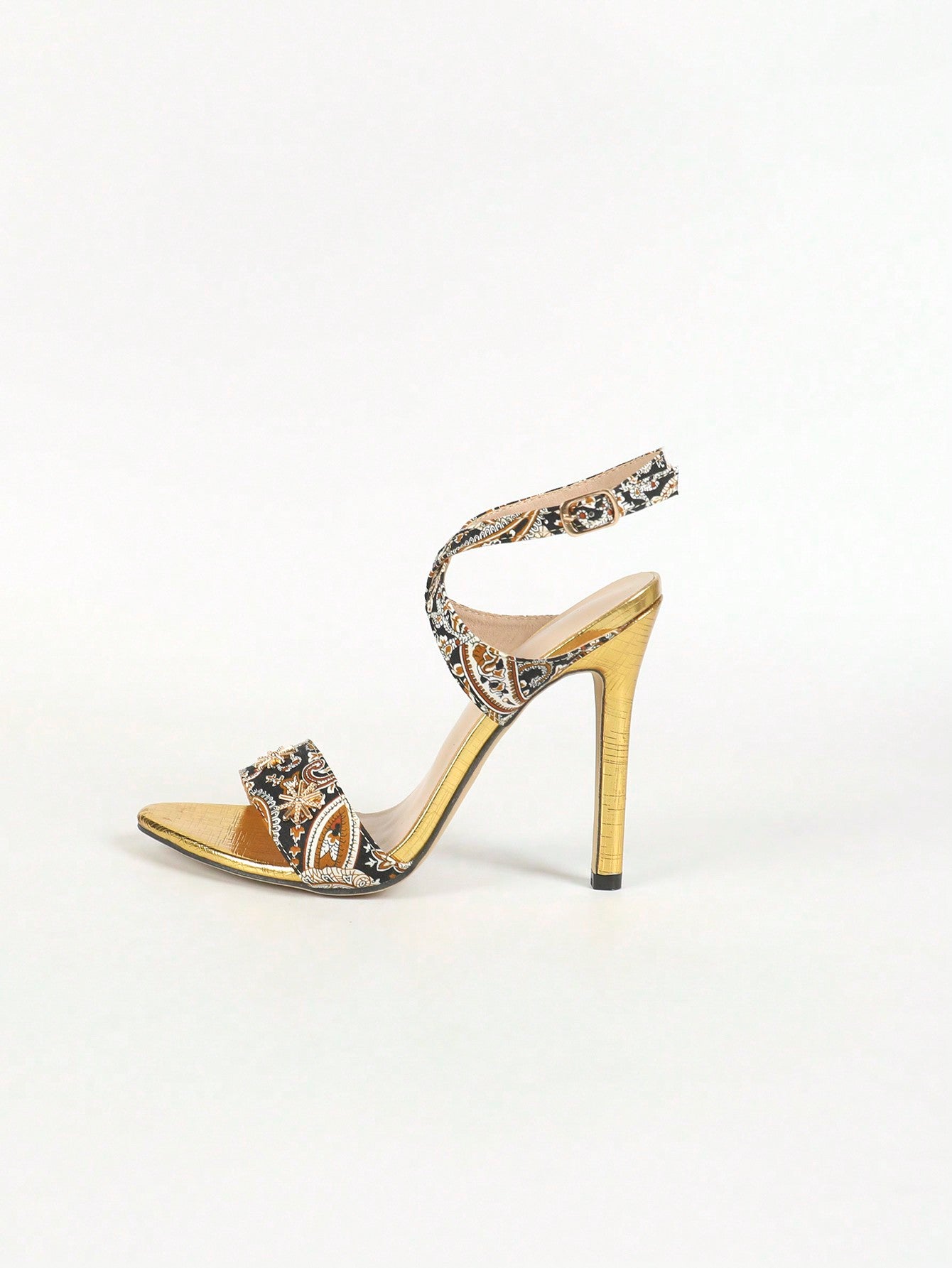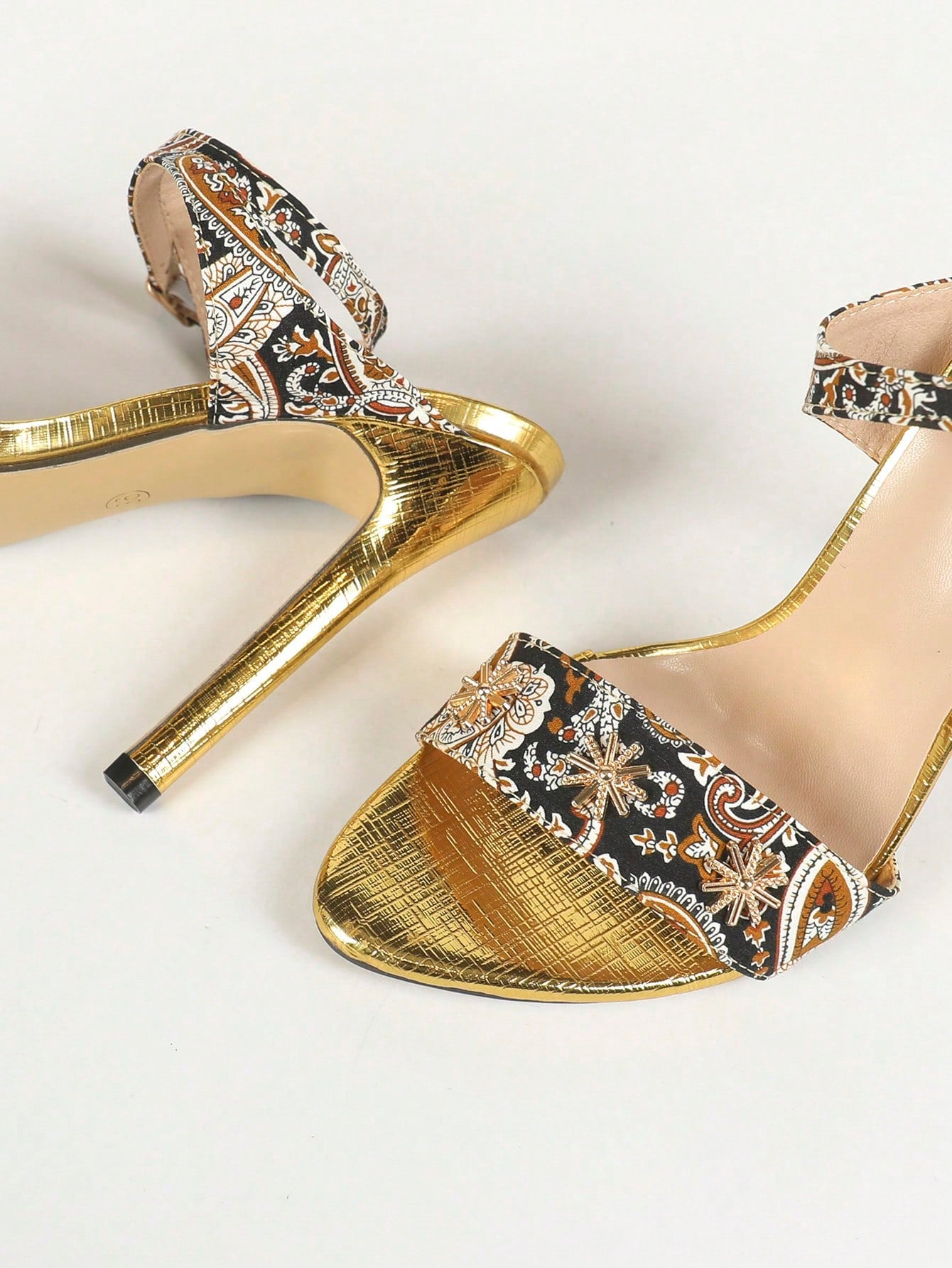 Golden Blossom: Women's Floral Print Stiletto Sandals