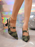 Green Camouflage Rhinestone Decor High Heel Sandals: Elegant Plus Size Women's Summer Mules