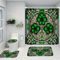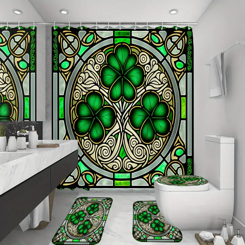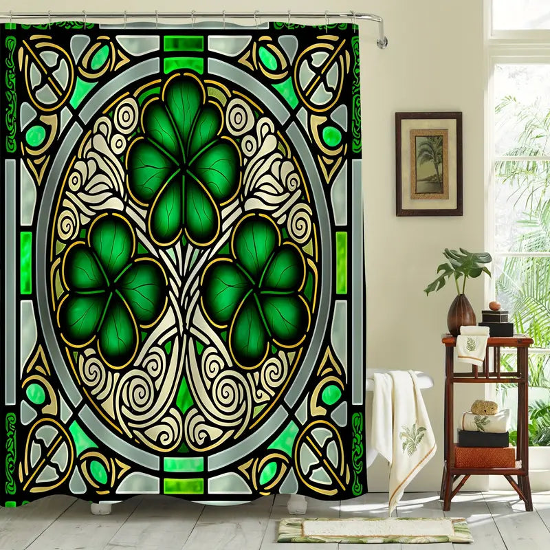 Green Clover Leaf Pattern Shower Curtain Set, Waterproof Shower Curtain With 12 Hooks