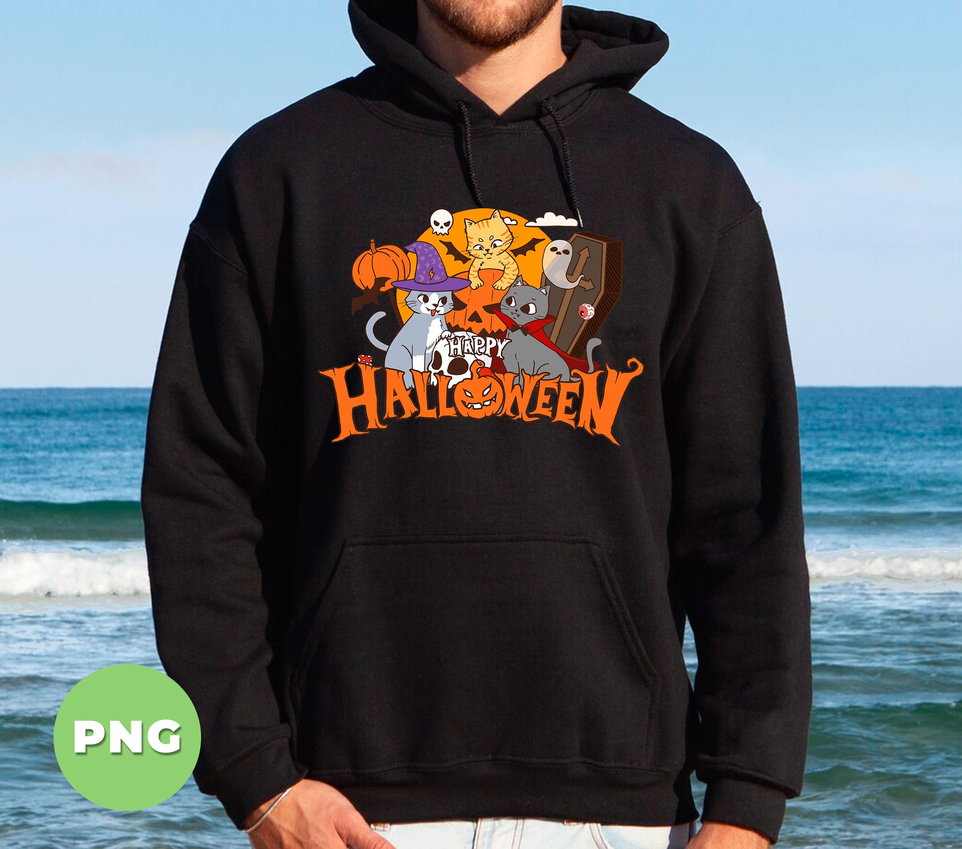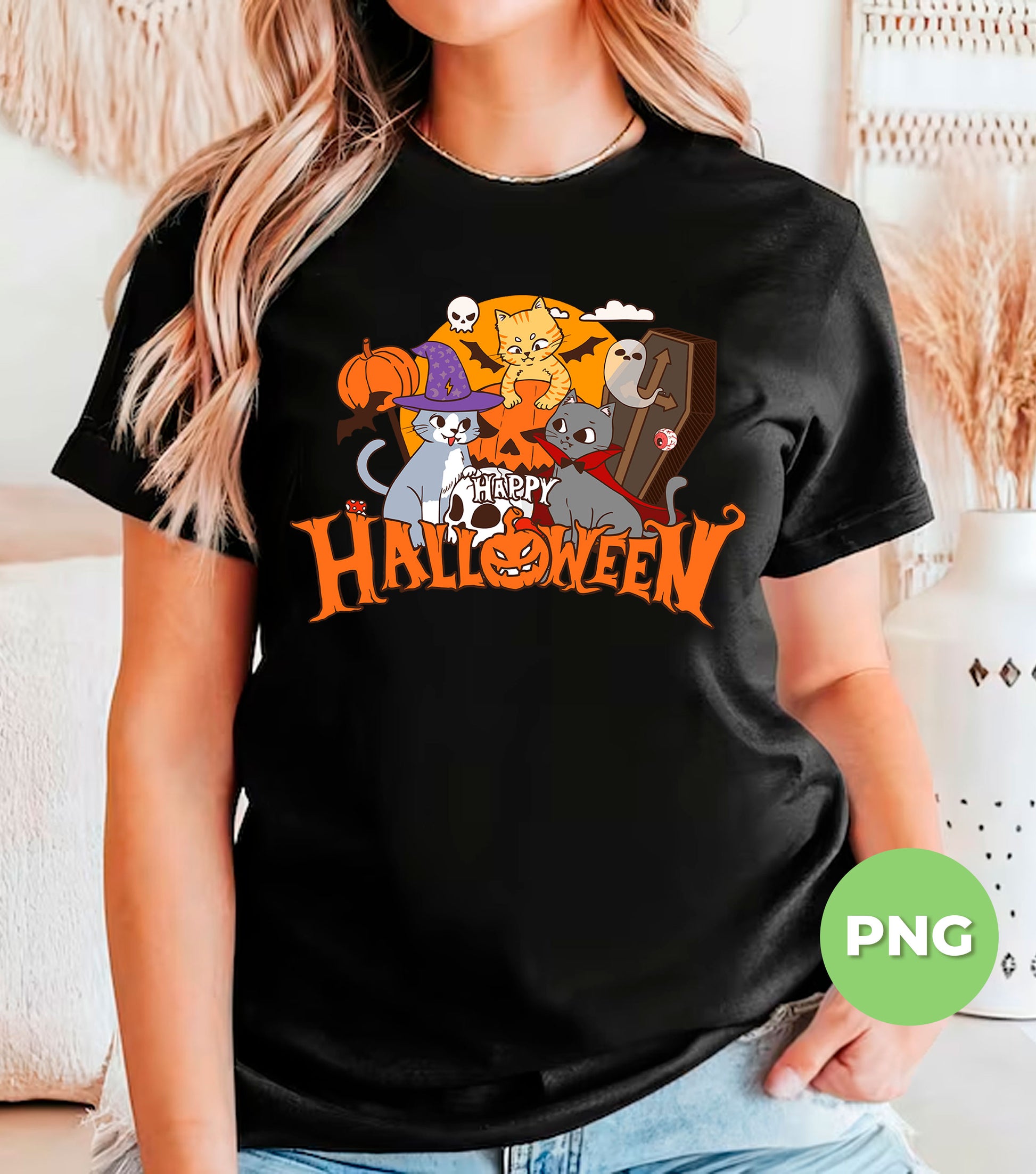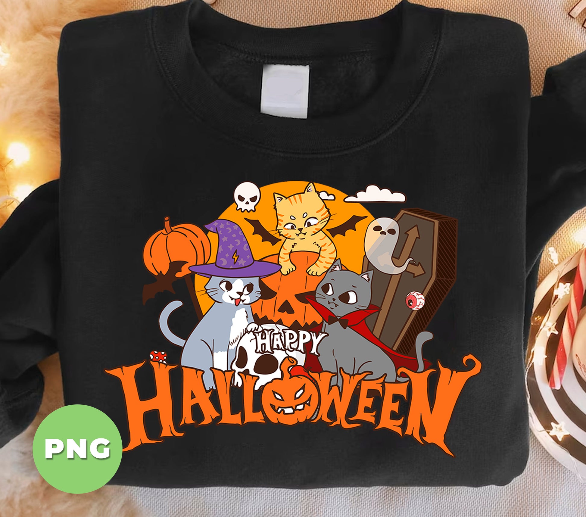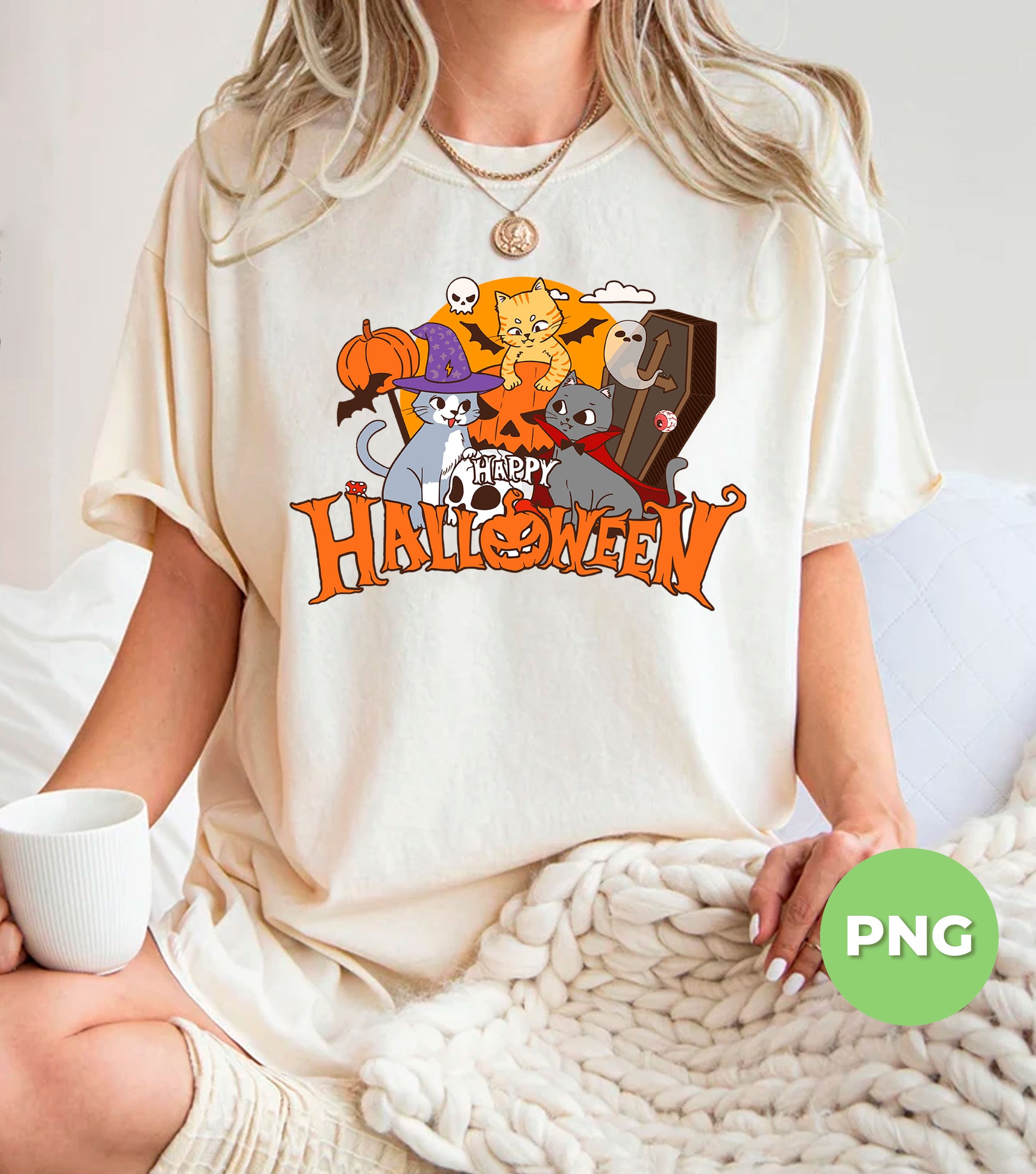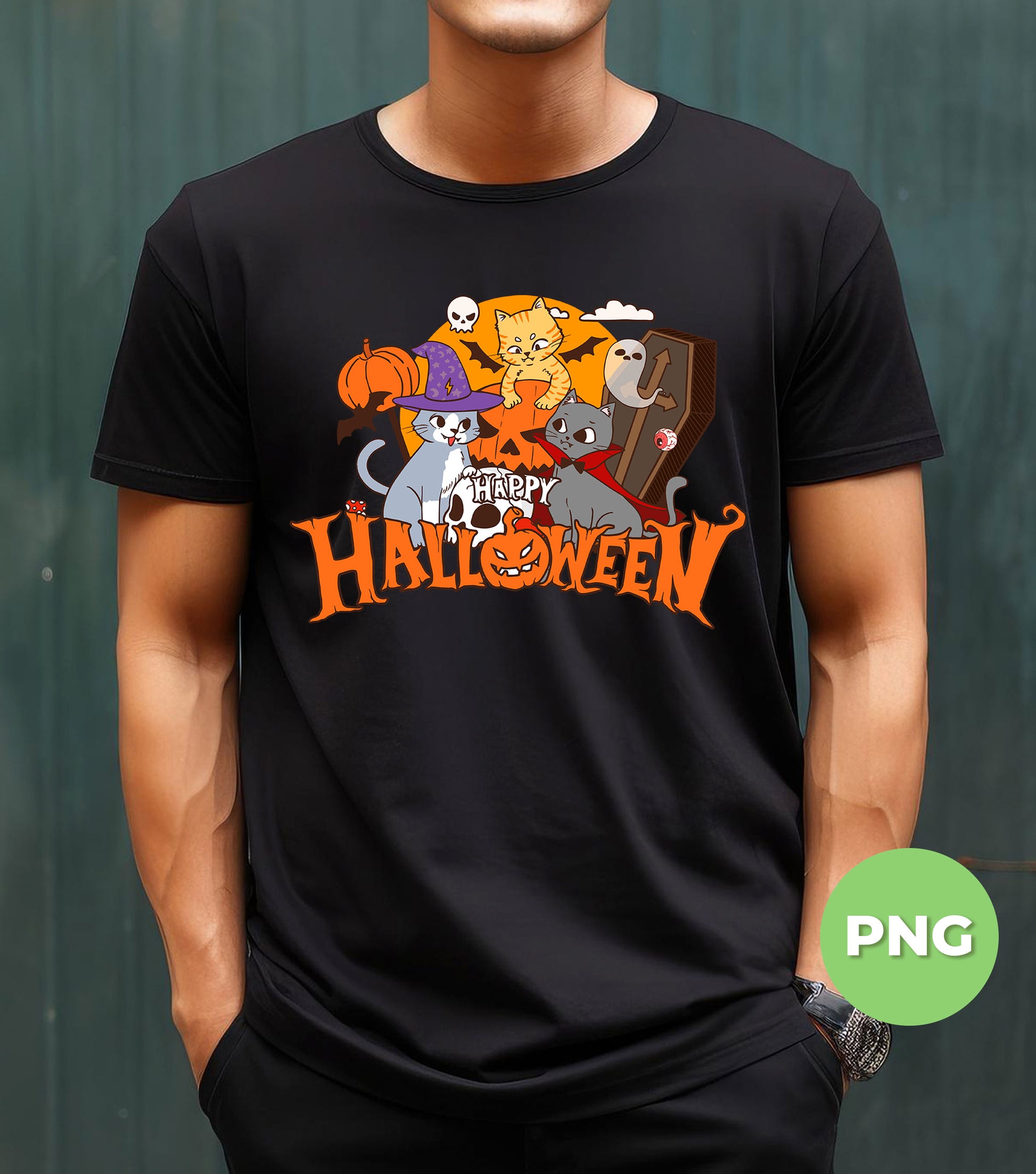 Happy Halloween Cats PNG, Cute Witch Vampire Cat Sublimation Design, Funny Spooky Kitty Pumpkin Art For Kids & Cat Lovers