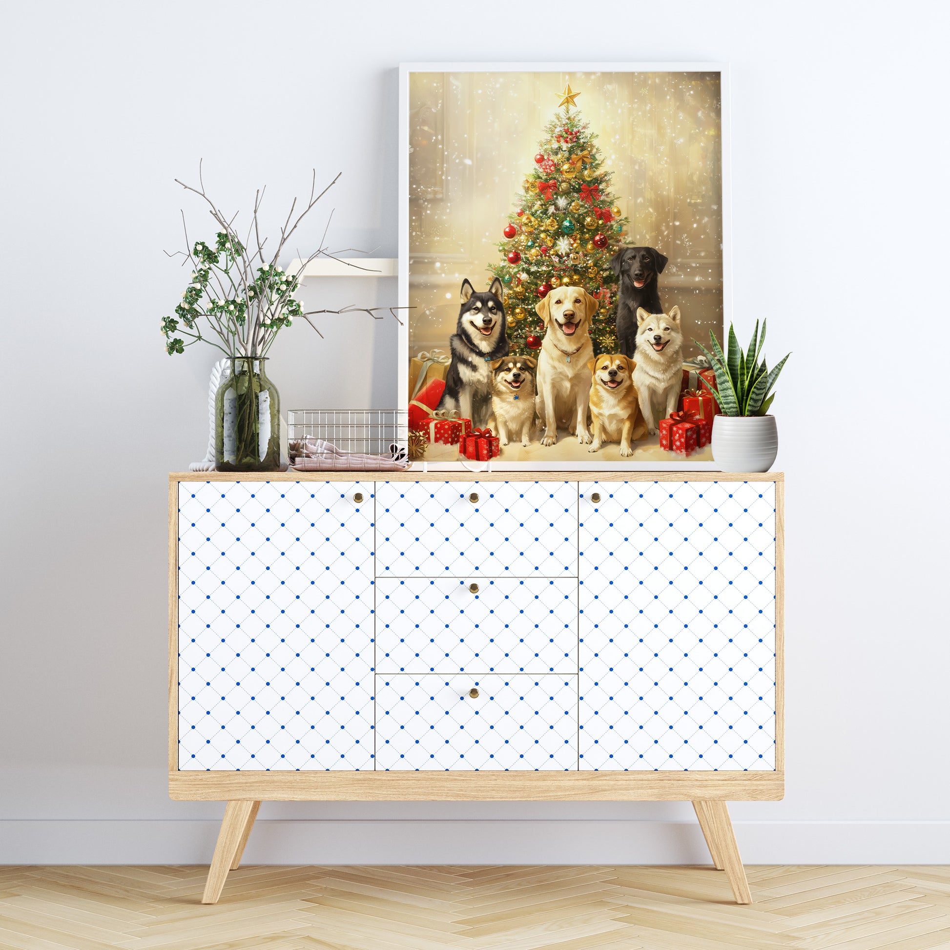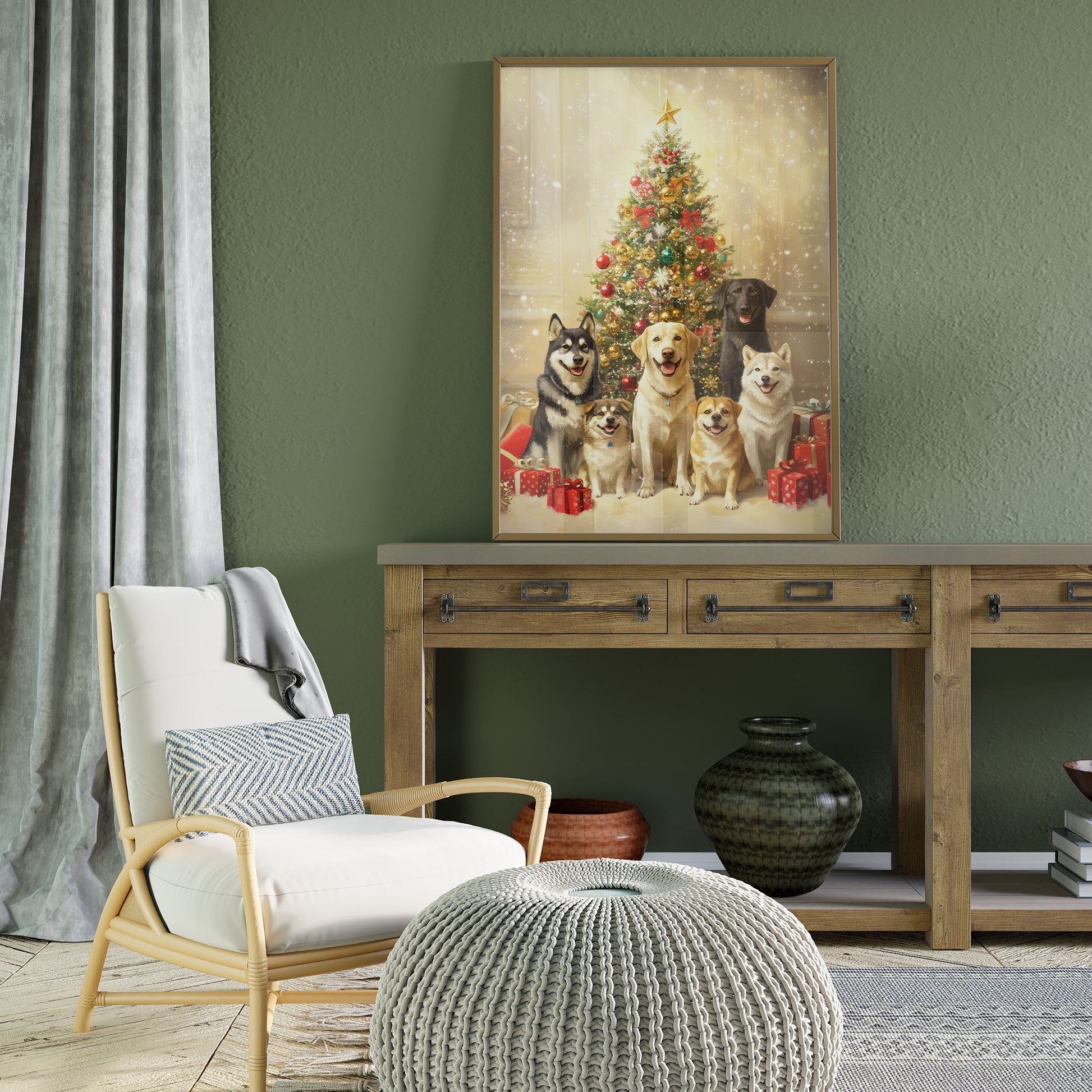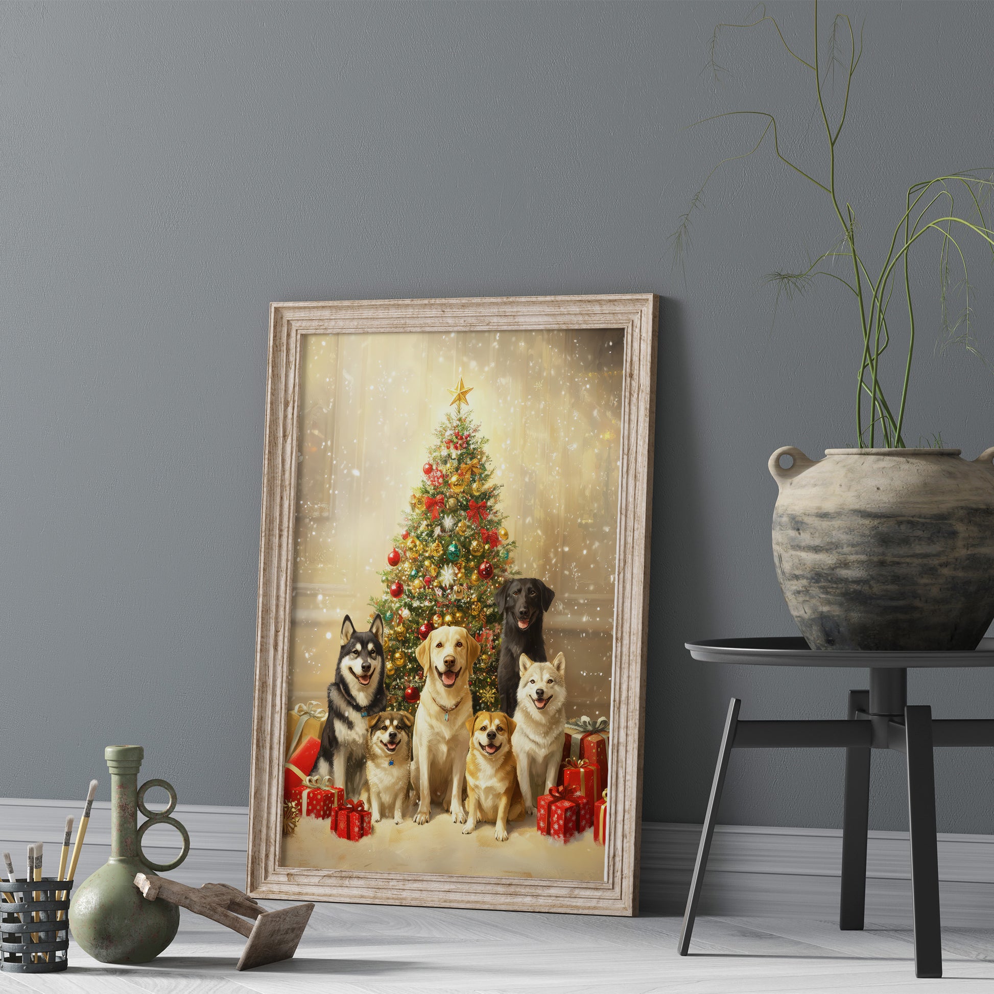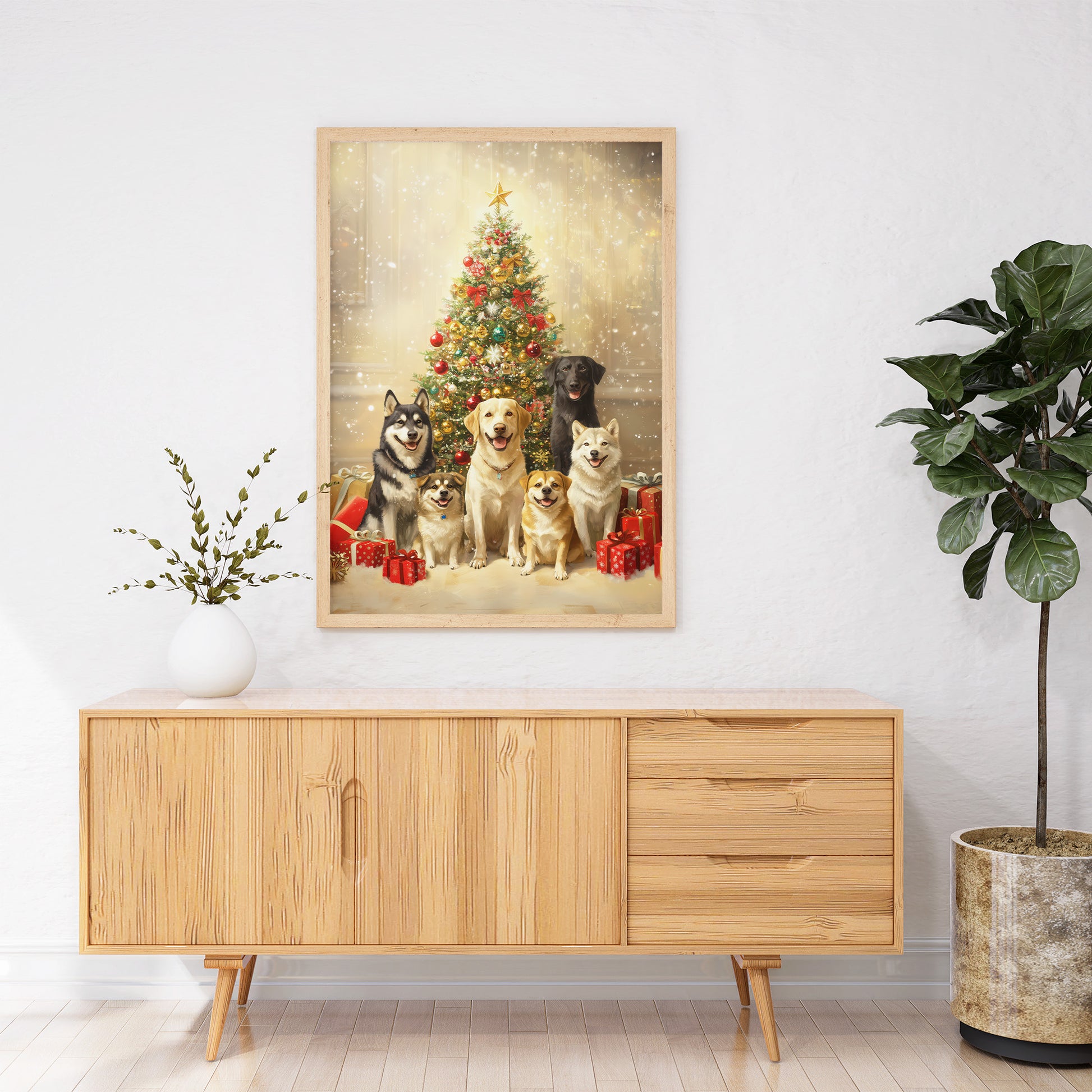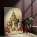 A cheerful and heartwarming digital portrait featuring a diverse group of six dogs (including a Labrador Retriever, Husky, and smaller breeds like Corgi or Shiba Inu mixes) sitting happily and posing together. They are positioned in front of a richly decorated, sparkling Christmas tree topped with a golden star, surrounded by wrapped red and gold gifts. The scene is bathed in a bright, warm, and festive glow, emphasizing the holiday cheer and the dogs' joyful expressions. This artwork is perfect for seasonal decor, dog lovers, and adding a cozy, festive touch to any space.
