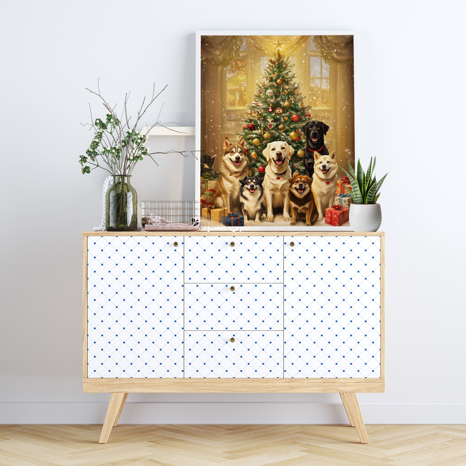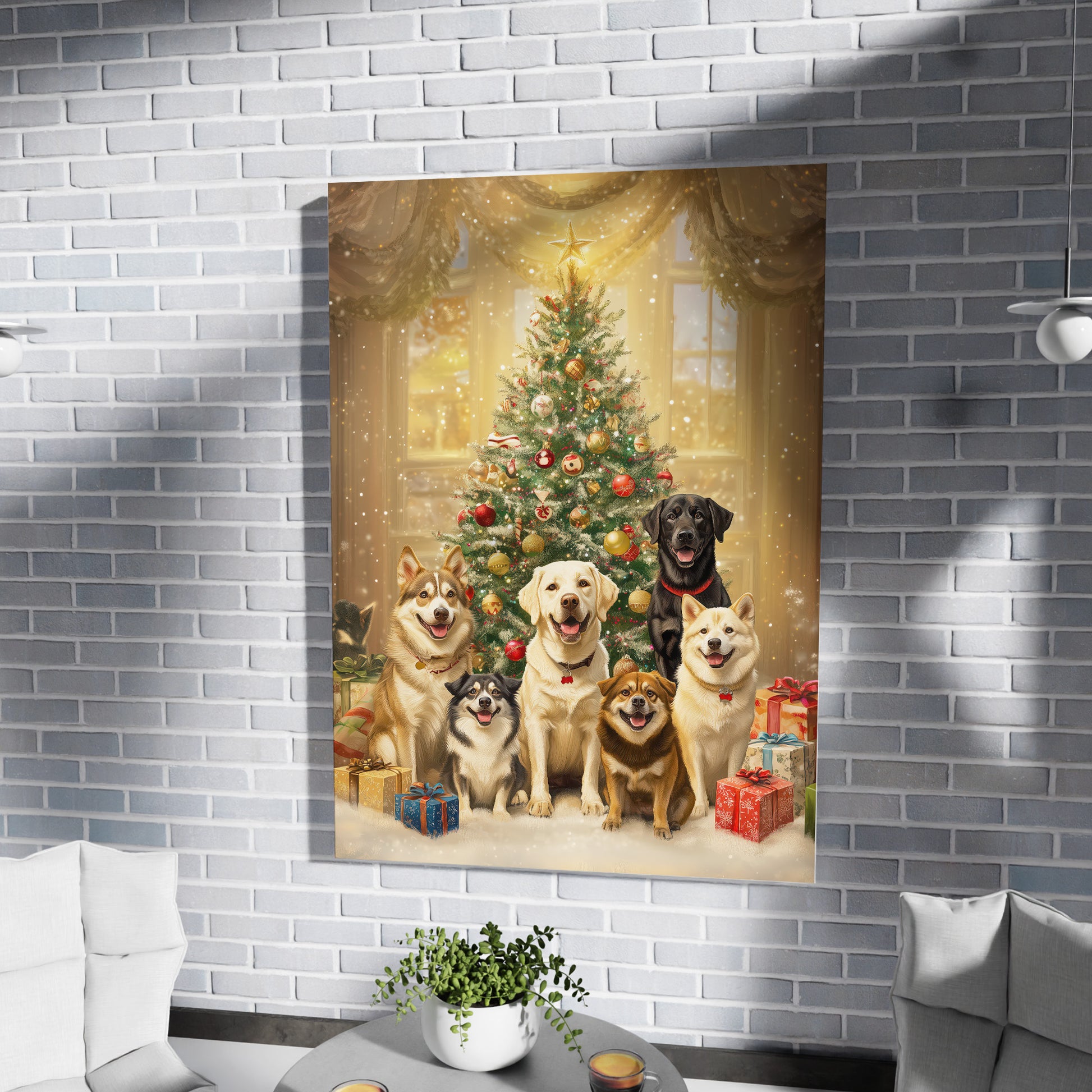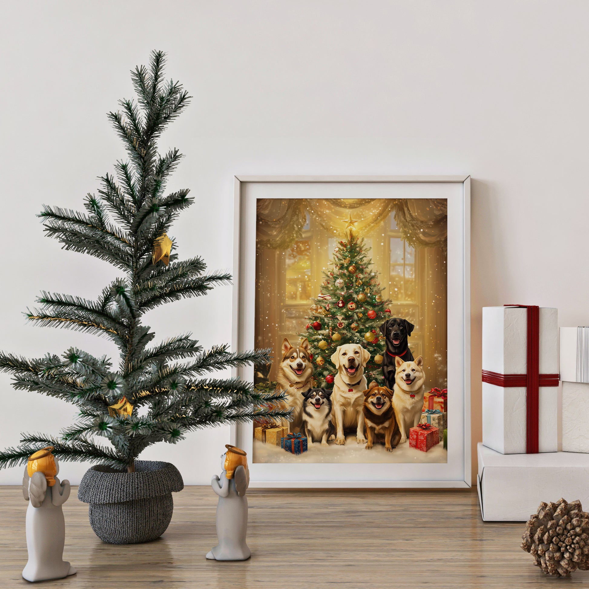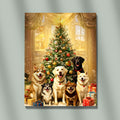 A festive and traditional digital portrait capturing a diverse group of six happy dogs (including a Labrador Retriever, Husky, and smaller mixes) gathered around a beautifully decorated, classic Christmas tree. The scene is set in a cozy, warmly lit room with a large window in the background, showing subtle falling snow outside. The tree is adorned with red, gold, and white ornaments, and presents are piled at the dogs' feet, emphasizing the joy and warmth of the holiday season. This artwork is perfect for traditional Christmas decor, pet lovers, and adding a classic festive atmosphere to any home.
