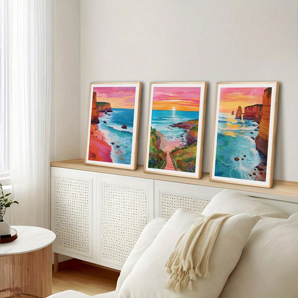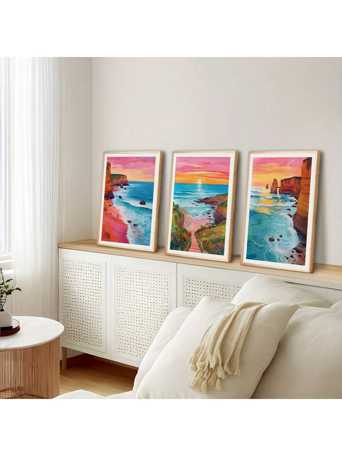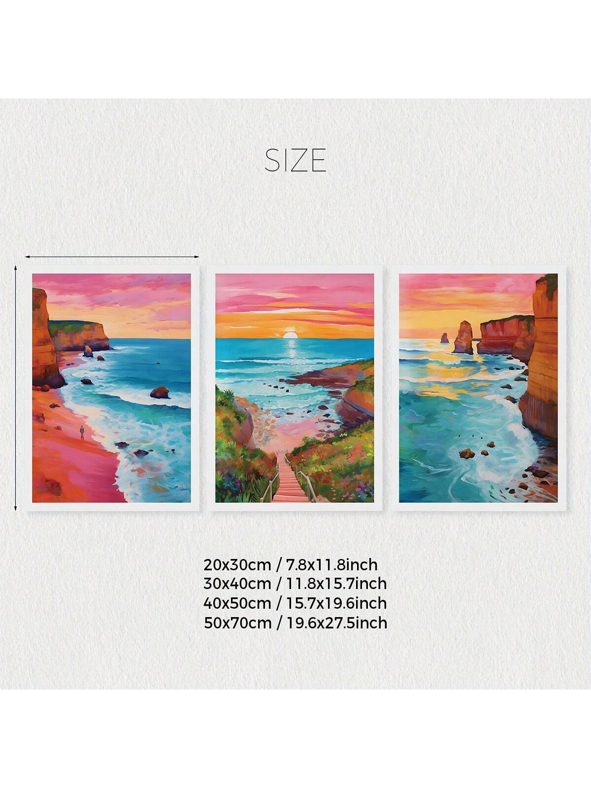 Experience the beauty of the horizon with our Horizon Sunrise Travel Scenery Art. This 3 piece set features colorful ocean illustrations that will transport you to a tranquil seaside atmosphere. Perfect for adding a touch of serenity to any room.