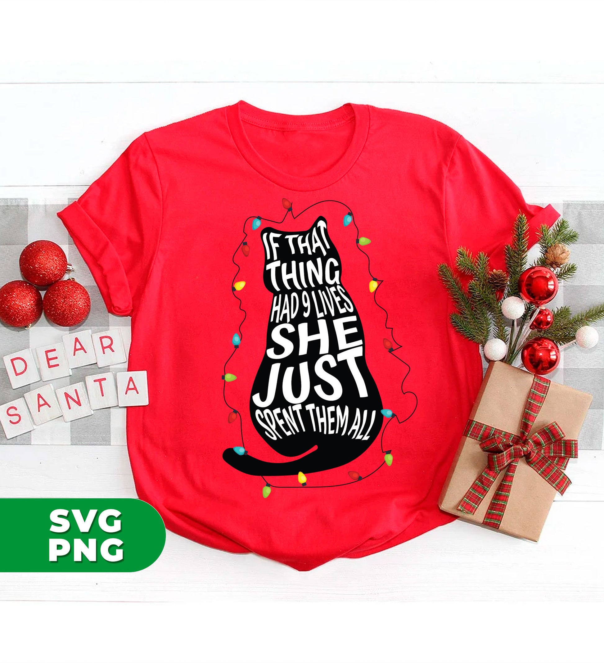 Discover the perfect addition to your holiday decorations with If That Thing Had 9 Lives, She Just Spent Them All Xmas Lights. This digital download includes high-quality png sublimation files for effortless customization. With 9 lives worth of use, these lights will be a timeless and unique addition to your Christmas display.