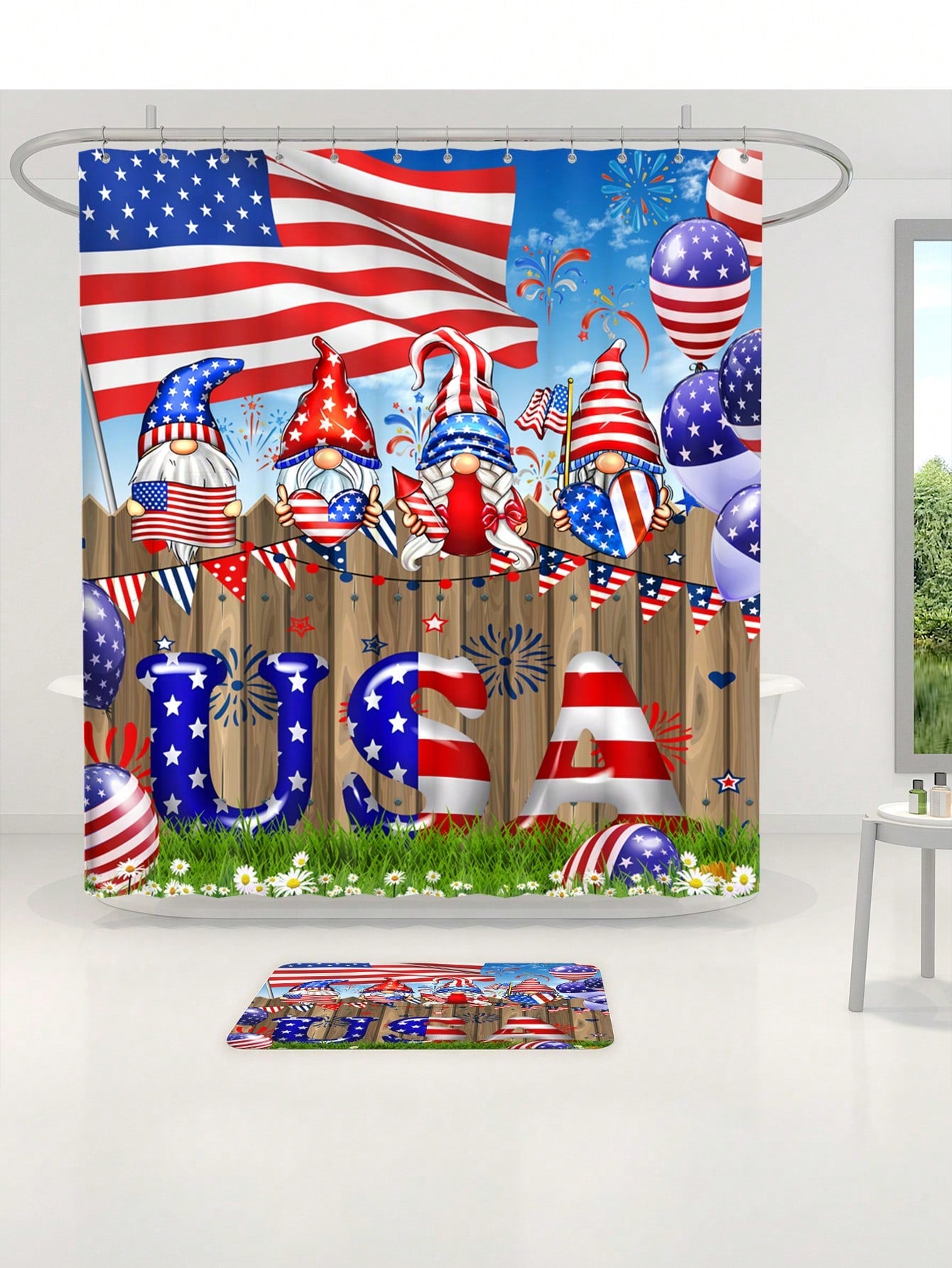 shower curtain and matching accessories, this set adds a touch of character and whimsy to any space. Perfect for celebrating Independence Day or adding a pop of color to your bathroom year-round."