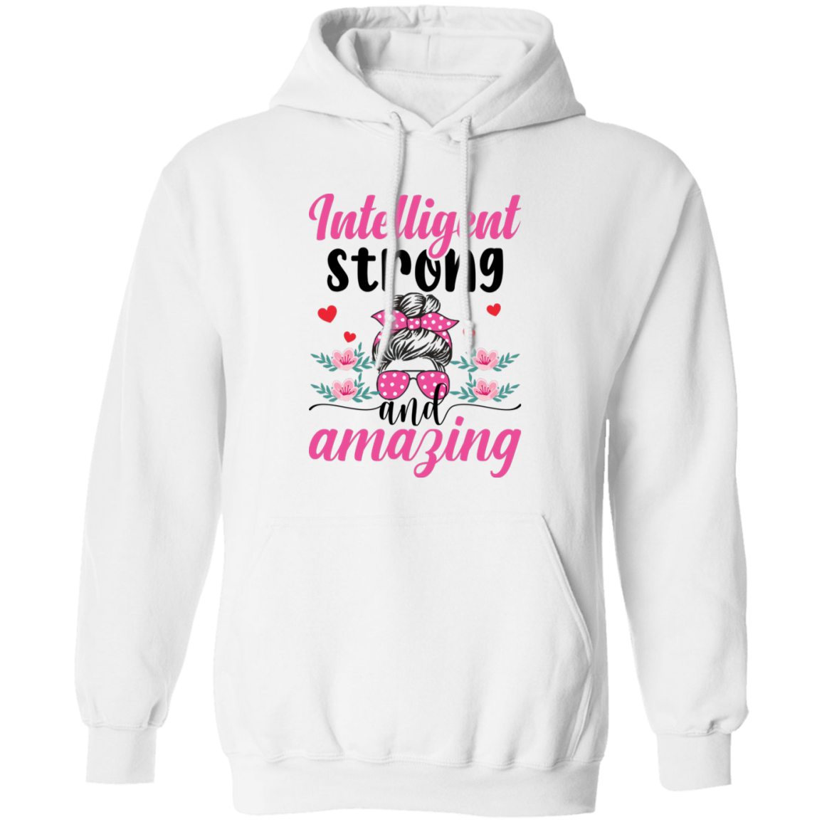 Intelligent Strong And Amazing, Messy Bun Girl, Pink Sunglasses, Valentine's Day, Trendy Valentine Pullover Hoodie