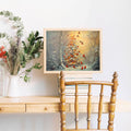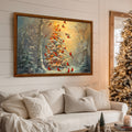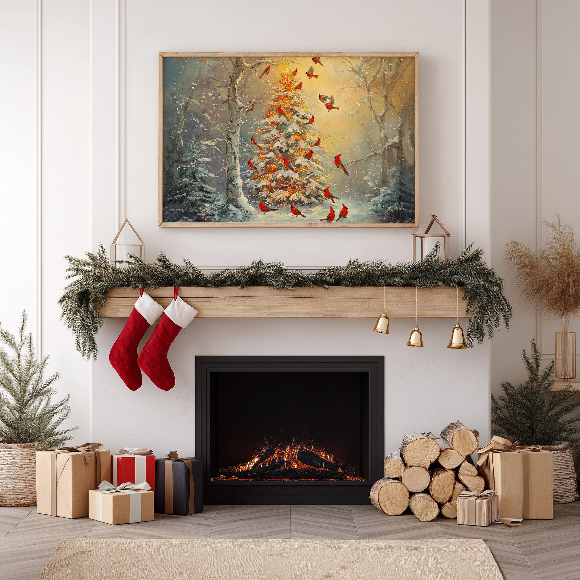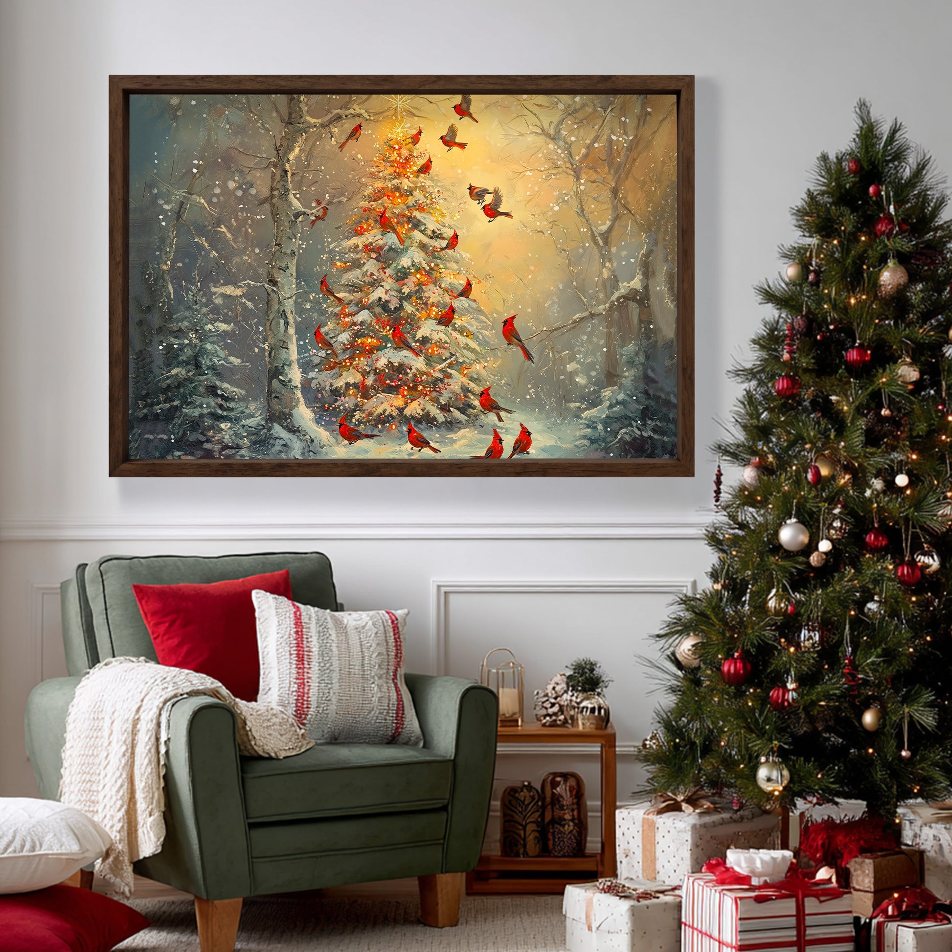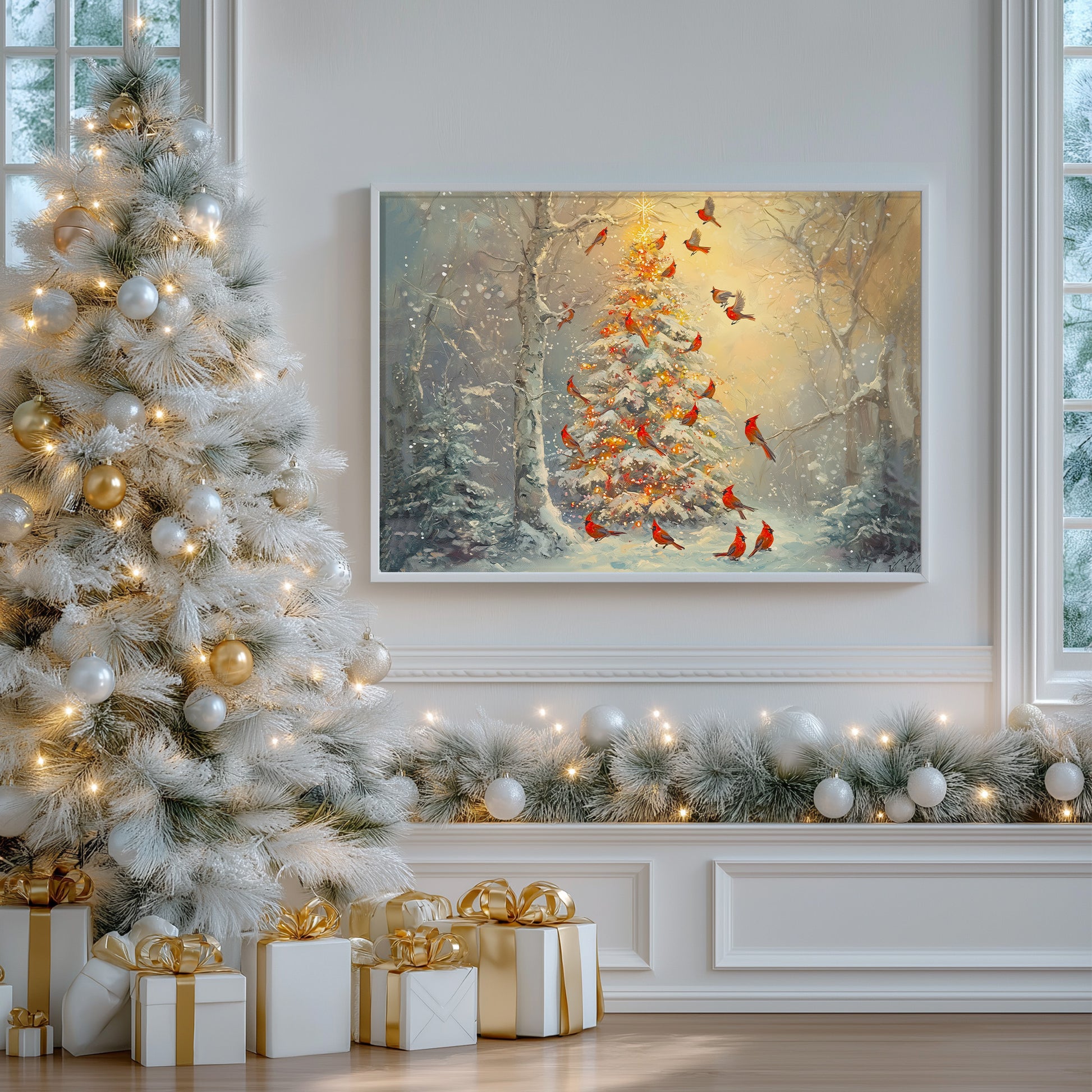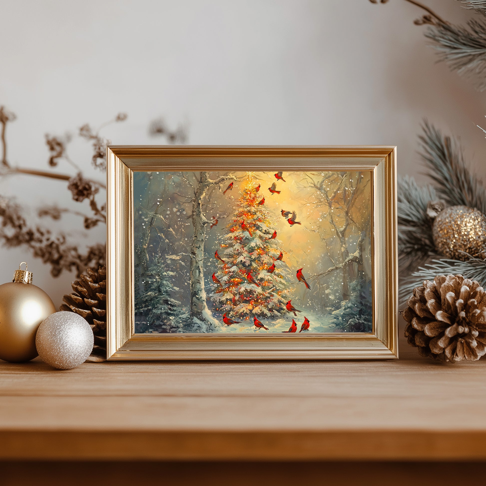 An enchanting oil painting of a snow-laden Christmas tree standing in a serene winter forest. The tree is beautifully decorated with warm, glowing lights and dozens of vibrant red cardinals perched on its branches. The surrounding birch trees and ground are covered in soft white snow, all bathed in a gentle, hazy golden light that creates a peaceful and magical holiday atmosphere. This artwork is perfect for seasonal decor, bird lovers, or adding a cozy, rustic winter touch to any room.