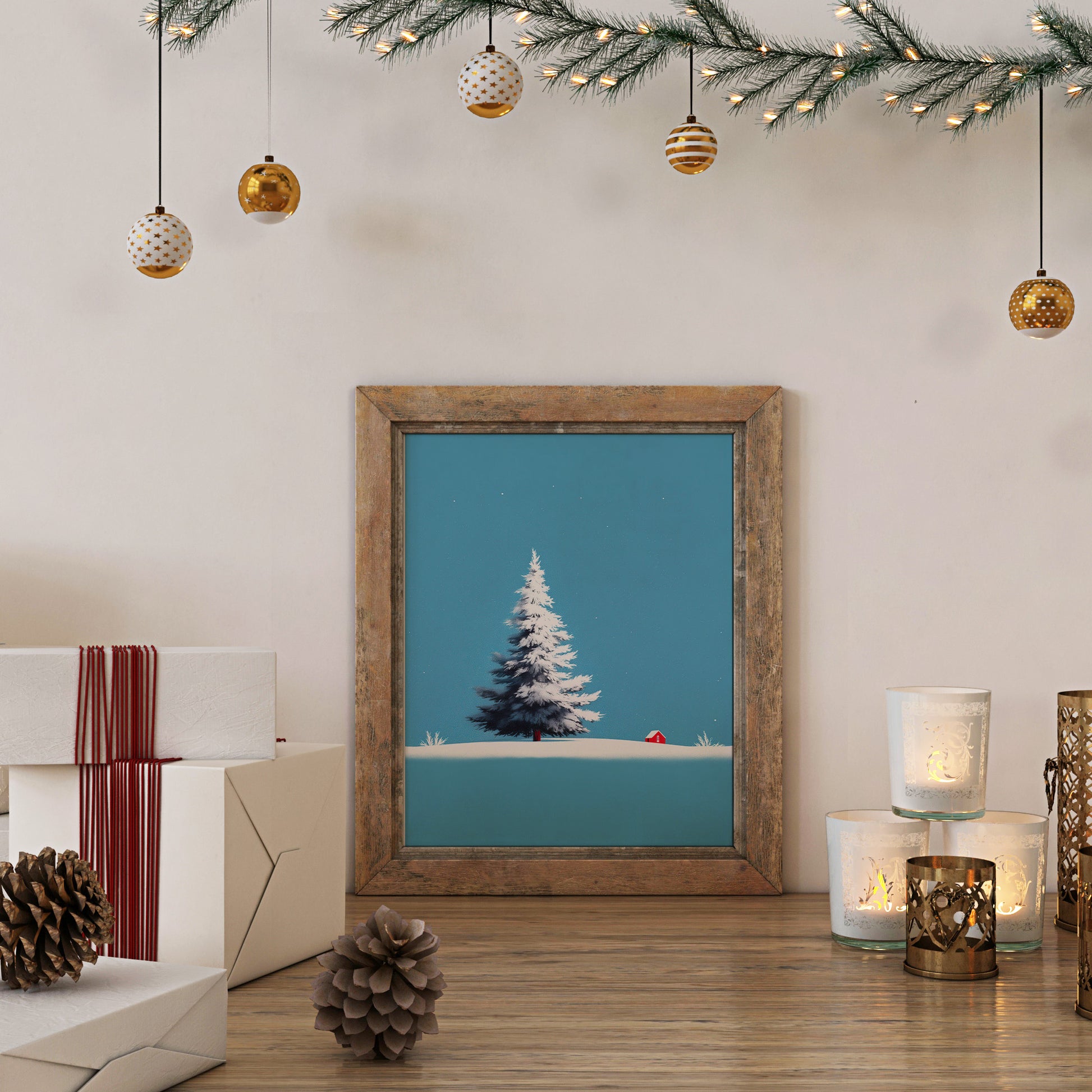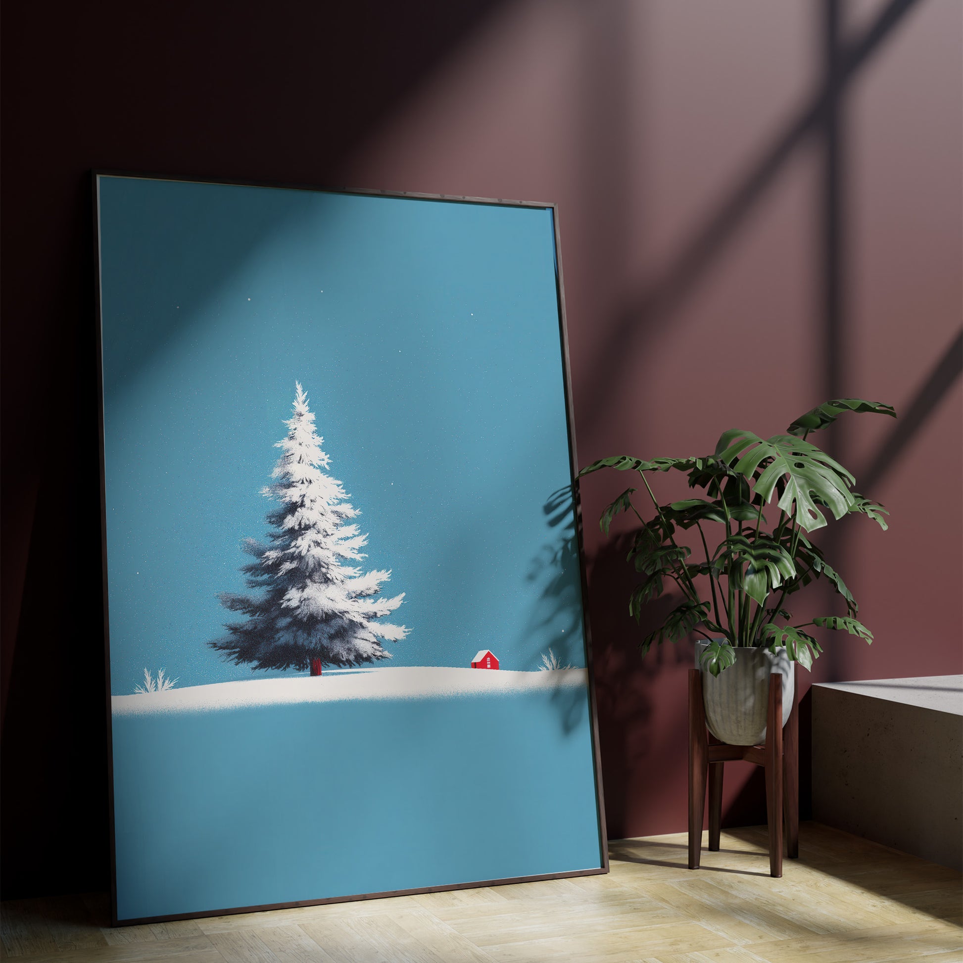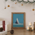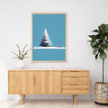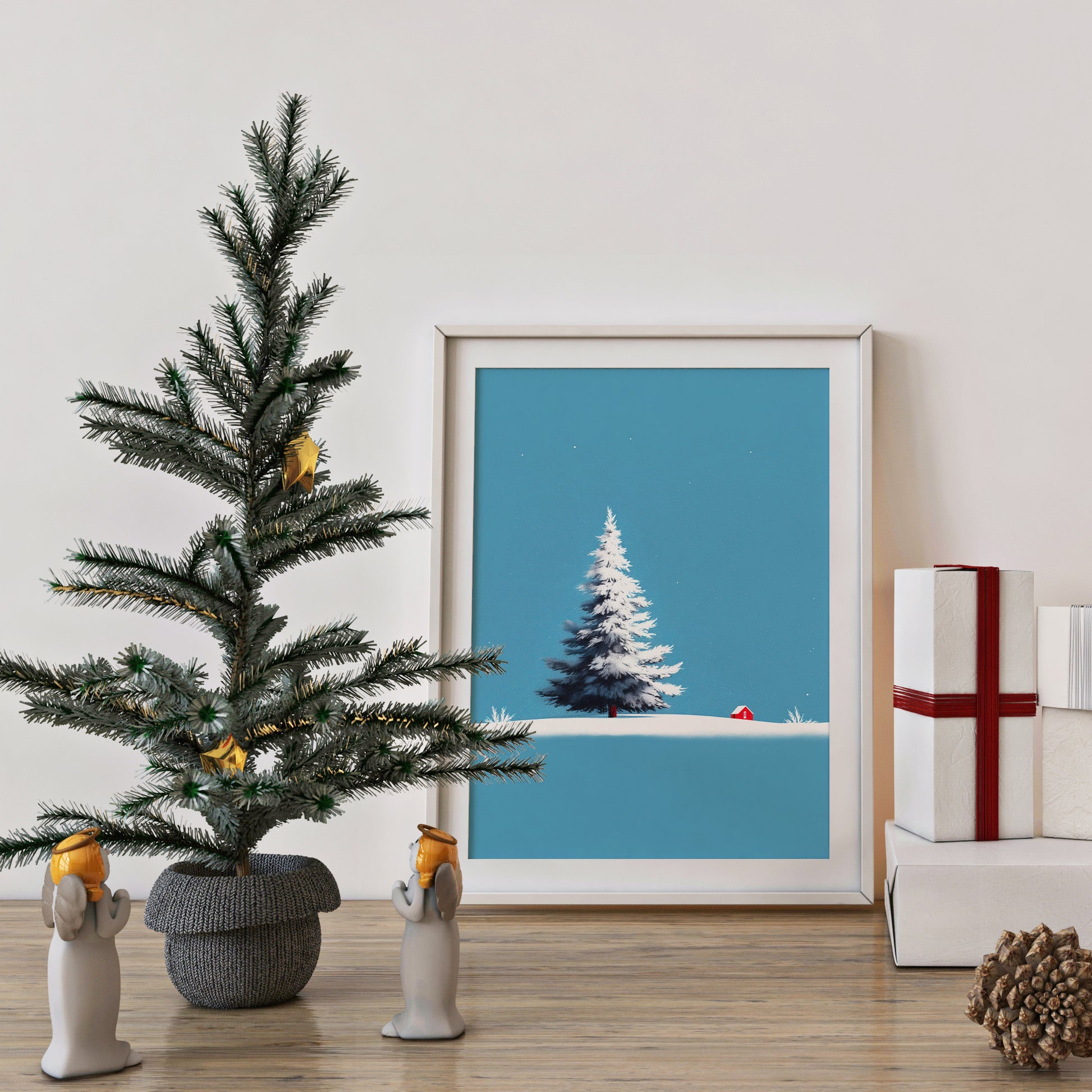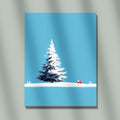 A clean, minimalist, and serene winter landscape illustration. The central focus is a large, beautifully rendered snow-covered Christmas pine tree, standing prominently on a smooth expanse of white snow. In the background, there is a tiny, bright red cabin, providing a stark color contrast and a touch of warmth against the cool setting. The backdrop is dominated by a clear, bright cyan/light blue sky, with subtle falling snowflakes, emphasizing tranquility and the simplicity of the winter season. This piece is ideal for modern holiday decor, minimalist Christmas cards, or winter-themed home staging.
