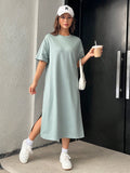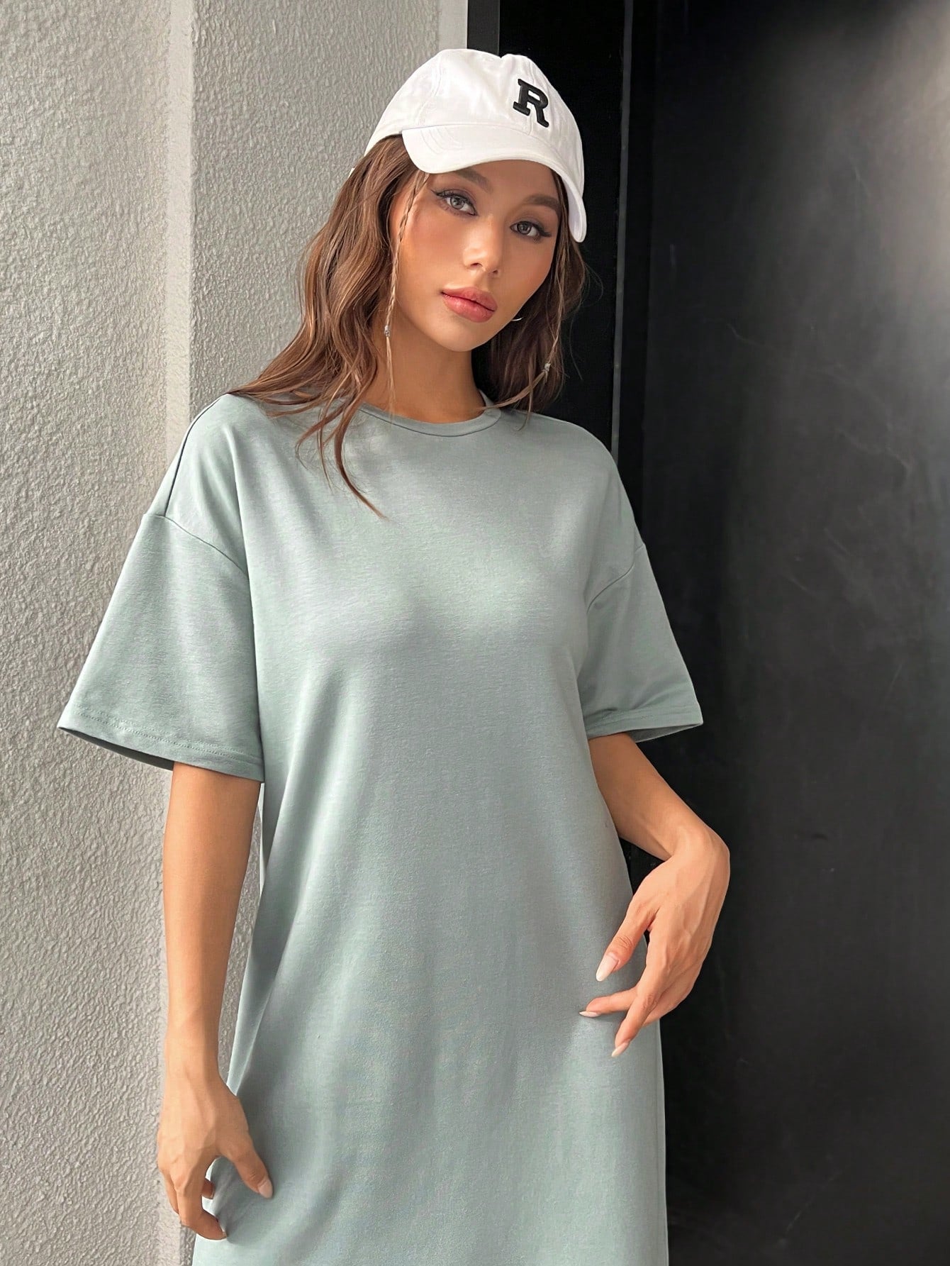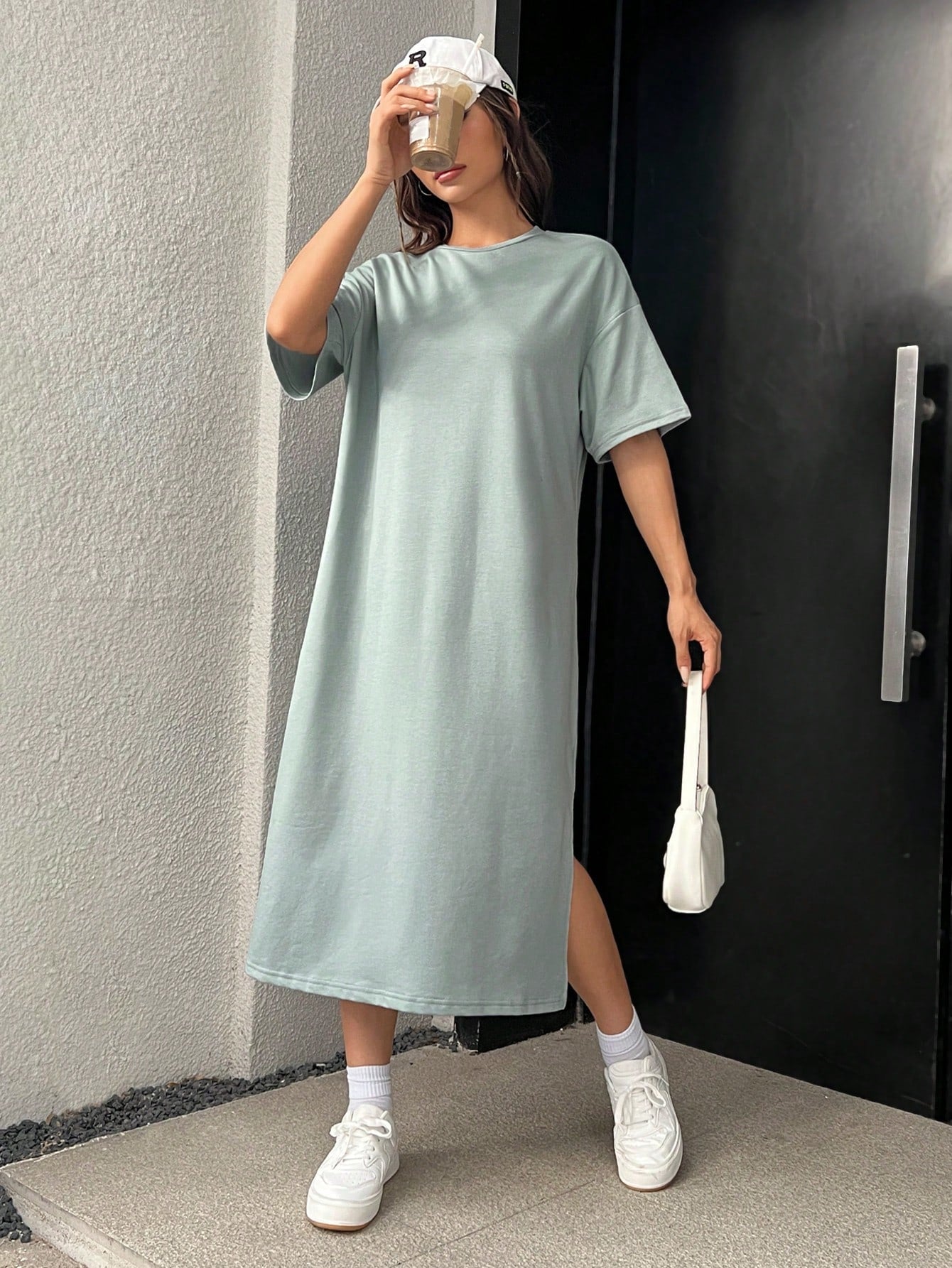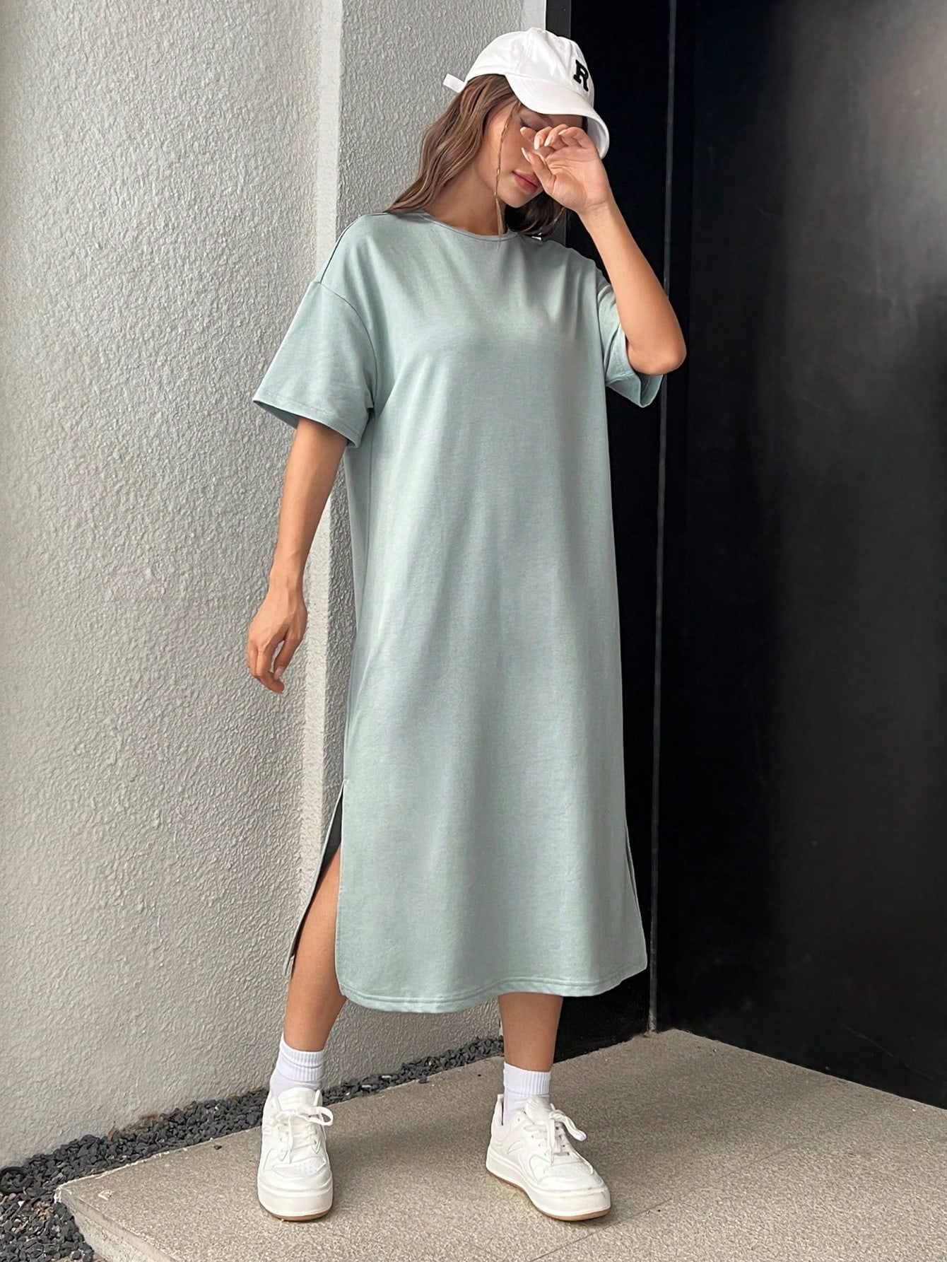Mint Green Drop Shoulder Tee Dress with Split Hem
