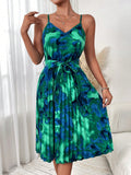 Mint Green Floral Romance: Belted Pleated Hem Dress