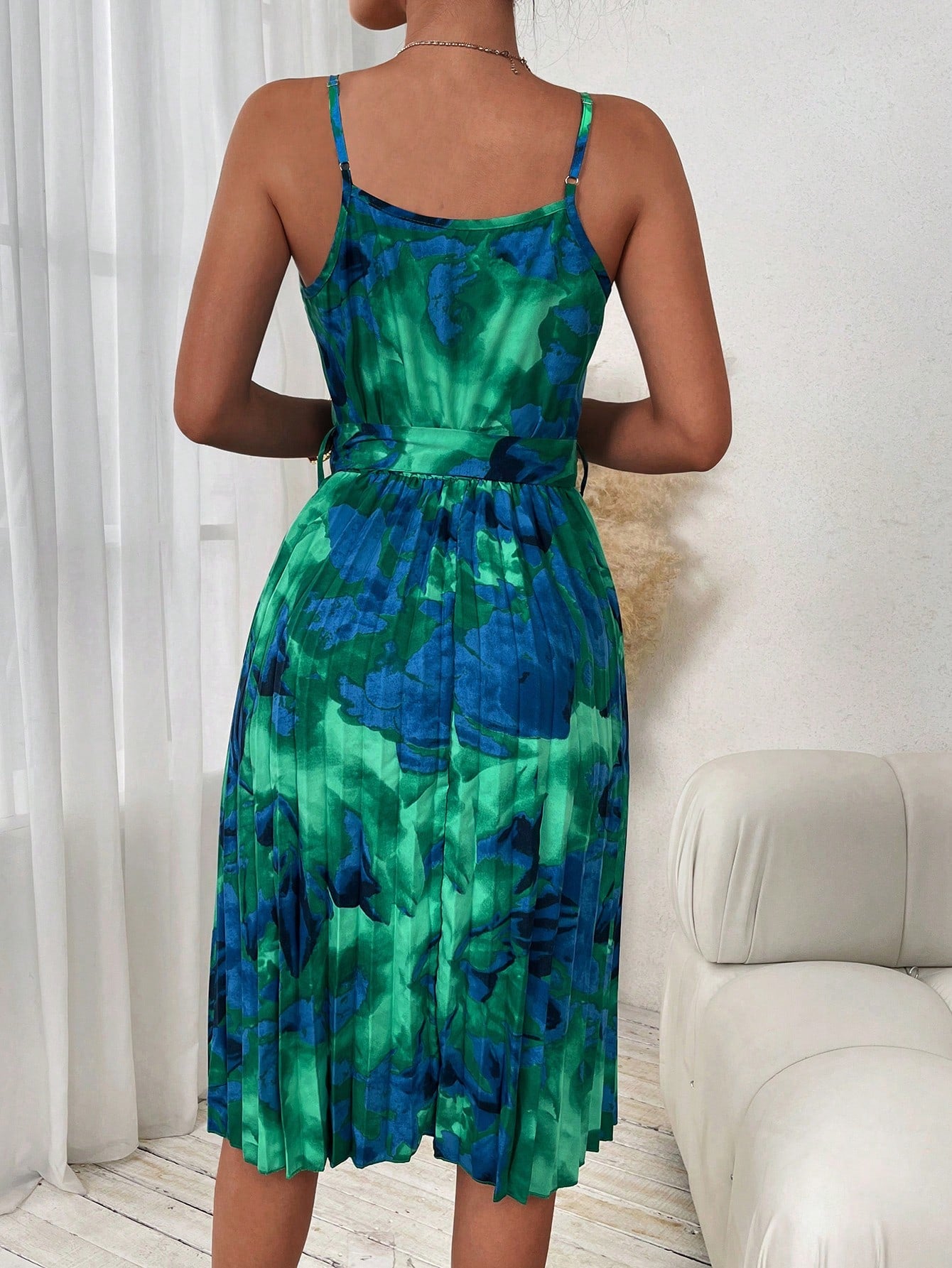 This mint green floral dress exudes a romantic feel with its pleated hem and belted waist. The delicate floral print adds a touch of femininity while the pleated design adds dimension to the silhouette. Perfect for any occasion, this dress is a must-have for any fashion-forward individual looking to make a stylish statement.