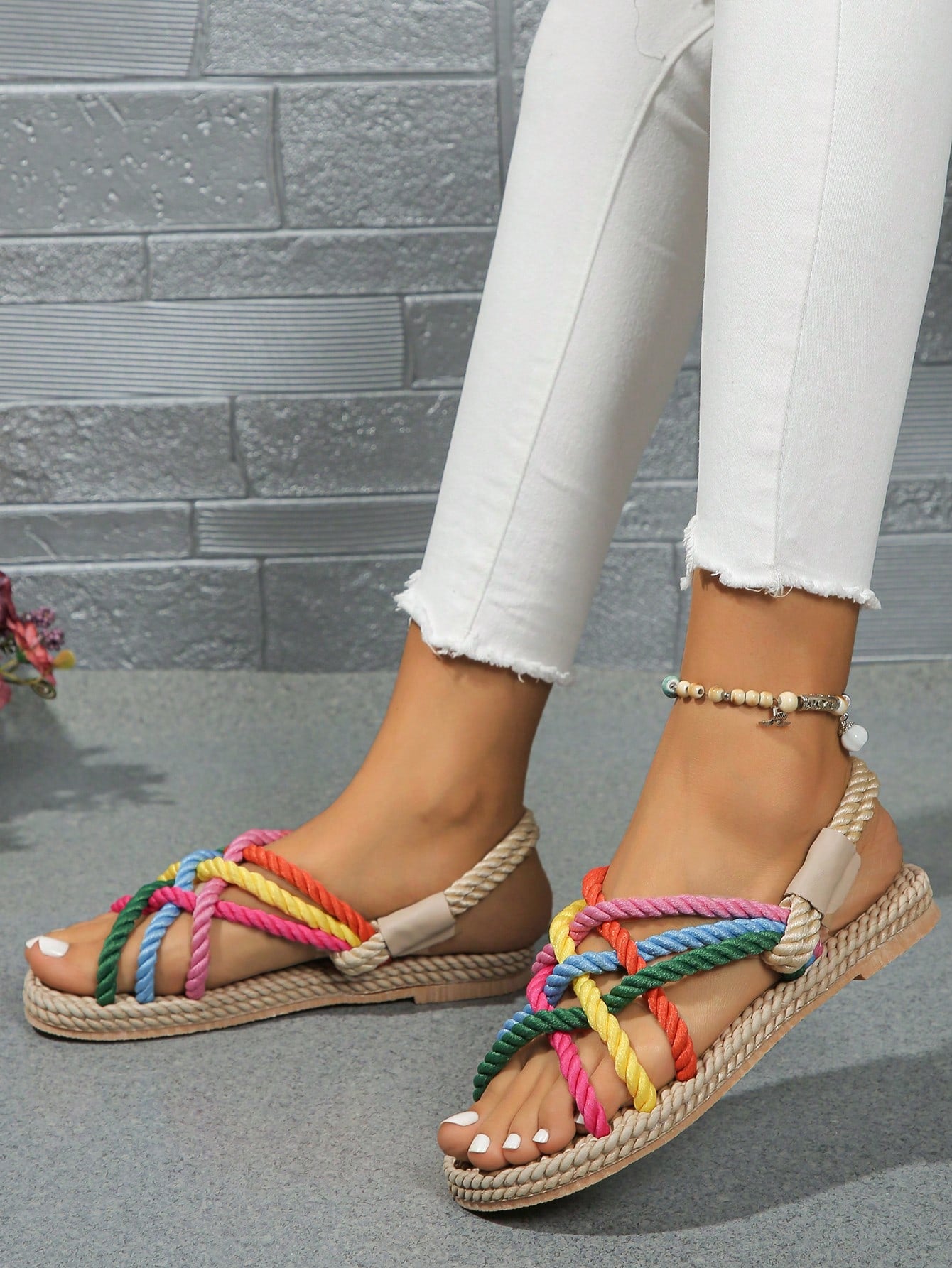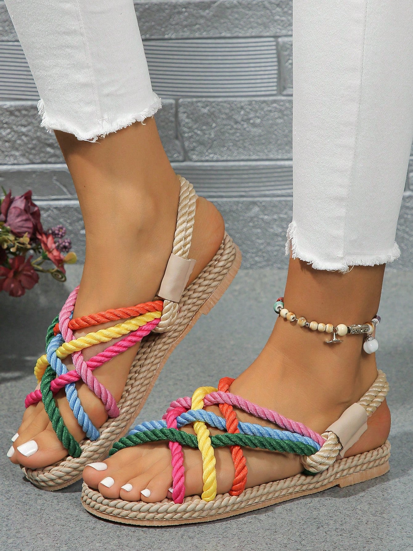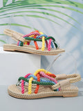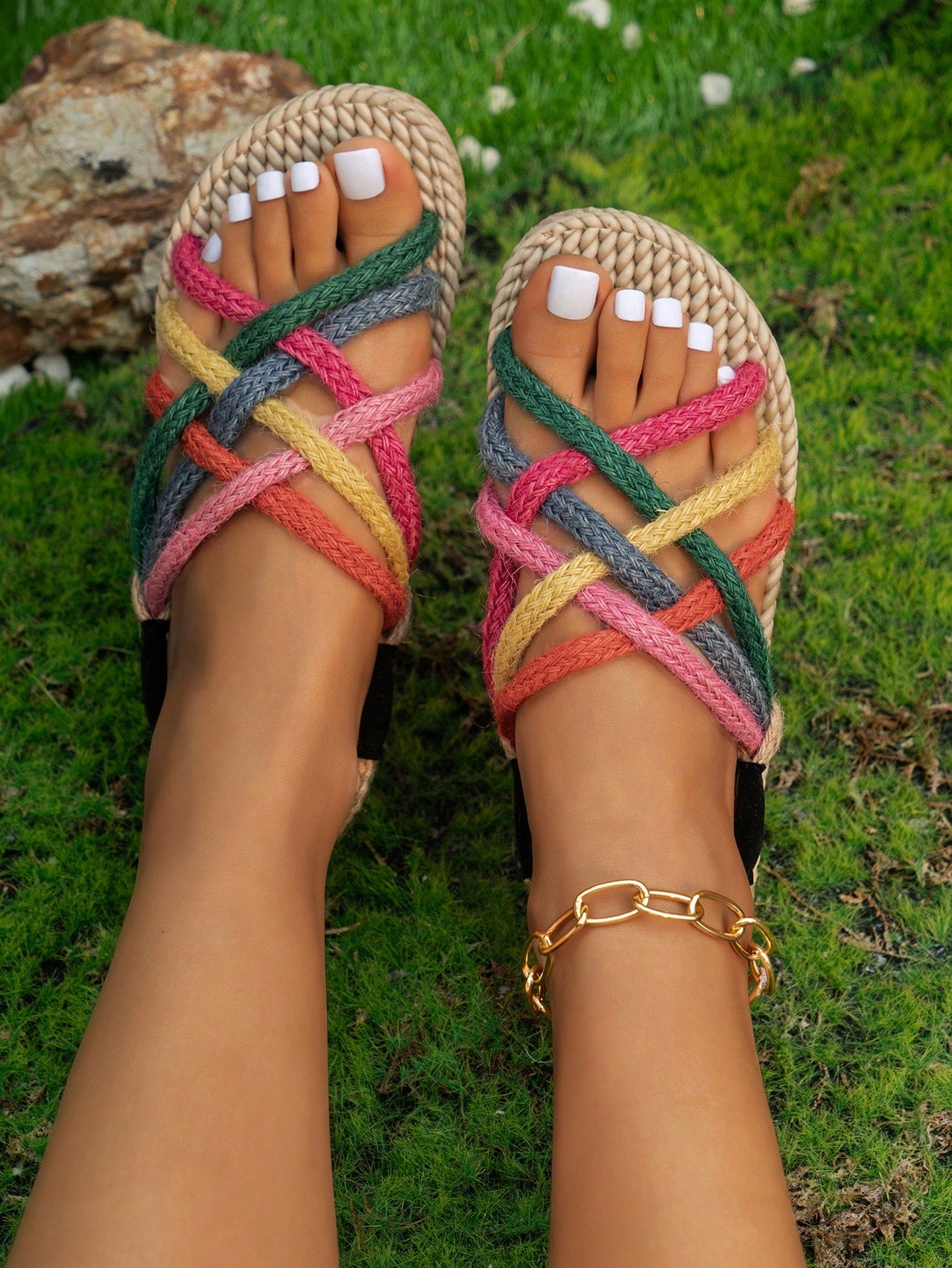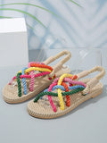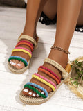 Multicolor Rainbow Flat Summer Sandals: Stylish Mule Style with Weaved Bottom for Comfort and Easy Slip-On Wrap Toe