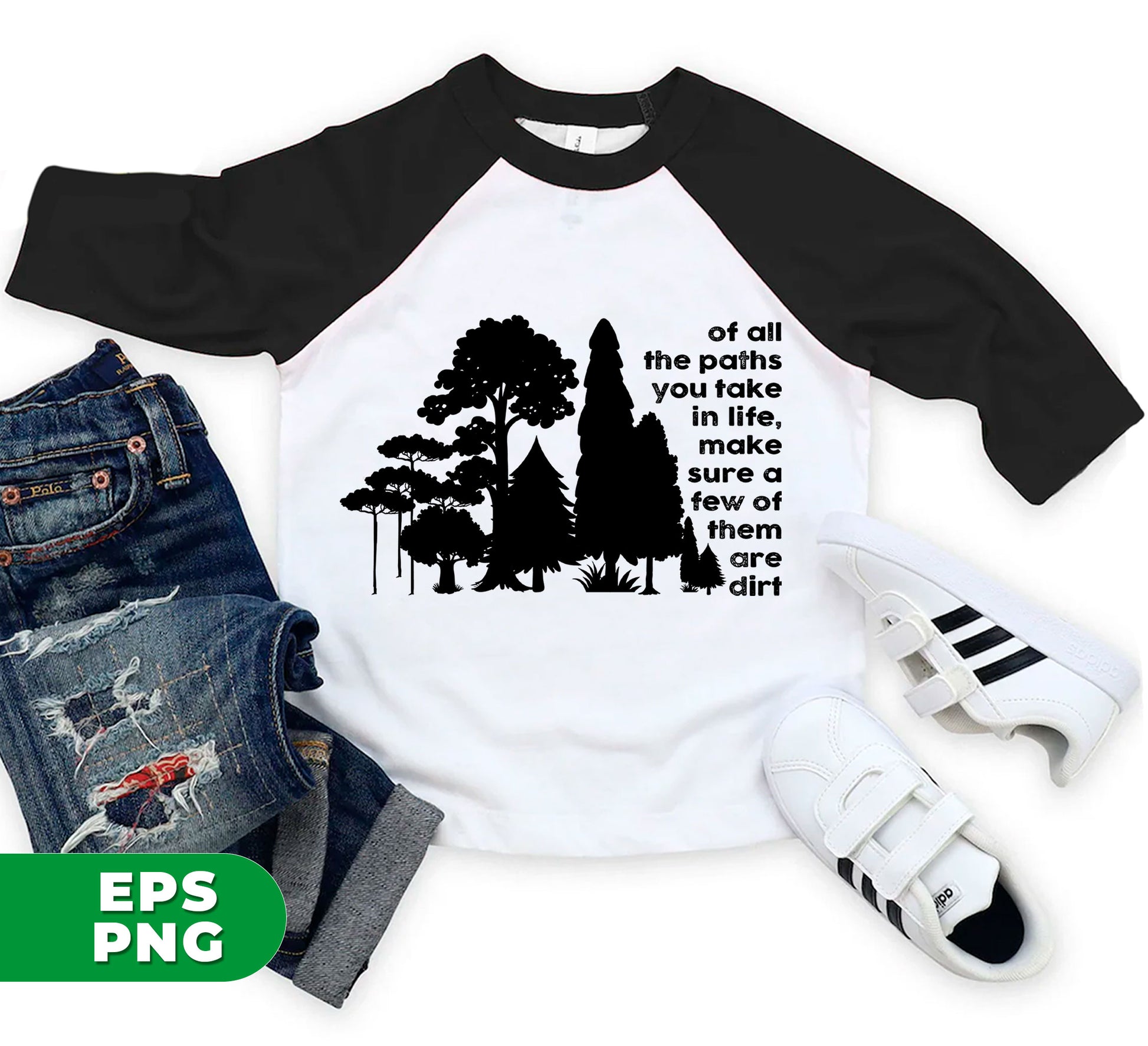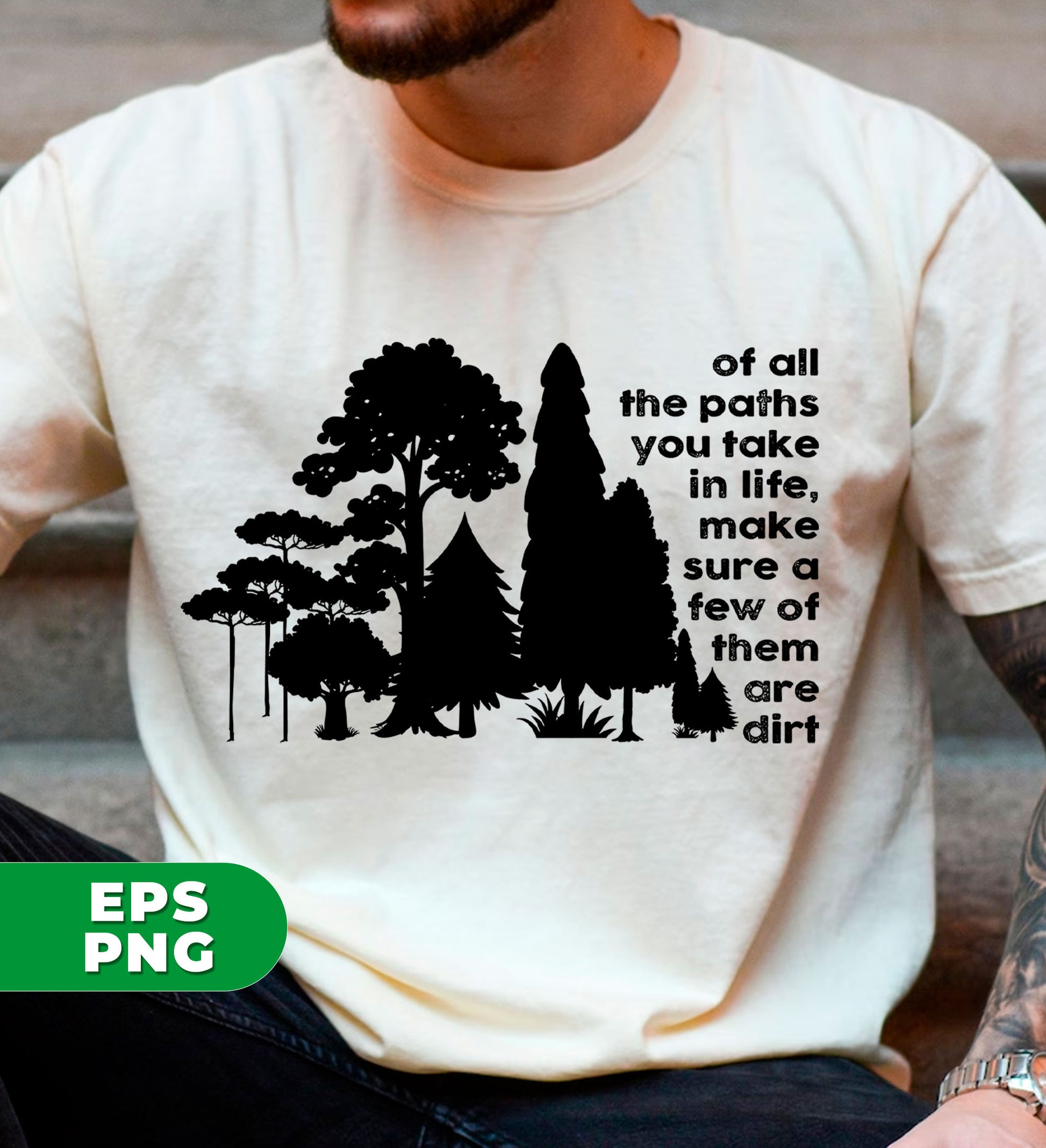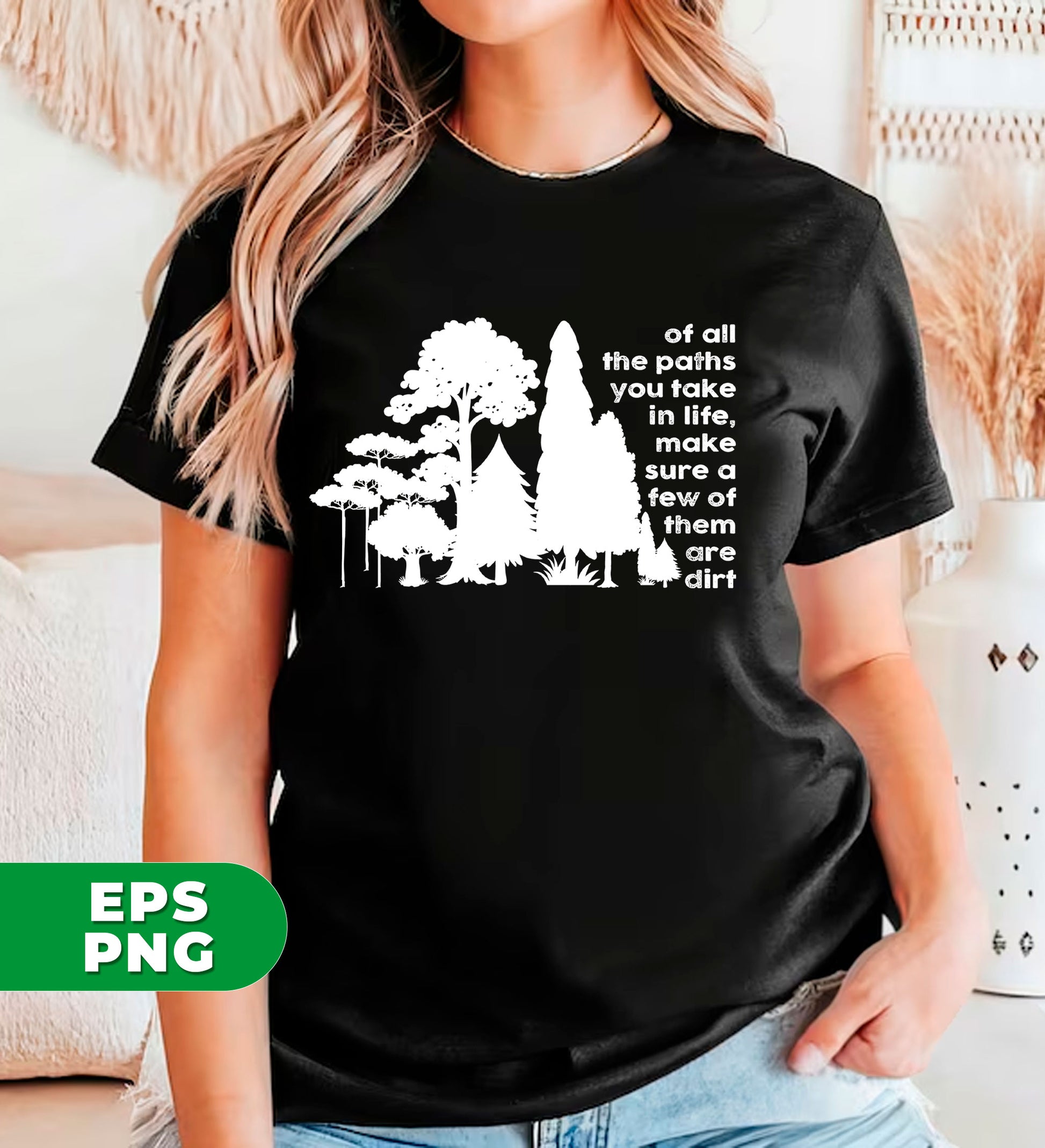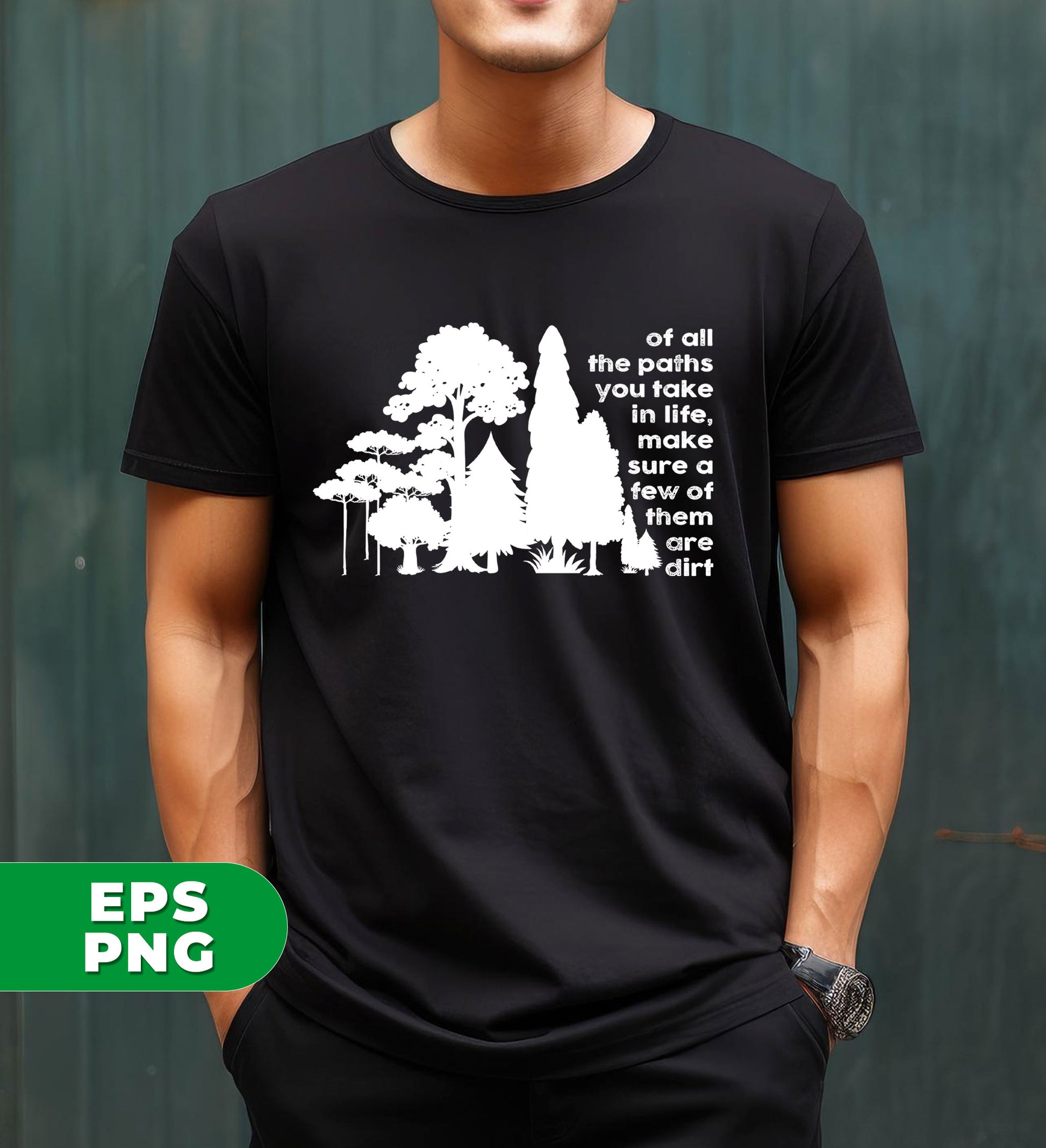 Gain perspective with this digital shirt design featuring the phrase "Of All The Paths You Take In Life, Make Sure A Few Of Them Are Dirt." Embrace the beauty of the outdoors and the lessons it teaches us. Perfect for the adventurous and nature-loving individuals.