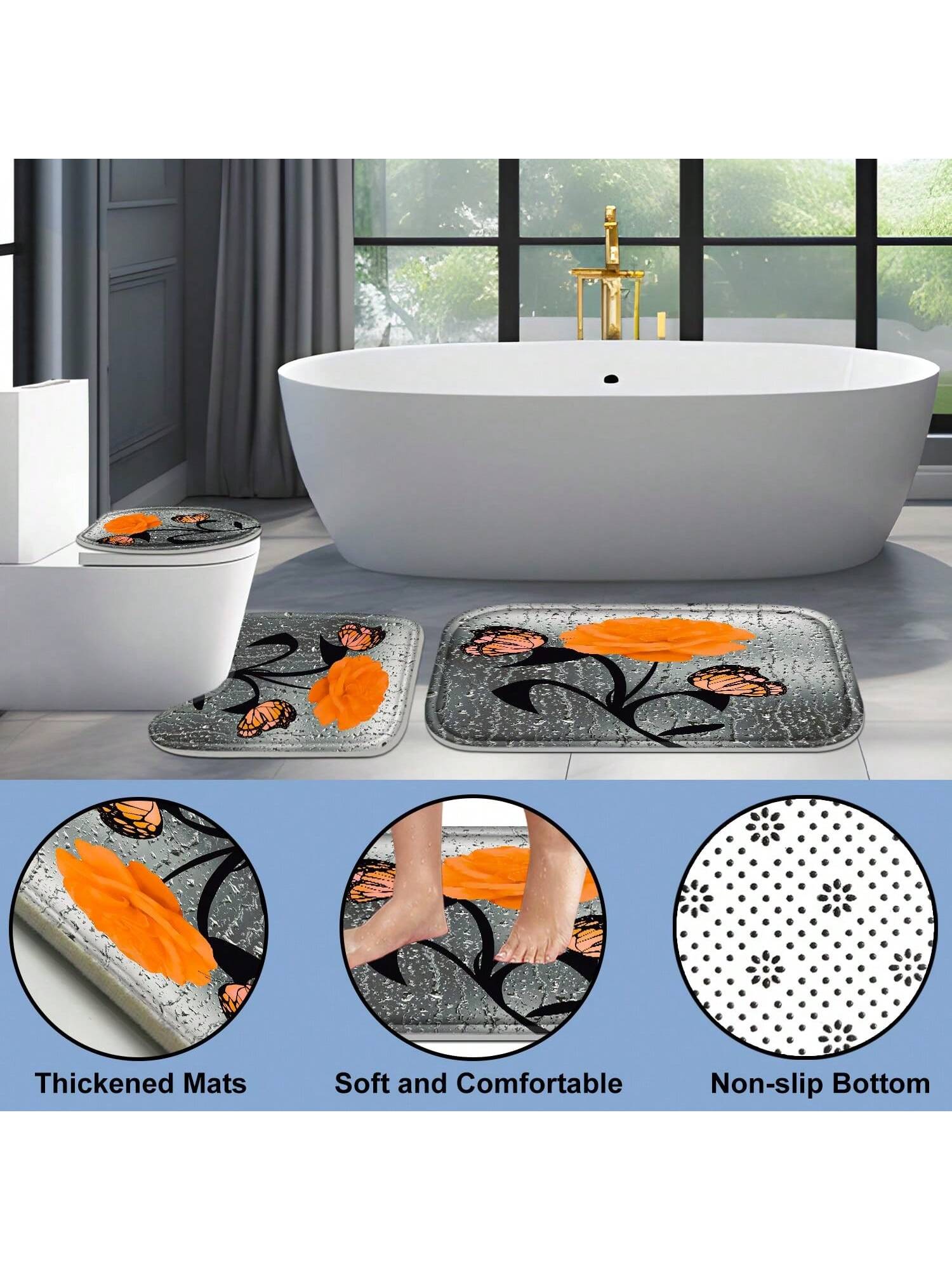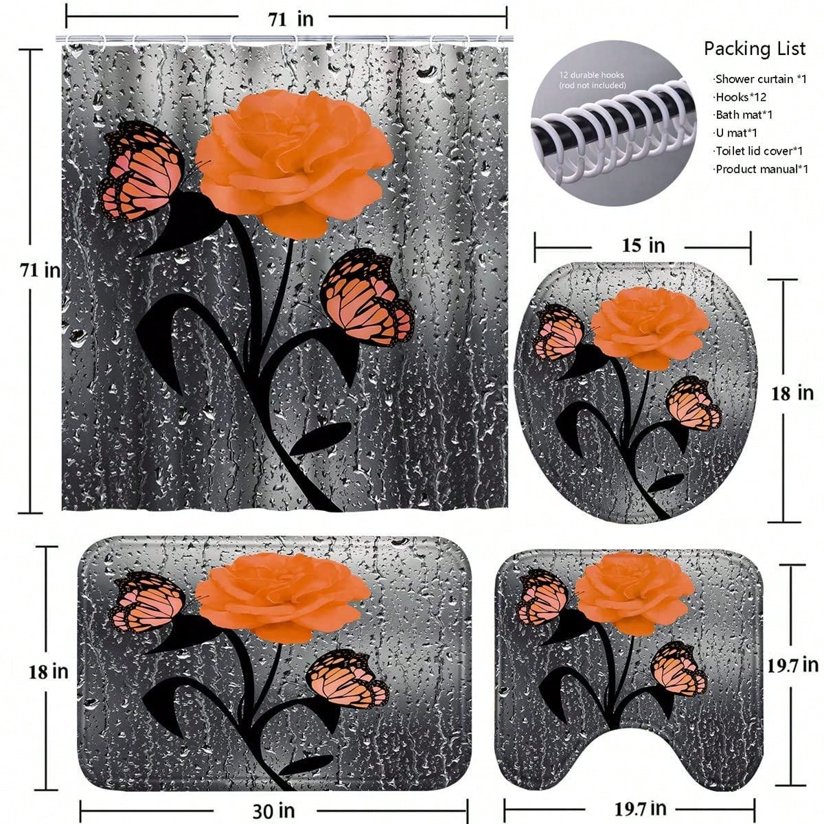 Transform your bathroom into a romantic oasis with the Orange Rose Romance 4-Piece Set. Featuring a shower curtain, rugs, bath mat, and toilet lid cover, this set adds a touch of elegance to your daily routine. Keep your floors dry and your bathroom coordinated with this beautiful set.