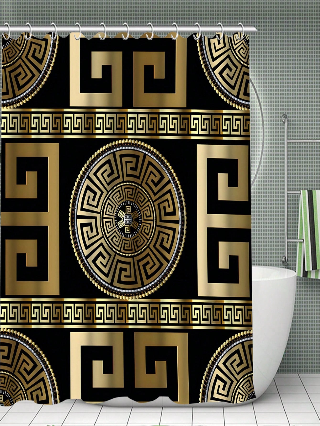 Shower Curtain and Mat Set. Made with waterproof materials and featuring a simple yet elegant pattern design, this set is perfect for adding a touch of sophistication to any bathroom. Includes 12 hooks for easy installation."