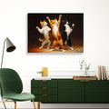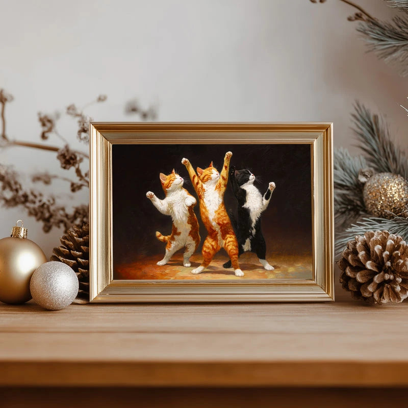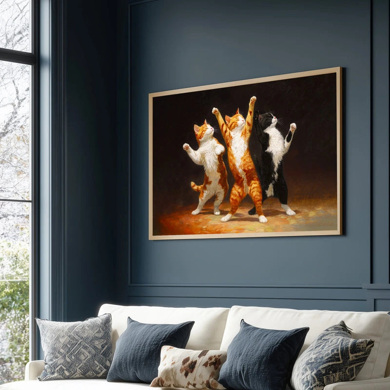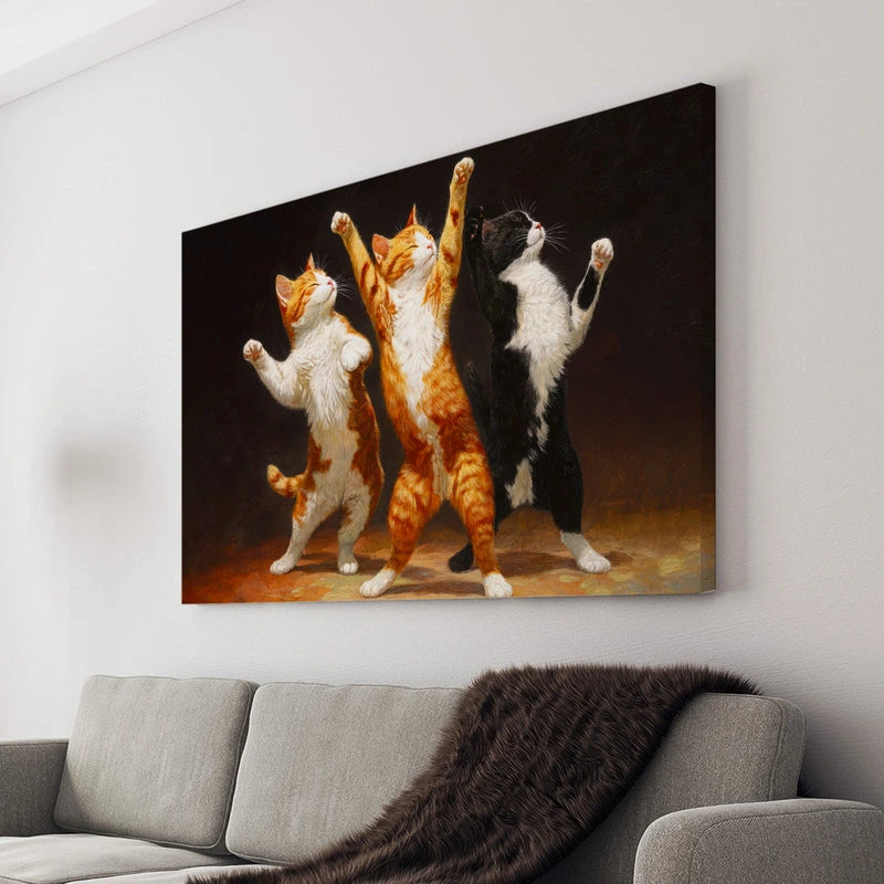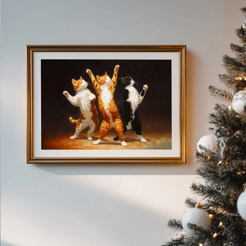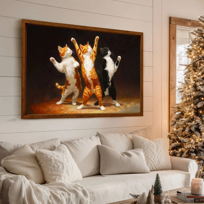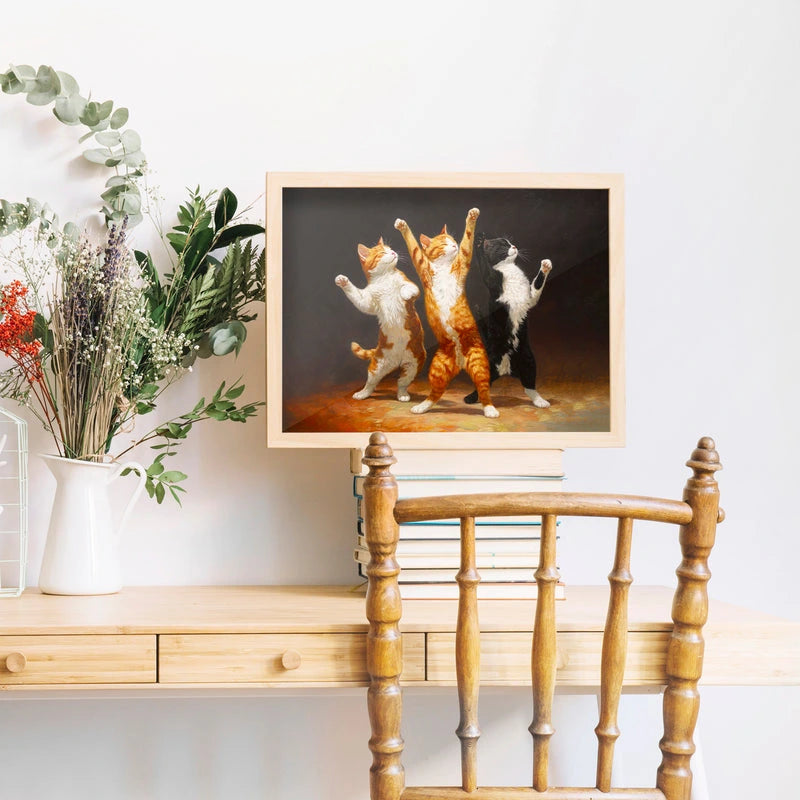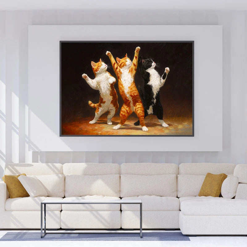 Bring whimsy to your walls with this delightful poster featuring three adorable kittens caught mid-dance, their paws raised in pure joy! Set against a moody, vintage-inspired backdrop, these charming felines create the perfect balance of playful energy and nostalgic charm. Whether you're decorating a nursery, bedroom, or creative space, this cheerful artwork adds personality and warmth to any room. A purr-fect choice for cat lovers and anyone who appreciates quirky, feel-good décor!