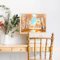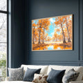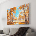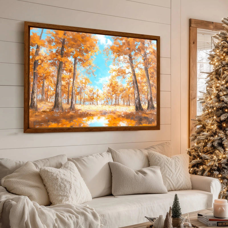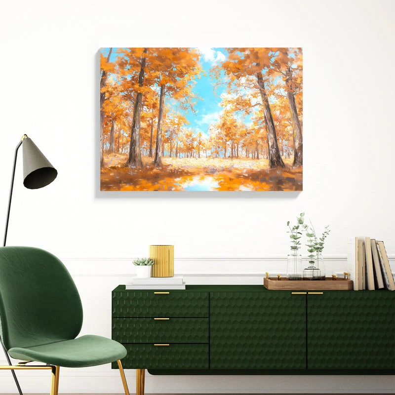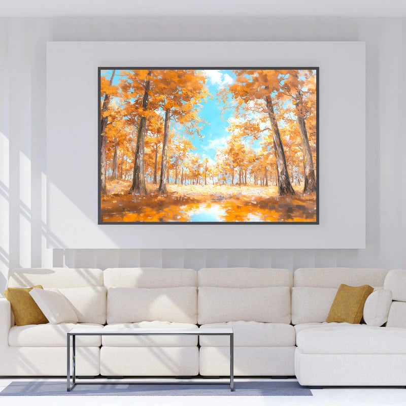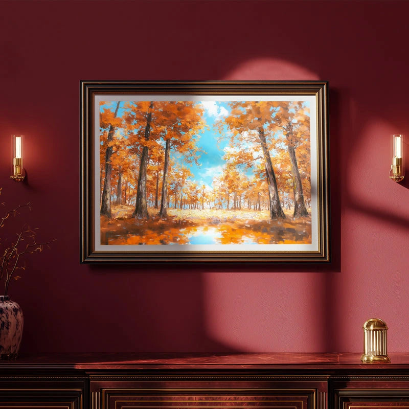 Dive into the fiery heart of fall with this stunning poster celebrating nature's most dramatic season. Bursting with bold strokes of orange and gold, this expressive oil painting captures an autumn forest in all its glory, set against a crisp, clear blue sky. Perfect for adding warmth and artistic flair to any room, this piece brings the vibrant energy of the season indoors year-round. Whether you're a nature lover or an art enthusiast, this eye-catching print transforms your space into a gallery-worthy showcase of autumn's most breathtaking moments.