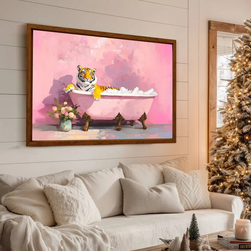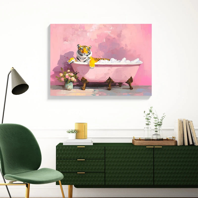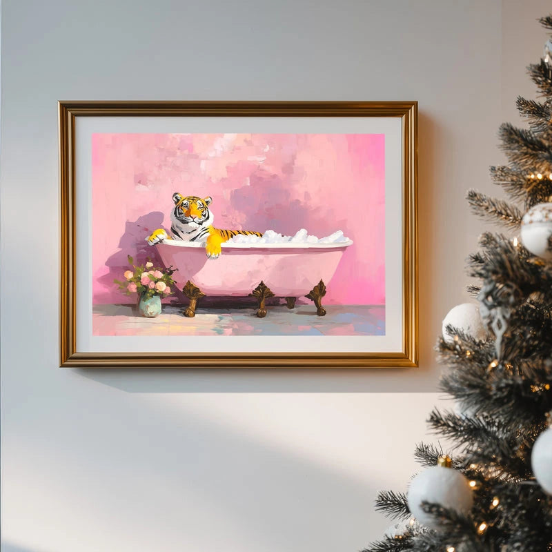 Bring a roaring dose of whimsy to your walls with this vibrant pop art poster featuring a tiger living its best life in a luxurious pink clawfoot tub, surrounded by fluffy bubbles. Perfect for adding personality and humor to bedrooms, bathrooms, or creative spaces, this playful artwork celebrates the absurd and the fabulous. With its bold colors and retro aesthetic, it's a conversation starter that proves even the wildest creatures deserve a pampered spa day. A fun, lighthearted piece that transforms any room into a gallery of good vibes.